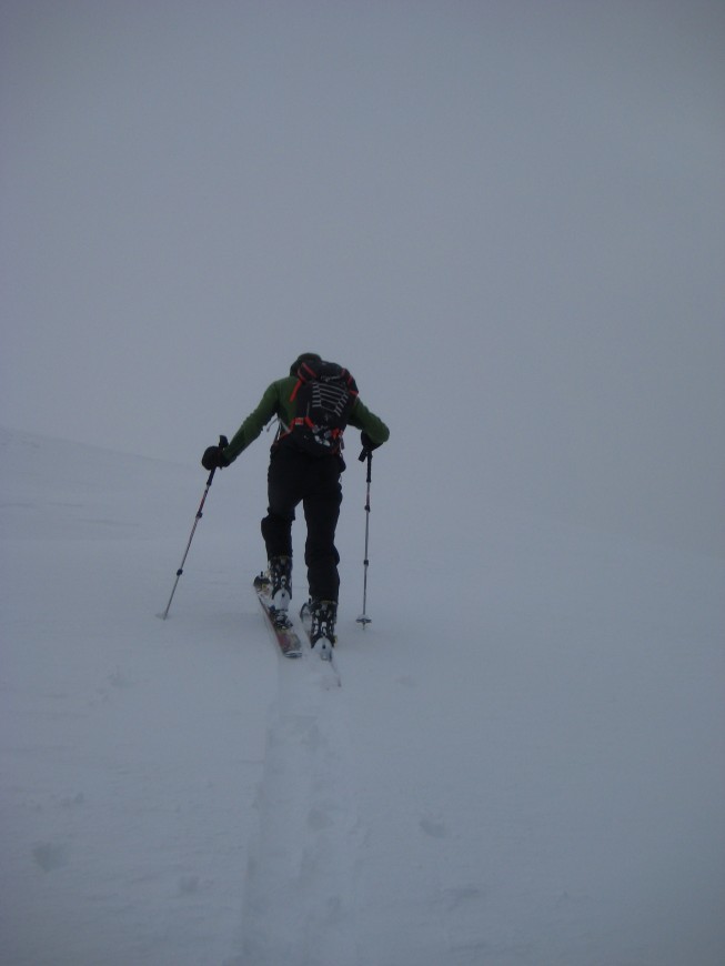 für das heutige ziel können wir direkt vom zelt aus aufsteigen. michaela geht voraus und legt eine sportlich-steile spur in den hang. die ersten paar hundert höhenmeter überwinden wir entsprechend zügig. danach wirds flacher und das wetter schitterer. weit vom angestrebten gipfel (storfjellet) entfernt kehren wir um und erklären das projekt abschlusstour für gescheitert. egal, die abfahrt ist eh wichtiger als der gipfel.