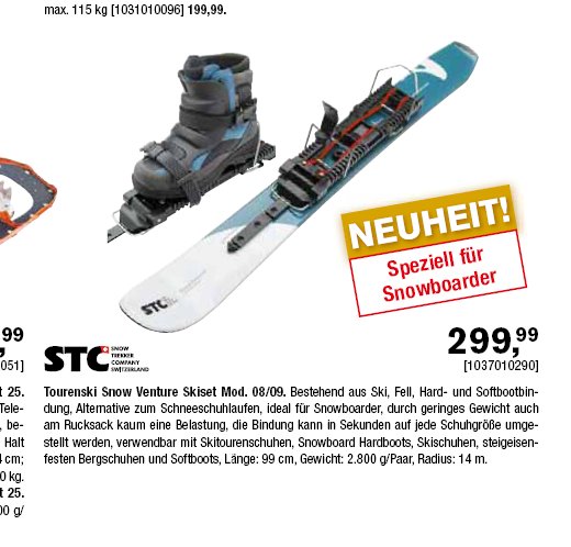 Geplant ist, Schneeschuhe oder Kurzski zuhause zu haben um einfach mal wenn ich an einem WE Bock hab ins Allgäu oder Harz zu fahren und mal ne WE-Tour durch n Schnee zu machen. Das heißt durch Wald und durch Schneehänge einfach mal Bergauf. Dabei kann es gut sein dass ich in Tiefschneebereiche komme wos mit normalen Stiefeln halt nicht mehr weitergeht.