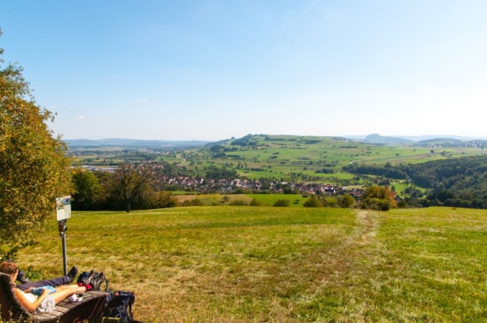 Als ich oben ankomme, geht es in den Wald. kurz drauf, als ich aus selbigem wieder rauskomme, liegt mir Tengen zu Füßen. Ein netter Rastplatz lädt zum Verweilen ein.