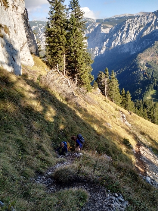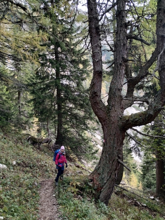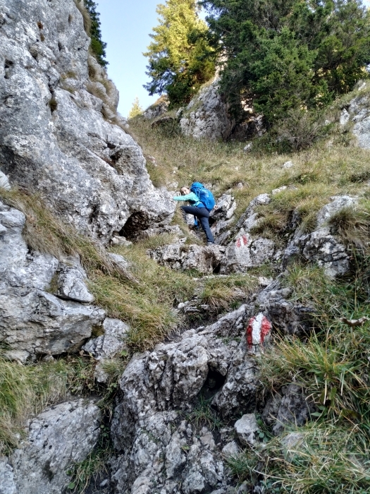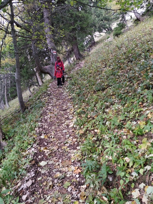 Wir starten am 17. Oktober mit dem Auto von Bernstein aus und fahren bis zum Parkplatz Preiner Gscheid. Da heute Sonntag ist, hat sich gefühlt halb Wien auf den Weg in die Rax gemacht und es ist aussichtslos, auf dem Parkplatz einen Stellplatz zu ergattern. Wir parken daraufhin zähneknirschend am Straßenrand, obwohl wir das Auto mehrere Tage stehen lassen wollen. Als wir loslaufen, ist es bereits 11 Uhr. Ein Glück haben wir es heute nicht mehr weit. Zunächst geht es mit vielen anderen Wanderern einen breiten Schotterweg bergauf. Der Weg ist langweilig und die Beine noch kalt und so fängt unsere 6-Jährige schnell zu jammern an. Wir suchen uns bald ein schönes Plätzchen fürs Mittagessen. Mein Mann hat dieses Mal aus einer Laune heraus Schmelzkäse gekauft und die Kinder sind ganz begeistert von dem ekligen Zeug, weil sie verschiedene Sorten probieren können.