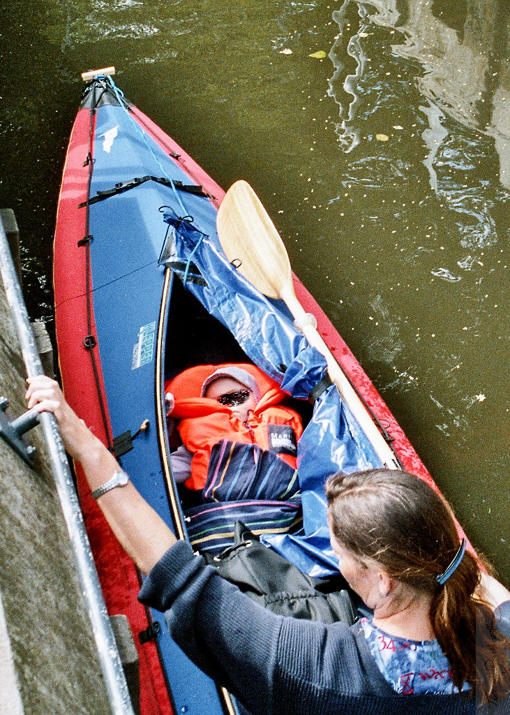 Ich staune, dass wir nicht rotieren, wenn ich an einer Seite stromauf paddle, und er auf der anderen Seite stromab. Ein wirklich guter Geradeauslauf, kann ich konstatieren. Nur unter der Brücke ist die Strömung so stark, dass ich gegen sie und den kleinen Paddler nicht mehr ankomme.