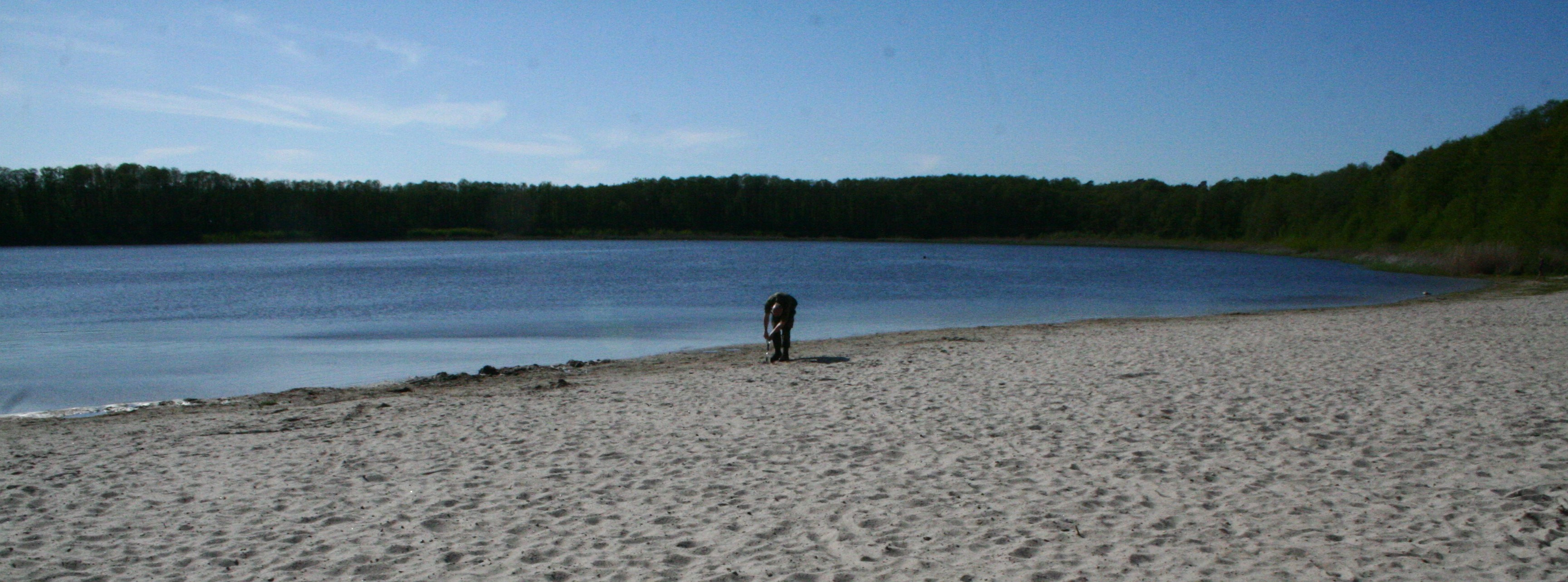 Das nächste Ziel ist jetzt der Gorinsee mit einem sehr schönen Strand und einer geschlossenen Gaststätte. Etwas nördlich davon gibt es eine Schutzhütte an einer Wegkreuzung im Wald, die ich als Übernachtungsort ins Auge gefasst habe. Den Gorinsee erreichen wir aber schon kurz nach 16 Uhr, nach sechs Stunden Wanderung, so dass wir uns jetzt hier erneut längere Zeit zur Ruhe legen und ich mit dem Wasserfilter den Vorrat auffülle.