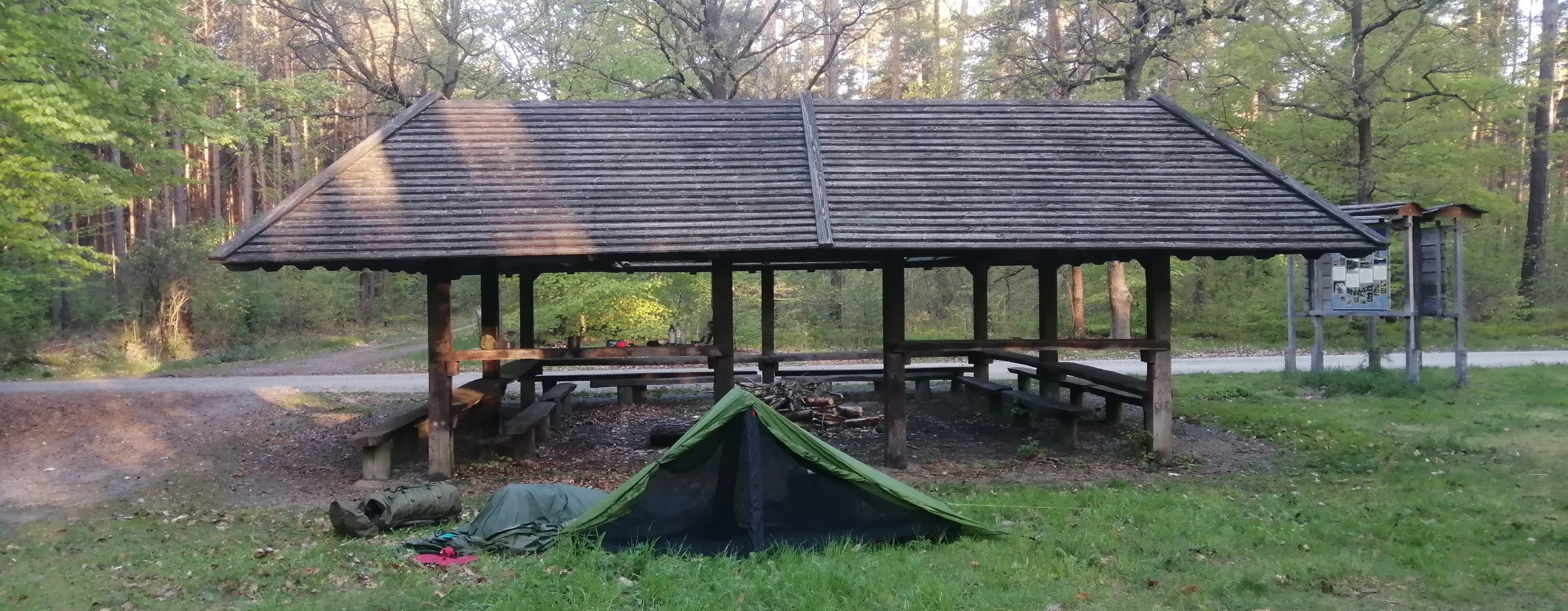 »Stunden später« gehen wir dann das letzte Stück zu der Schutzhütte. Eigentlich handelt es sich um eine große Feuerstelle mit überdachten Tischen und Bänken, die ein geschlossenes Karree bilden. Sehr aufgeräumt sieht es nicht aus, aber man kann es aushalten. Zur Not könnte man sich im überdachten Bereich schlafen legen, sonst auf der angrenzenden Grasfläche, wie wir es gemacht haben.