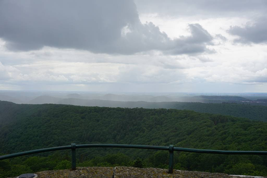 Ich folge einer recht schnell zusammengeklickten Runde, die sich teils am so gelobten Pfälzer Waldpfad orientiert. Der macht seinem Namen auch erst einmal viel Ehre, landet dann aber doch schnell auf einem Forstweg. Naja, der Wald ist auch von diesem aus hübsch anzusehen, obwohl es bald wieder anfängt zu tröpfeln. Da es recht warm ist, reicht es, den Schirm am Rucksack zu montieren und kurzärmelig weiterzugehen.