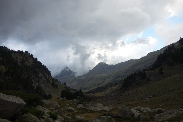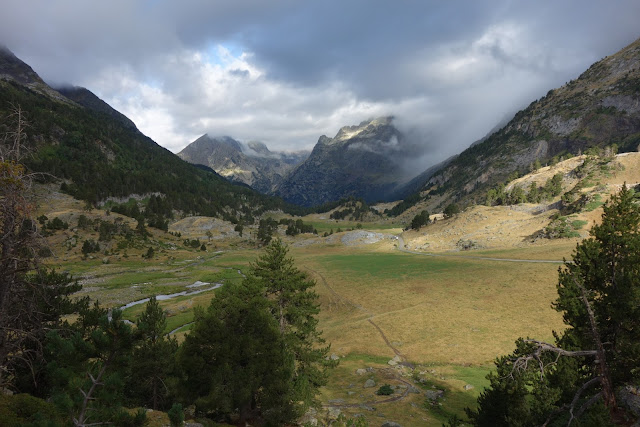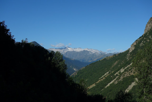 So verließ ich leichten Herzens den Ort und latschte erstmal ca. 6 Kilometer auf Schotterwegen und Straßen bis ans Ende des Val Lourden. Einen ersten Blick auf die höheren Pyrenäen habe ich versucht, in Bits festzuhalten.