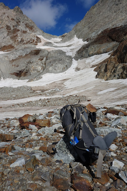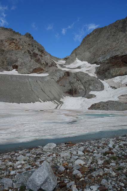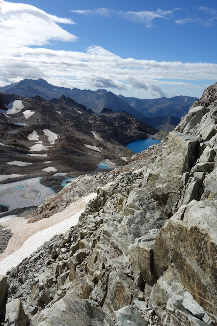 Durch Felsenlabyrinte und über Schneefelder geht es zum nächsten Col du Pluviomètre (2860m), von dem man rückwärtig einen beeindruckenden Blick auf einen Eissee hat.