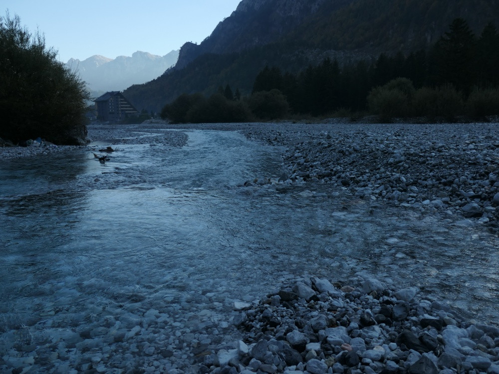 Einen Kaffee später stiegen wir ins Flussbett herunter, wo Autos bereits einen passablen Weg flachgefahren hatten. Das fast schneeweiße Gestein bildete einen schönen Kontrast zu den bunten Buchen am Ufer und dem blauen Himmel.