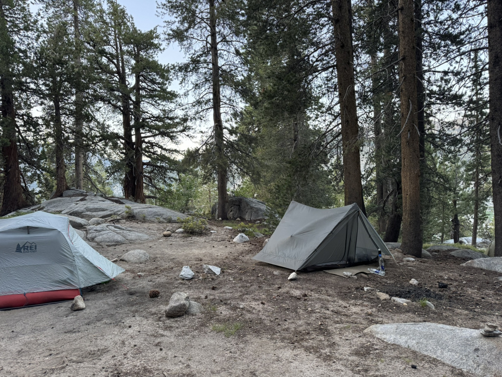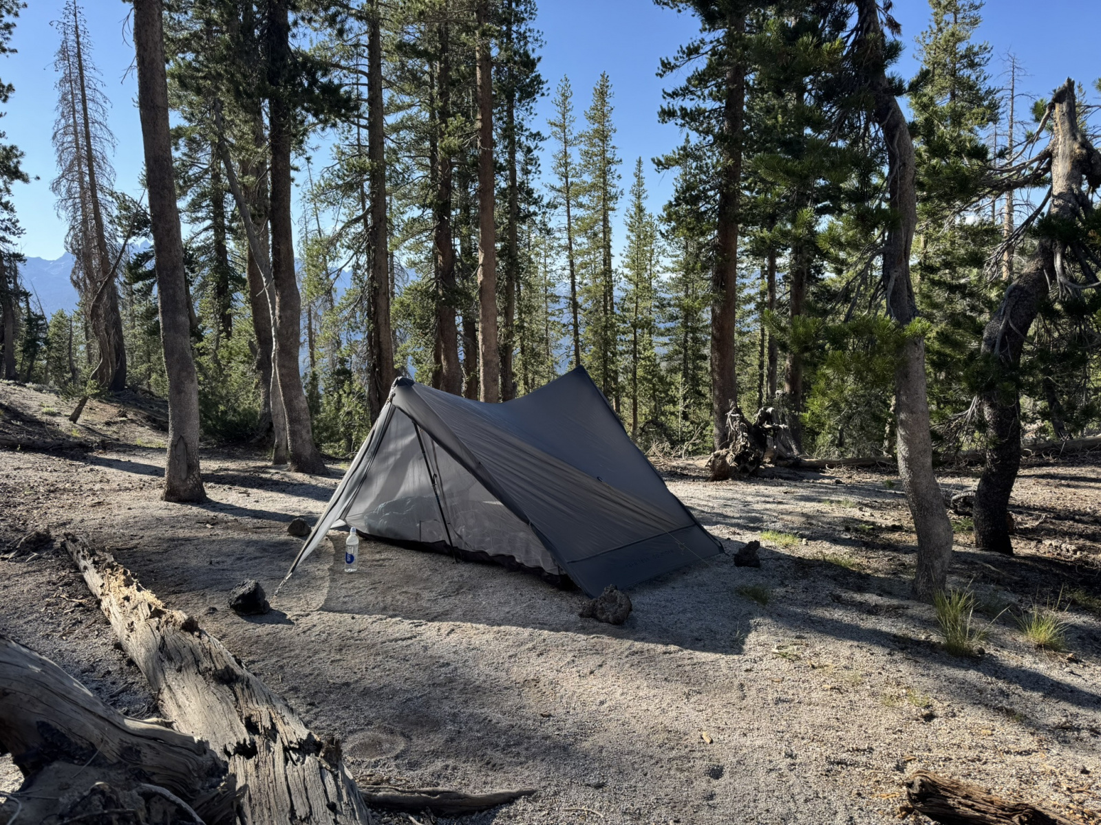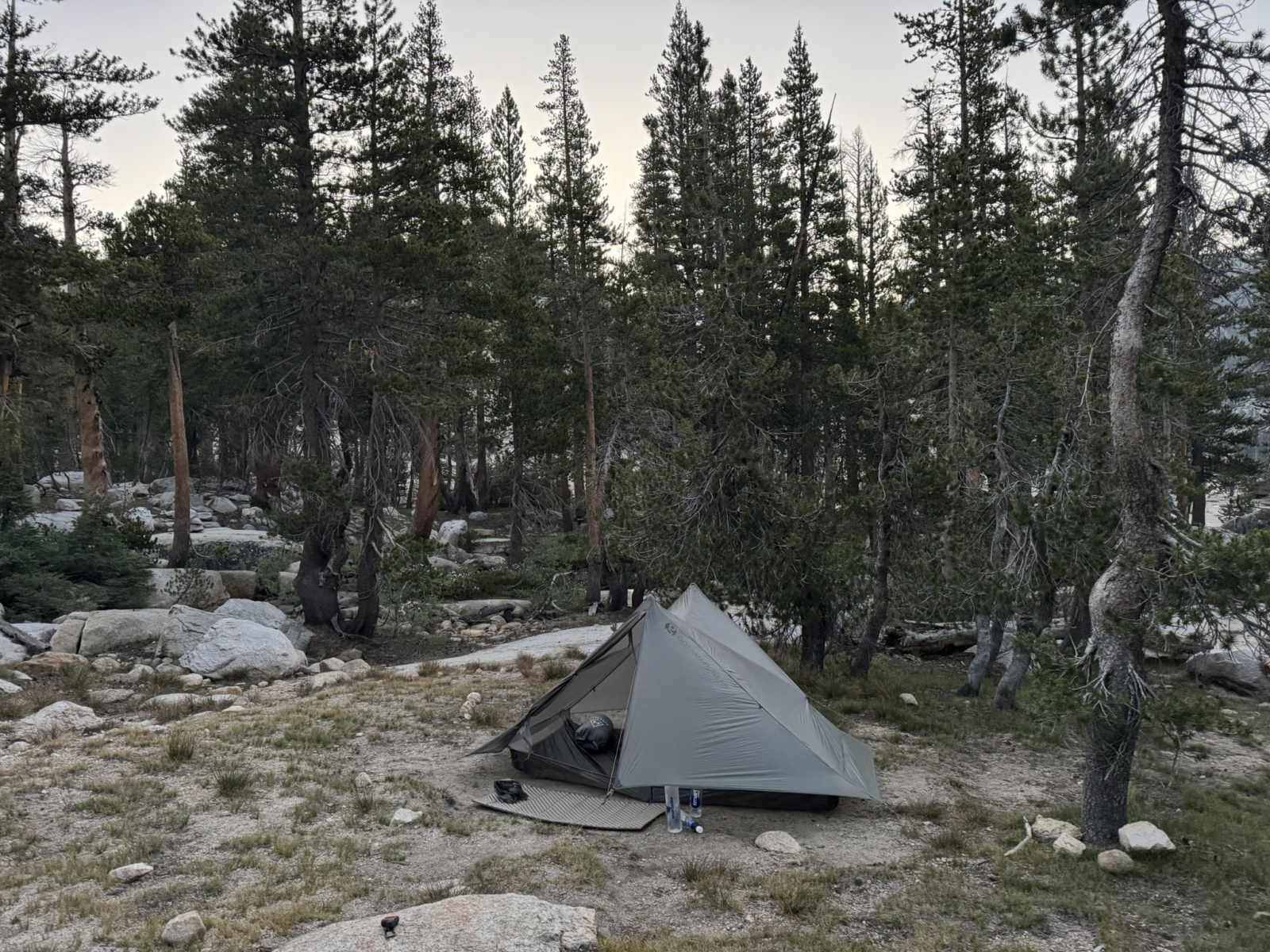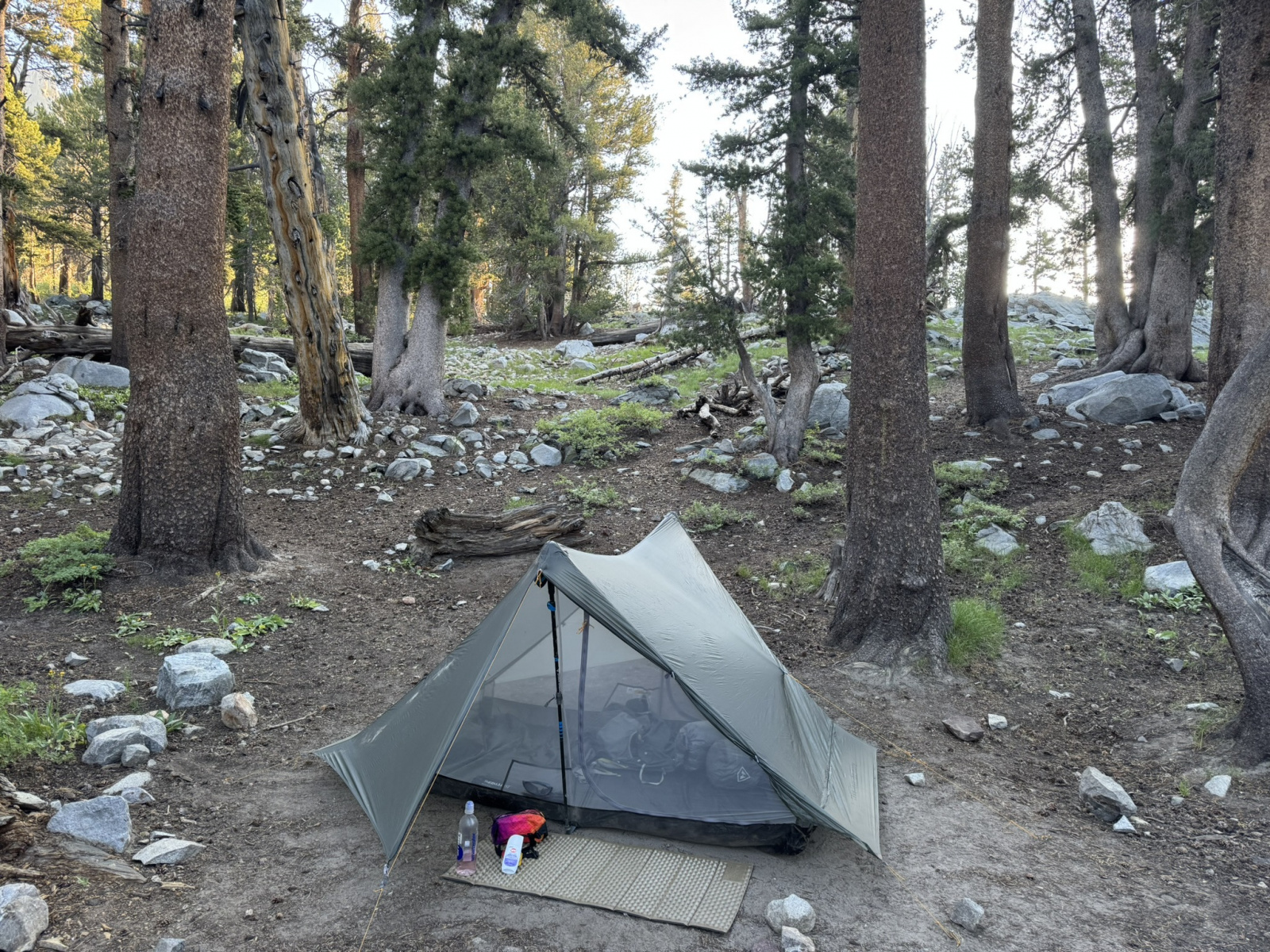 Für die Nacht finde ich ein schönes Fleckchen ein Stück den Hügel hoch, weit genug vom Wasser entfernt um den LNT-Richtlinien zu entsprechen (200 Fuß). Dann öle ich mich erst mal mit Mückenspray ein, der definitiv notwendig ist, auch wenn die Moskitos hier deutlich kleiner und weniger schmerzhaft als ihre Brüder nördlich von Tuolumne sind. Zwischendurch kommen noch drei einzelne Wanderer durch, mit denen ich etwas plausche.