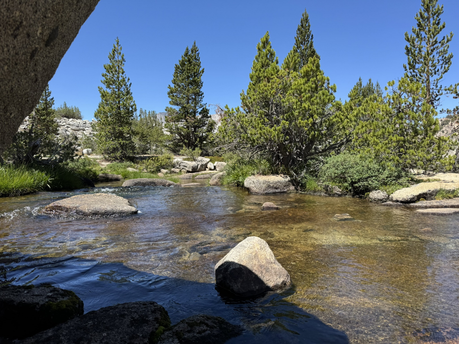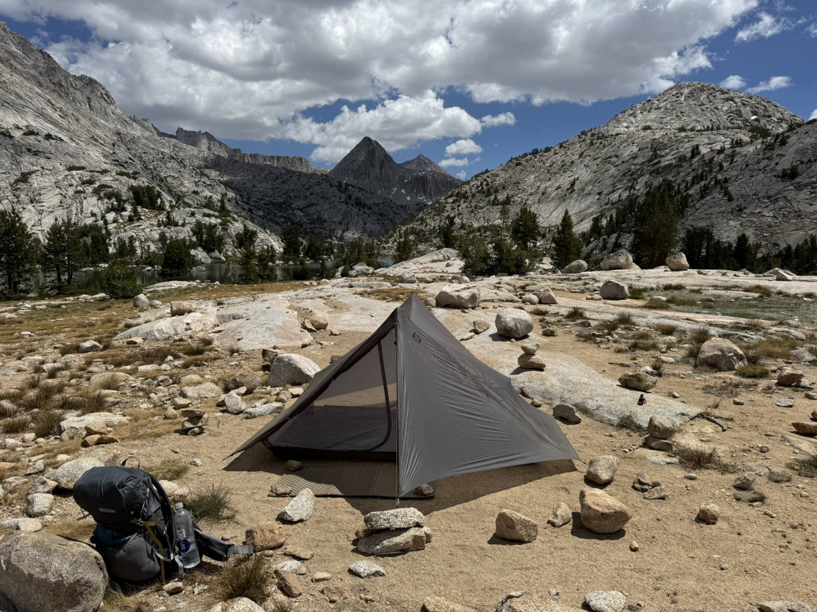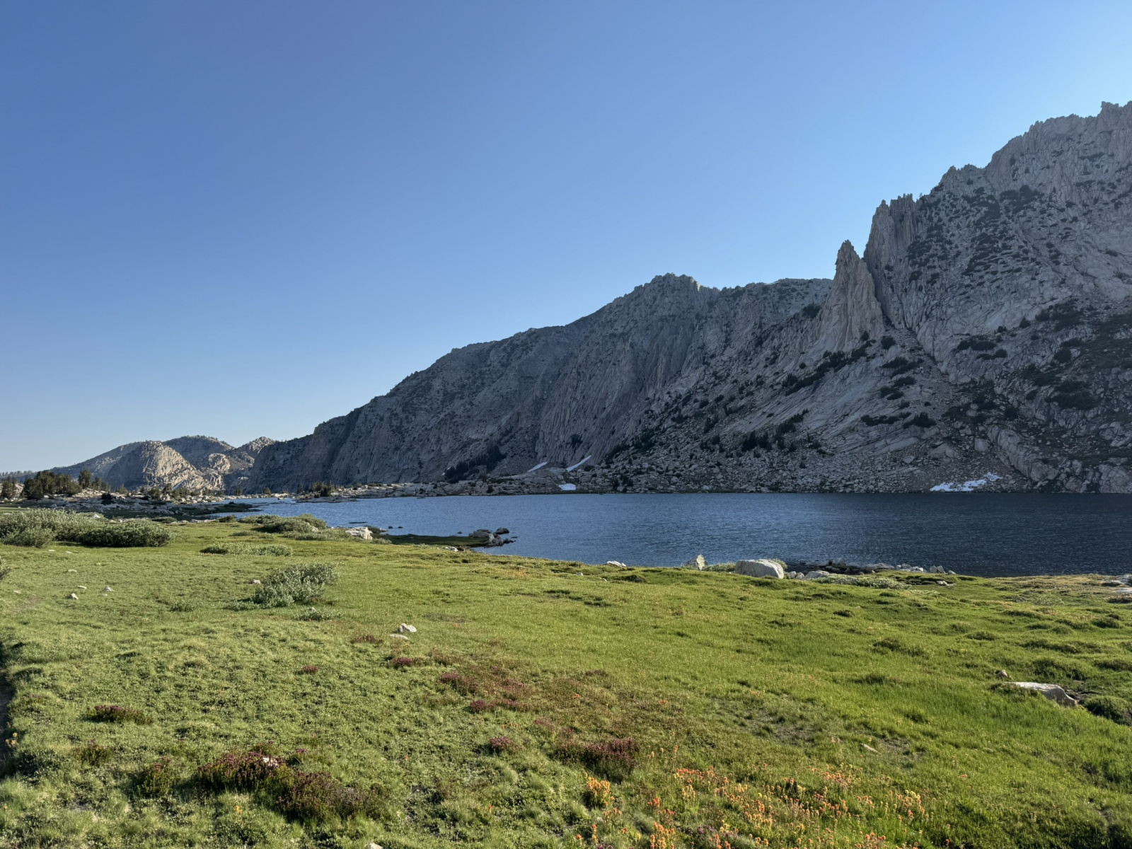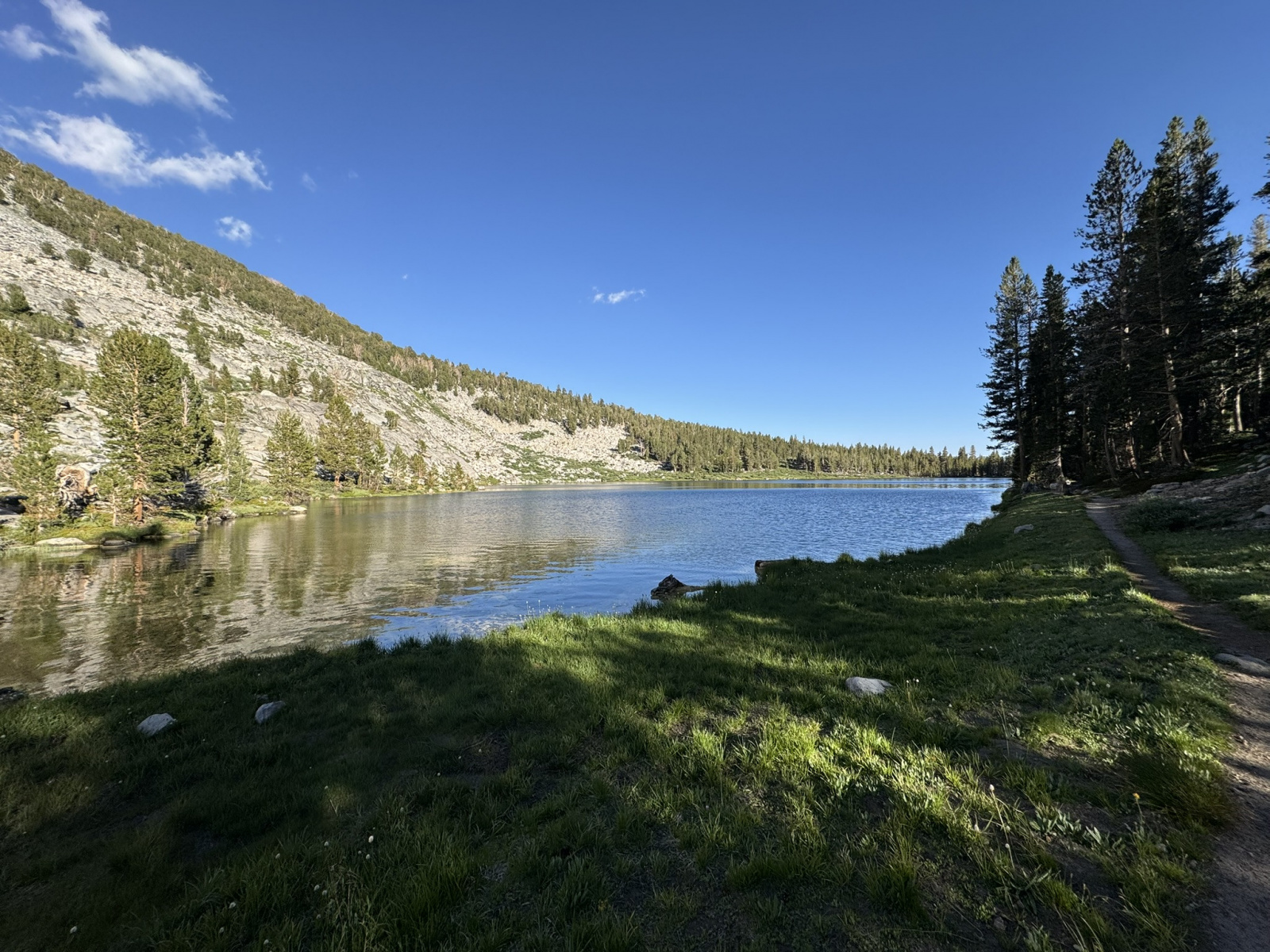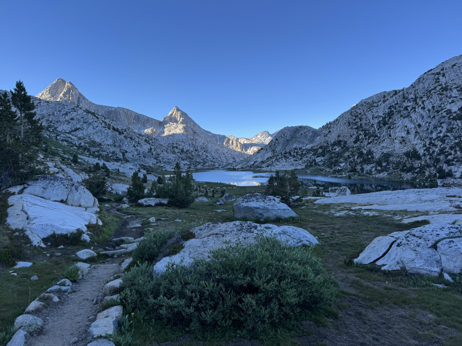 Für die Nacht finde ich ein schönes Fleckchen ein Stück den Hügel hoch, weit genug vom Wasser entfernt um den LNT-Richtlinien zu entsprechen (200 Fuß). Dann öle ich mich erst mal mit Mückenspray ein, der definitiv notwendig ist, auch wenn die Moskitos hier deutlich kleiner und weniger schmerzhaft als ihre Brüder nördlich von Tuolumne sind. Zwischendurch kommen noch drei einzelne Wanderer durch, mit denen ich etwas plausche.
