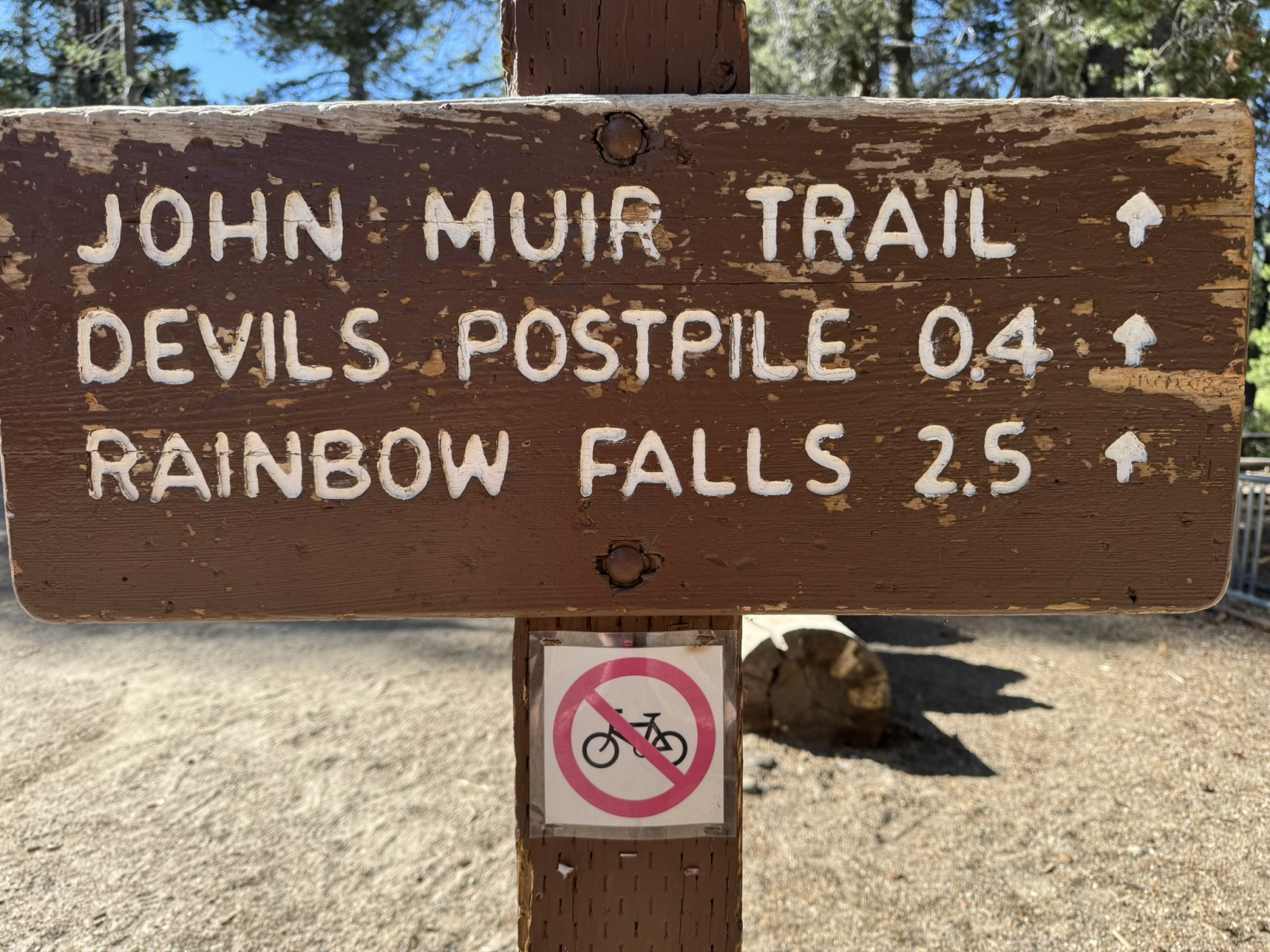Der Bus ist überwiegend mit Tagstouristen besetzt, nur im hinteren Teil sind noch ein paar andere Wanderer. Deren Rucksäcke sind riesig, vermutlich ist da aber auch einiges an Kletterzeug drin. An der Ranger Station bei Devil's Postpile fülle ich noch meine Flaschen voll, dann geht es los durch lichten Nadelwald. Obwohl ich auf 2300m bin, hat es mittags über 30°C. Entsprechend warm ist es, und die Luftfeuchtigen von den umgebenen Bächen hilft nicht beim Abkühlen.