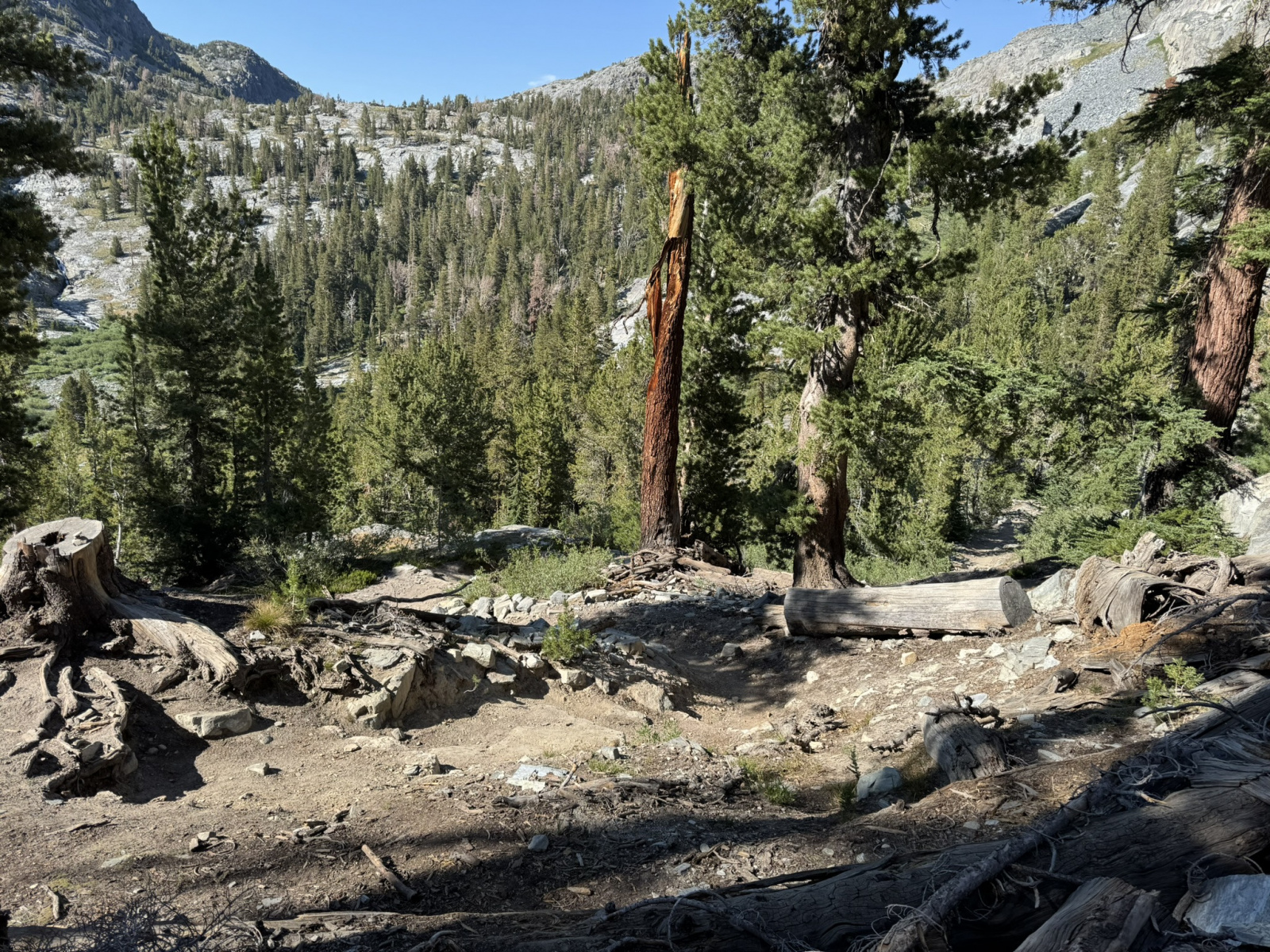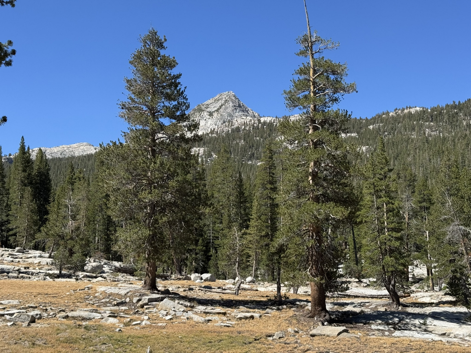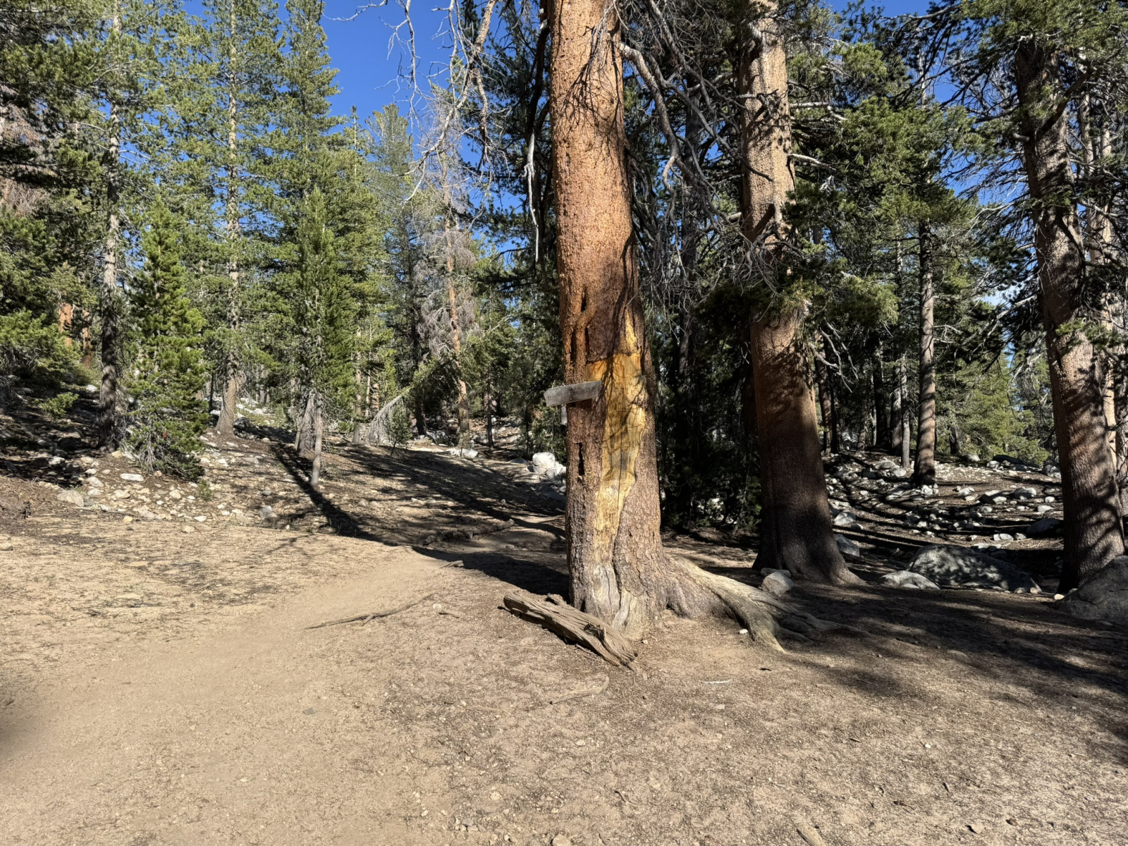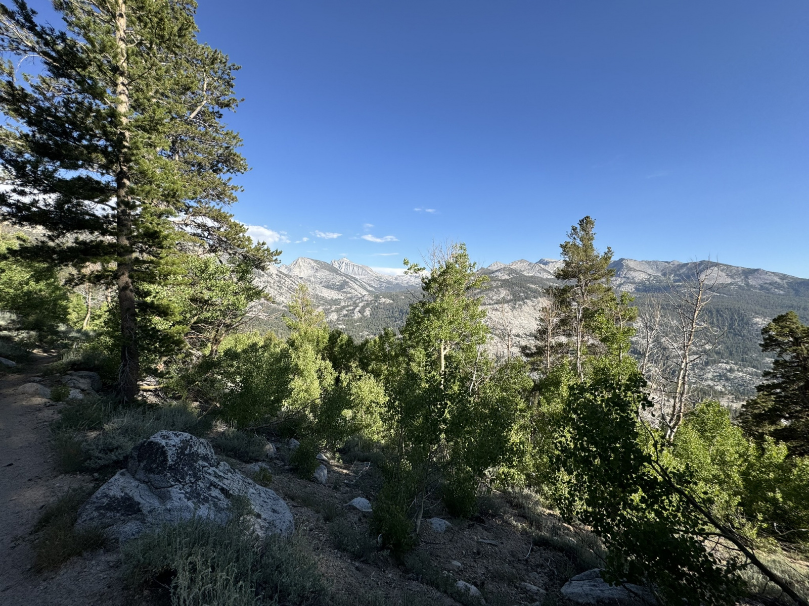 Nach ein paar Kilometern geht es dann langsam bergauf, und es öffnen sich die ersten Aussichten. Auch mit steigender Höhe wird es nicht kühler, deshalb lasse ich mir Zeit. Um eventuelle Verspätungen des Shuttles (die Red's Meadow Road wurde gerade erneuert) kompensieren zu können, habe ich mir einen Bach in gut 11km Entfernung als ersten Campspot herausgesucht, und die erste Nacht sollte man nach Möglichkeit tatsächlich am angegebenen Ort verbringen. Bis dorthin ist der Weg unspäktakulär, aber die Freiheit, endlich wieder auf dem Trail zu sein, und der Geruch von trockenen Piniennadeln und dem Saft der Jeffrey Pines lassen mein Herz höher schlagen. Ich suhle mich in Erinnerungen an meine PCT-Wanderung und grinse vor mich hin.
