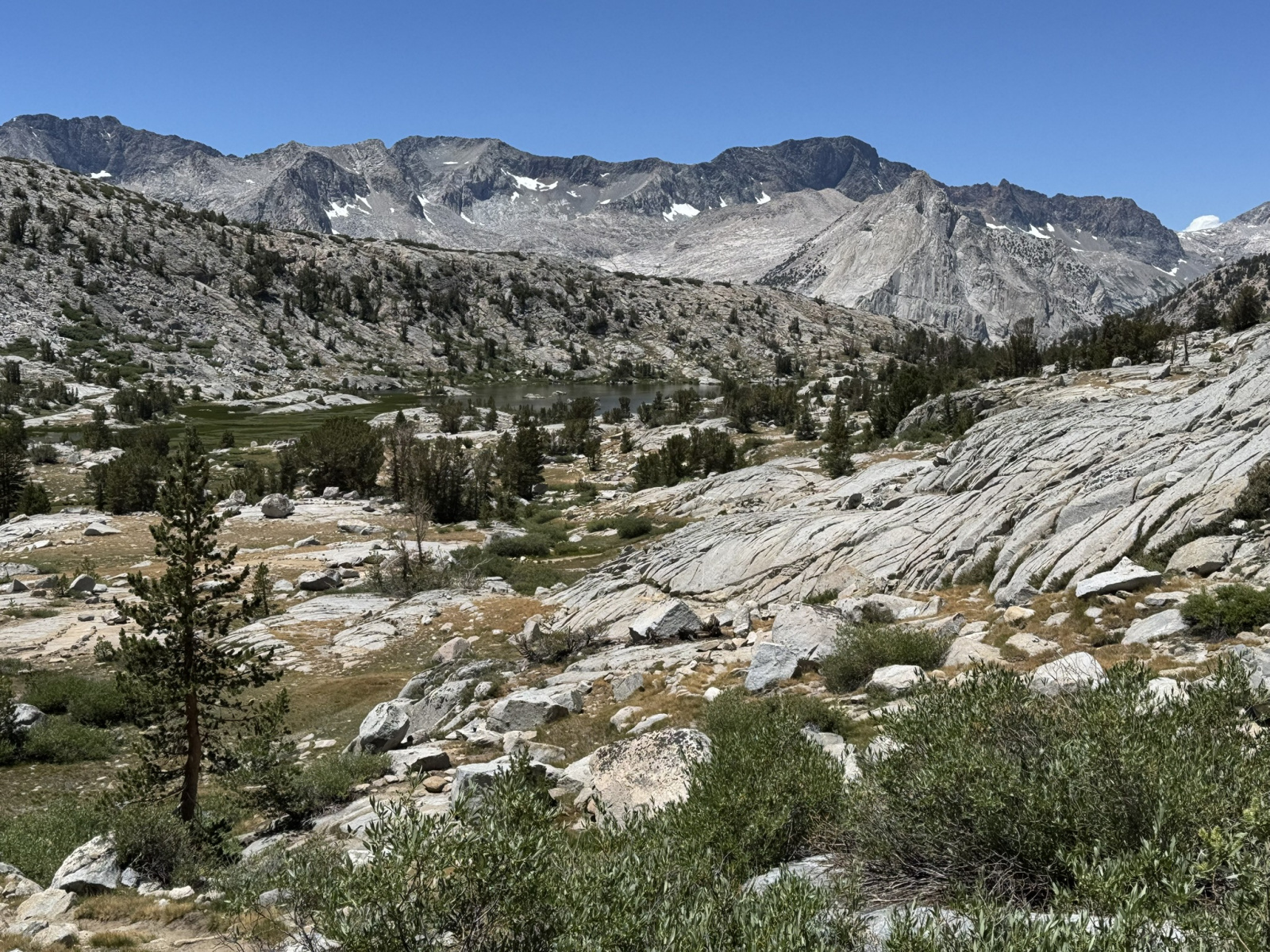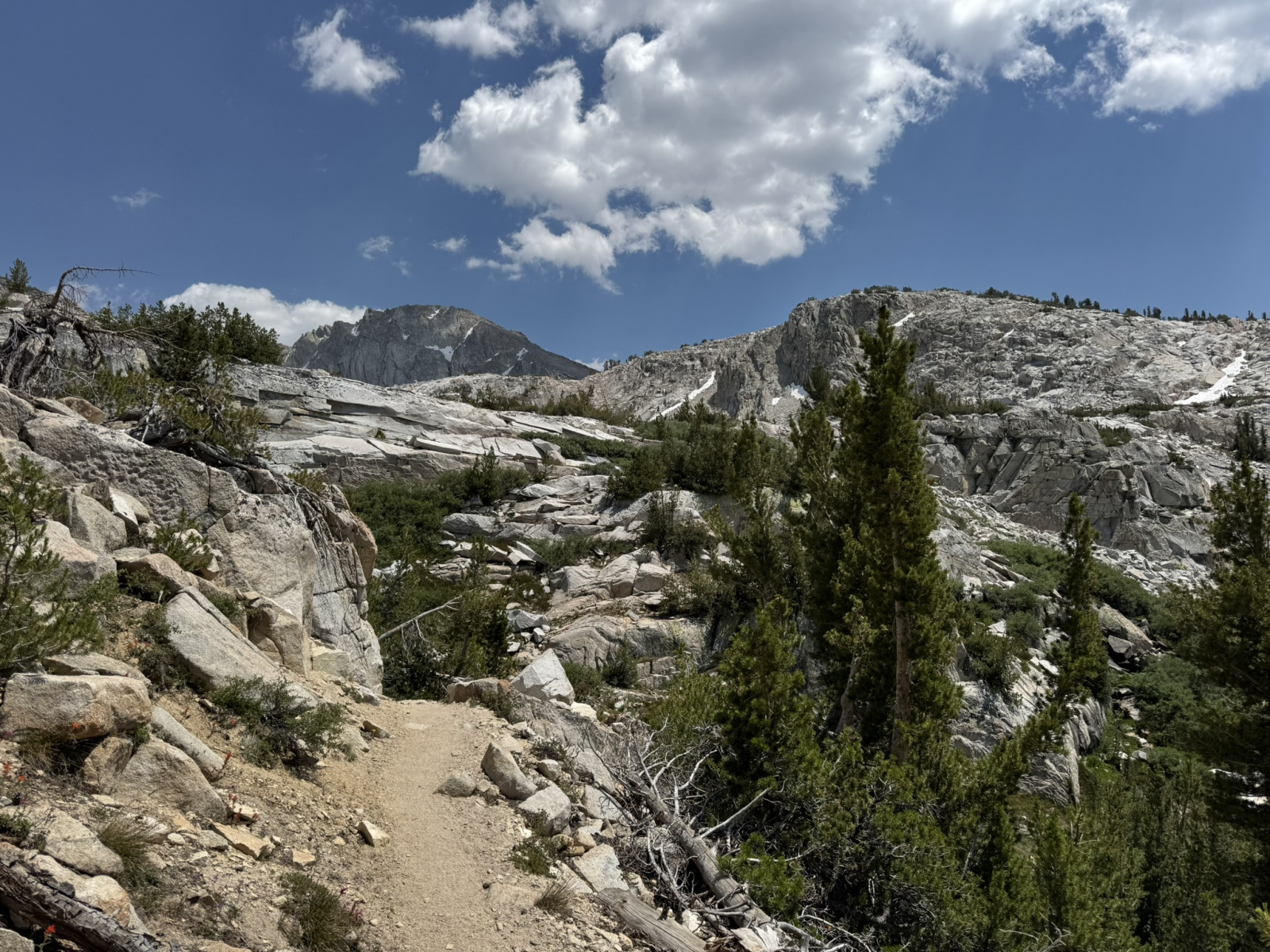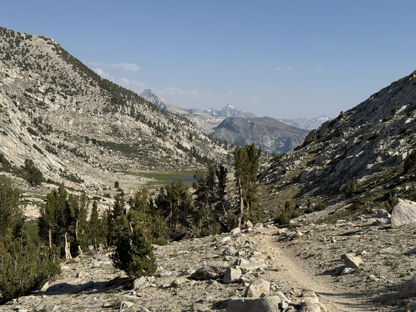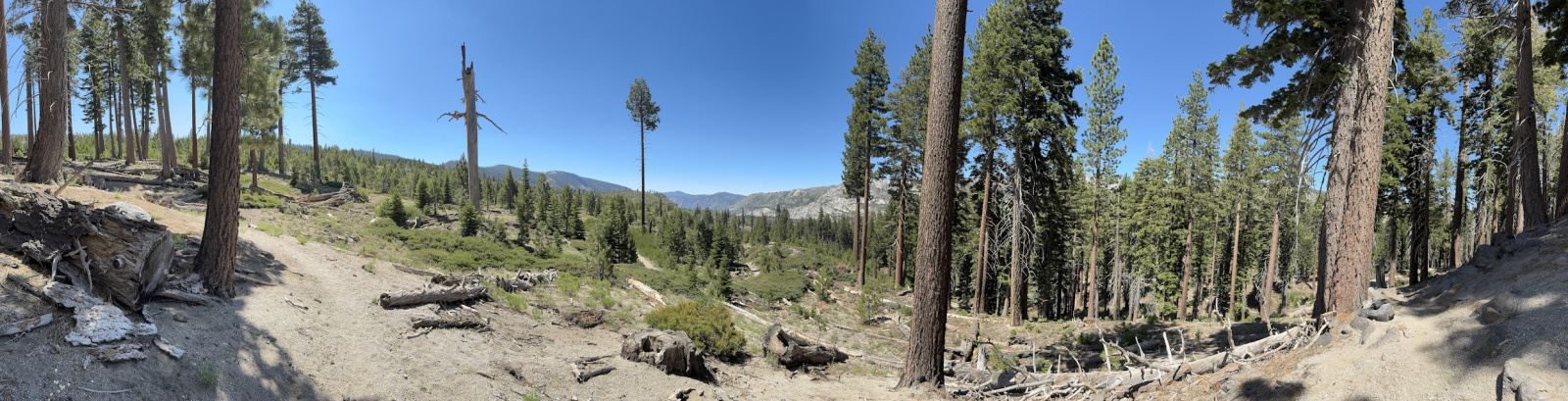 Nach ein paar Kilometern geht es dann langsam bergauf, und es öffnen sich die ersten Aussichten. Auch mit steigender Höhe wird es nicht kühler, deshalb lasse ich mir Zeit. Um eventuelle Verspätungen des Shuttles (die Red's Meadow Road wurde gerade erneuert) kompensieren zu können, habe ich mir einen Bach in gut 11km Entfernung als ersten Campspot herausgesucht, und die erste Nacht sollte man nach Möglichkeit tatsächlich am angegebenen Ort verbringen. Bis dorthin ist der Weg unspäktakulär, aber die Freiheit, endlich wieder auf dem Trail zu sein, und der Geruch von trockenen Piniennadeln und dem Saft der Jeffrey Pines lassen mein Herz höher schlagen. Ich suhle mich in Erinnerungen an meine PCT-Wanderung und grinse vor mich hin.