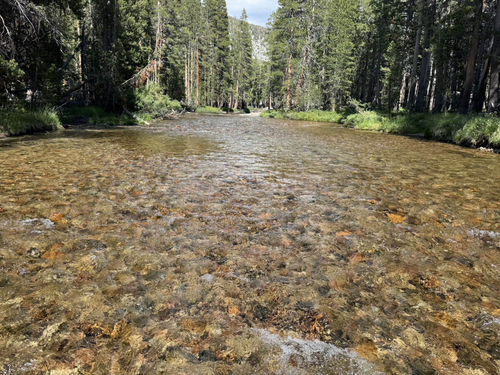 Die Hitze und der schlechte Schlaf der Nacht sind es dann wohl zusammen, die mich nur flüchtig auf die Wegweiser achten lassen, so dass ich kurz nach dem Start erst einmal 1,5km in die falsche Richtung laufe. Irgendwann merke ich natürlich, das die Sonne schon zu lange seitlich auf mich scheint und frage FarOut nach Rat, das mir dann auch deutlich zeigt, wie falsch ich bin. Jetzt kann ich entweder wieder zurück gehen oder auf einer kleinen Schleife den JMT etwas südlich wieder treffen. Letzteres ist etwas kürzer und der Trail führt richtig schön an einem Gebirgsbach entlang. Die Basaltsäulen, den namensgebenden Postpile, kenne ich ja schon, so entscheide ich mich für die direktere Variante.