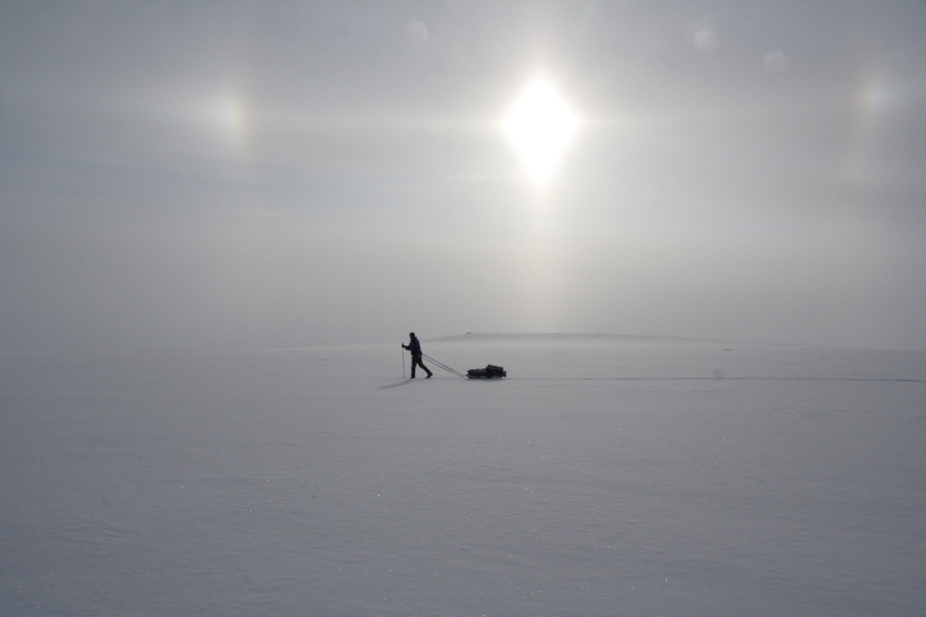Dann Gepäck abgeholt und weit gelaufen. Der Finne erzählte von einer schönen Hütte, an der er vorbeigekommen sein will. Er hat den Standort bei uns in die Karte übertragen. War natürlich Quatsch, seine Spuren verliefen woanders her. Haben uns um 18 h bei Sonnenuntergang entschieden noch 12 km bis zur nächsten Hütte zu laufen. Zu der Zeit waren wir gerade auf einer Ebene mit ordentlich Wind. Auf dem Weg zur Hütte (Navigation per GPS, da dunkel) haben wir ein wunderbares Polarlicht gesehen. Ansonsten war’s sehr anstrengend und kalt. Um ca 23 h haben wir ziemlich erschöpft und dehydriert die Hütte (Goahppelasjärvi) erreicht.