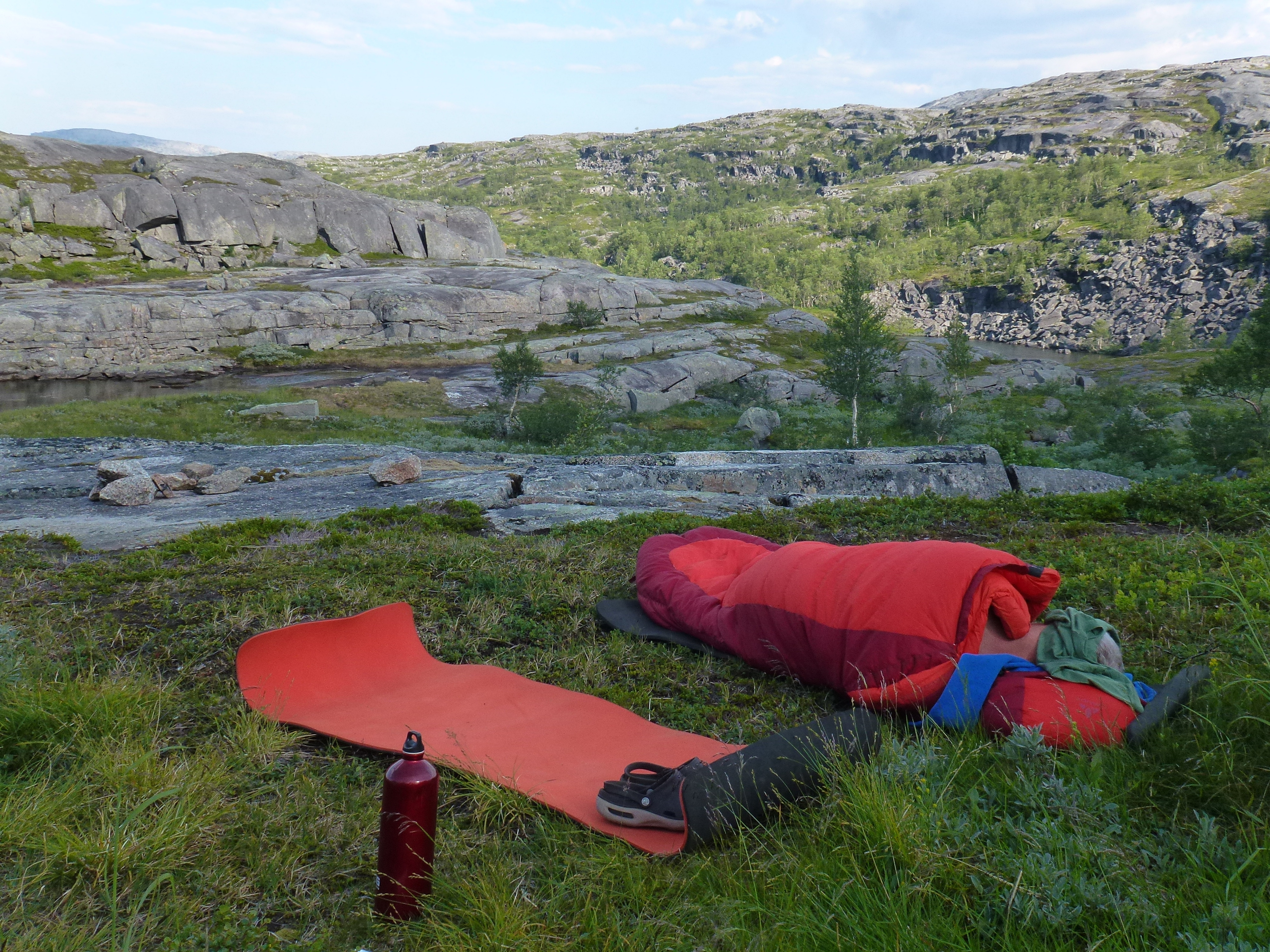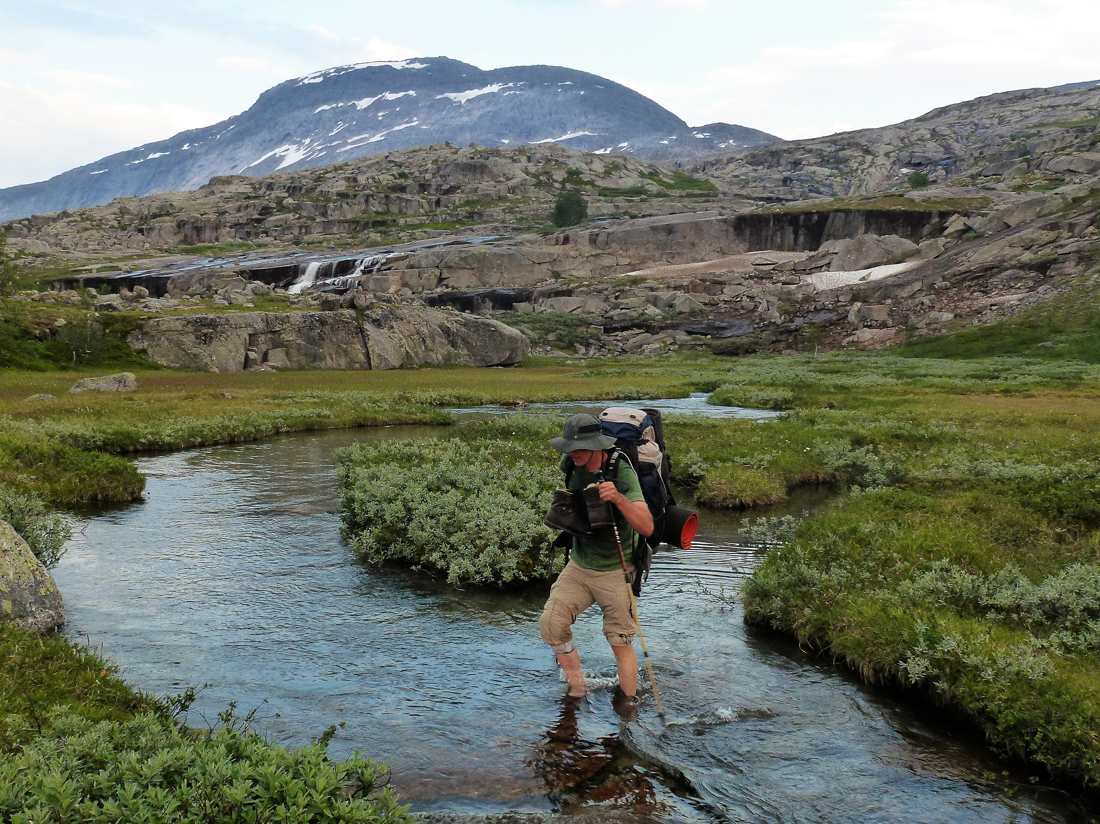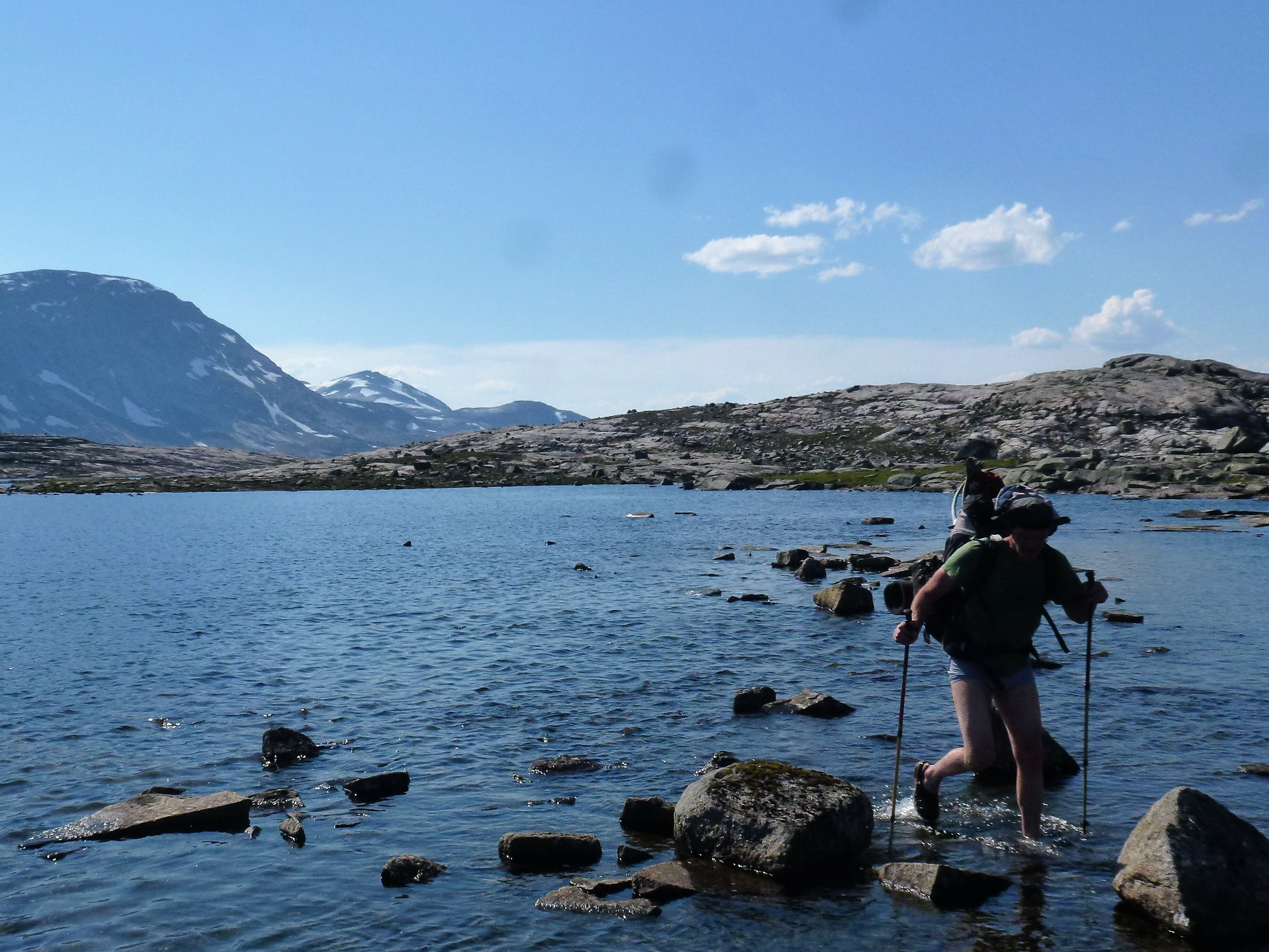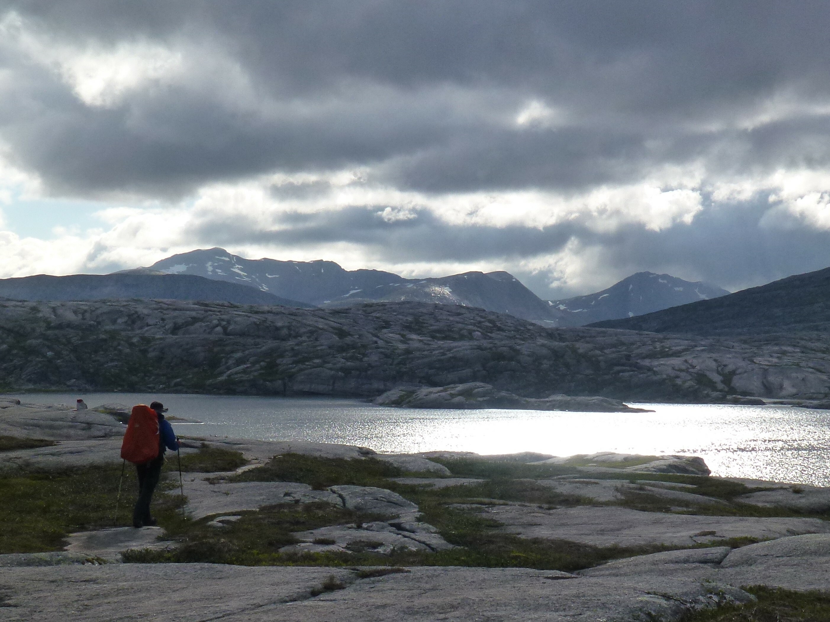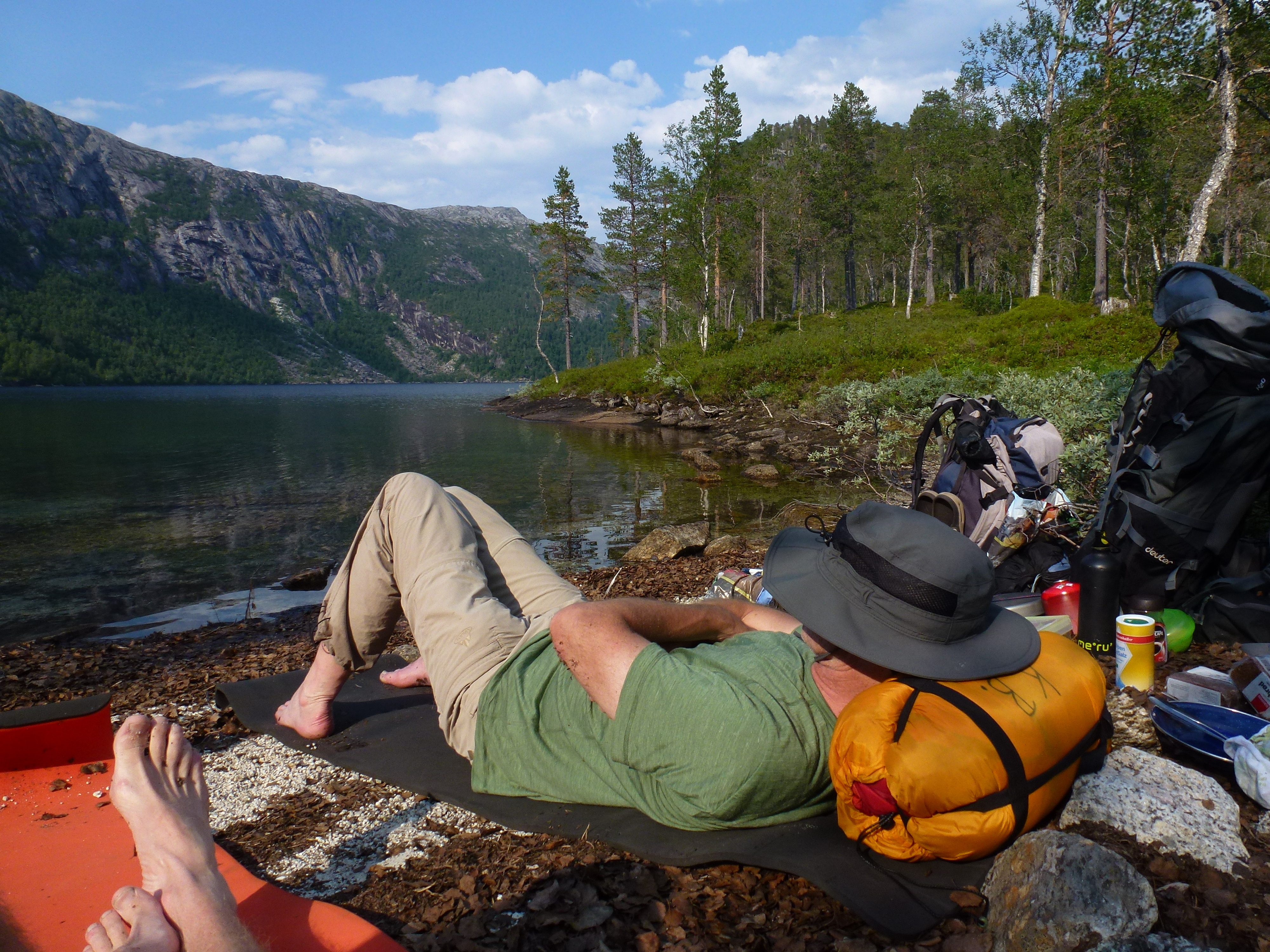 Als wir die Storskogvagnethütte erreichen, haben wir dank unserer Hammer-Rucksäcke schon ganz schön Saft gelassen und für gerade mal 8 km 4 Wanderstunden gebraucht. Aber wie schön liegt das kleine Hütterl: Im Wald, am See, an Stromschnellen, die zum Wasserfall werden, der in einen weiteren See fällt, der umstanden ist von großen, felsigen Bergen, so weit das Auge reicht ….Von den 4 Hüttenbetten sind zwei bereits belegt von den jungen Norwegerinnen, also sind zwei Betten für uns noch frei. Wir kochen uns zum ersten Mal unser Aufguss-Trekkingmahl und stellen fest, dass es lecker und sättigend ist. Den hellen und warmen Mittsommer-Nacht-Abend genießen wir in der Umgebung der Hütte an den Stromschnellen und den Seen.