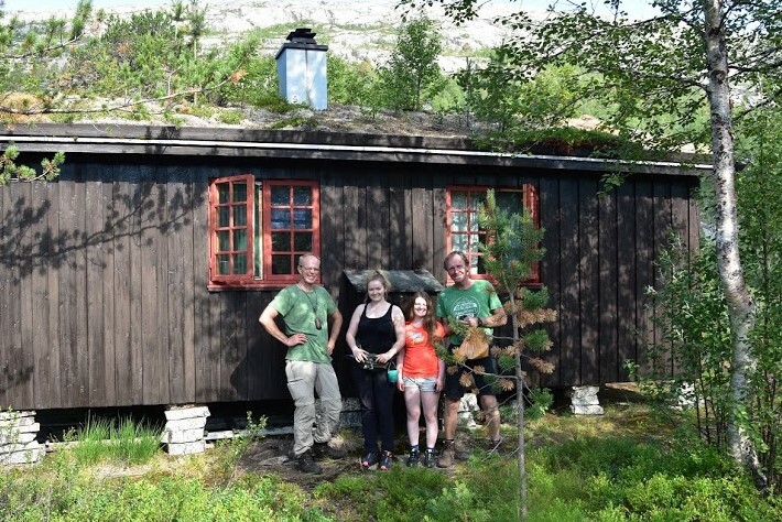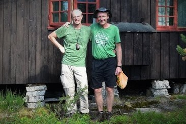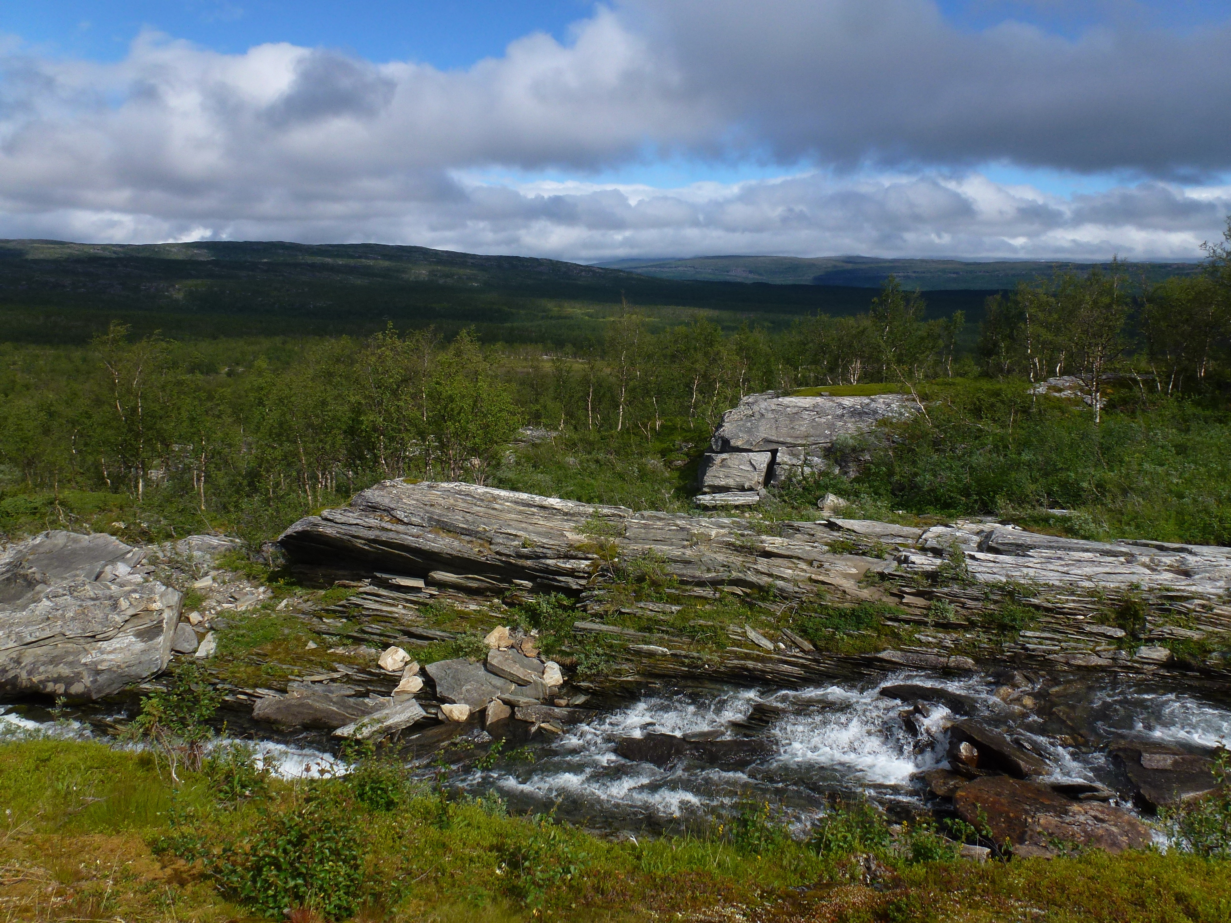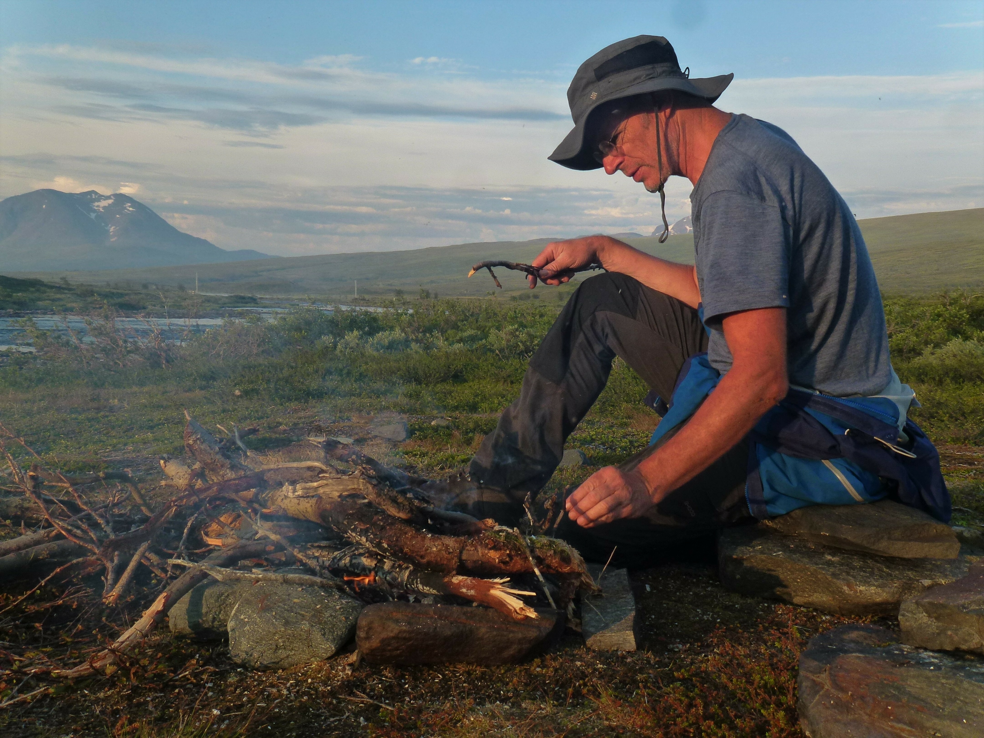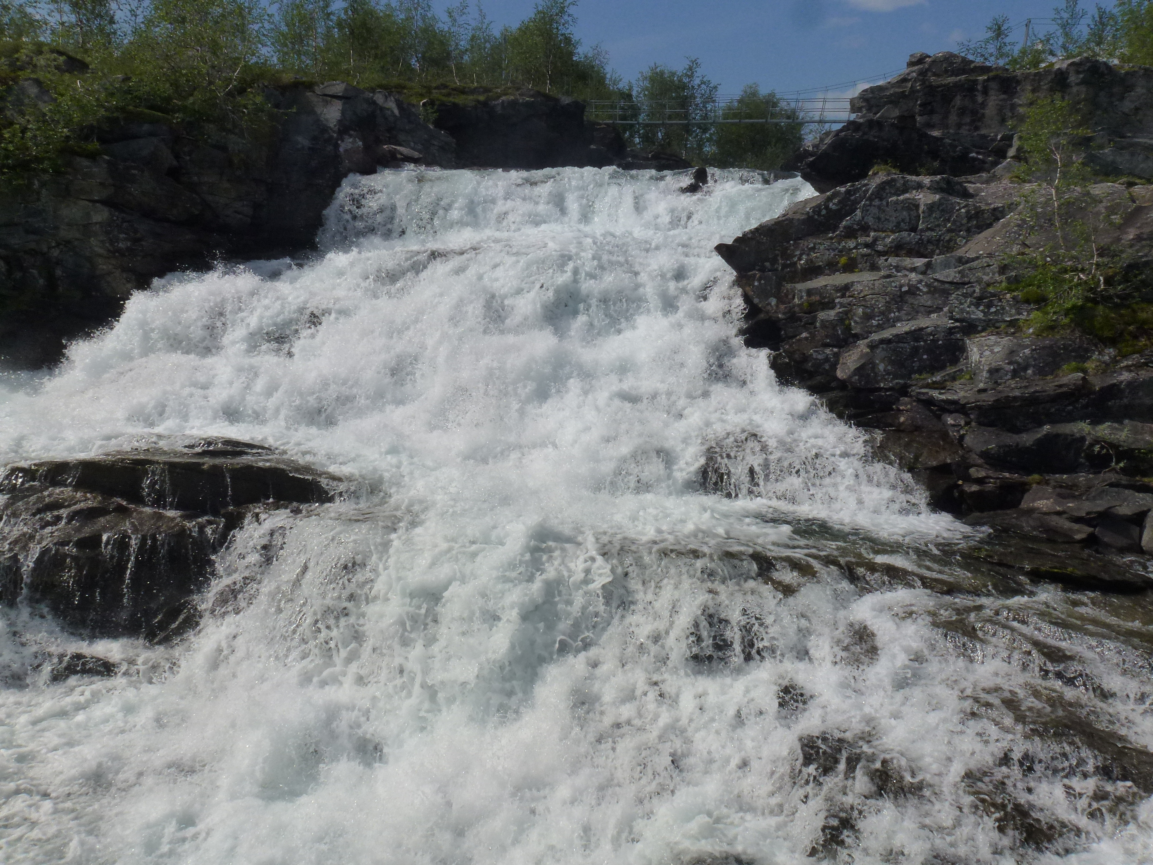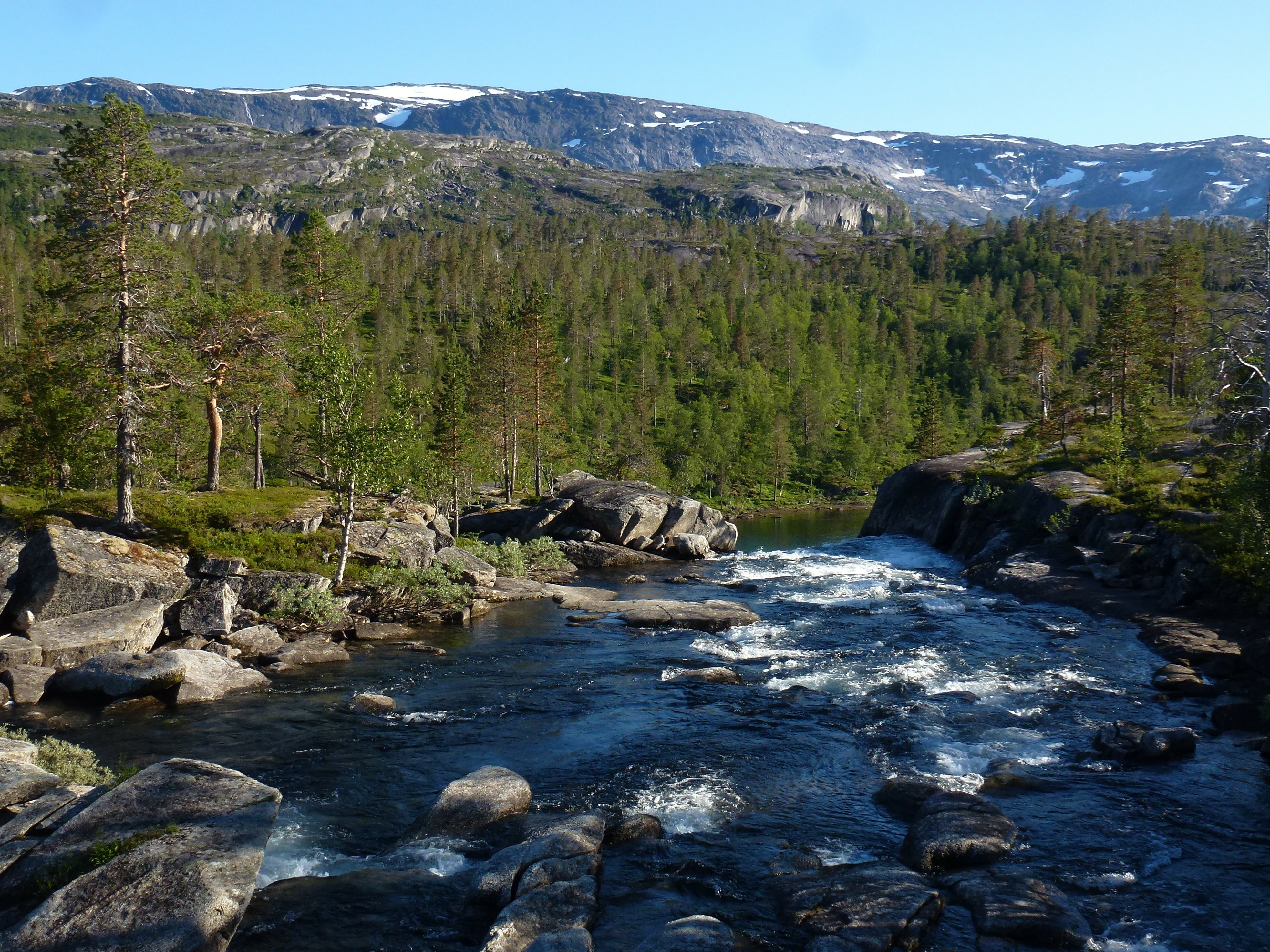 Als wir die Storskogvagnethütte erreichen, haben wir dank unserer Hammer-Rucksäcke schon ganz schön Saft gelassen und für gerade mal 8 km 4 Wanderstunden gebraucht. Aber wie schön liegt das kleine Hütterl: Im Wald, am See, an Stromschnellen, die zum Wasserfall werden, der in einen weiteren See fällt, der umstanden ist von großen, felsigen Bergen, so weit das Auge reicht ….Von den 4 Hüttenbetten sind zwei bereits belegt von den jungen Norwegerinnen, also sind zwei Betten für uns noch frei. Wir kochen uns zum ersten Mal unser Aufguss-Trekkingmahl und stellen fest, dass es lecker und sättigend ist. Den hellen und warmen Mittsommer-Nacht-Abend genießen wir in der Umgebung der Hütte an den Stromschnellen und den Seen.