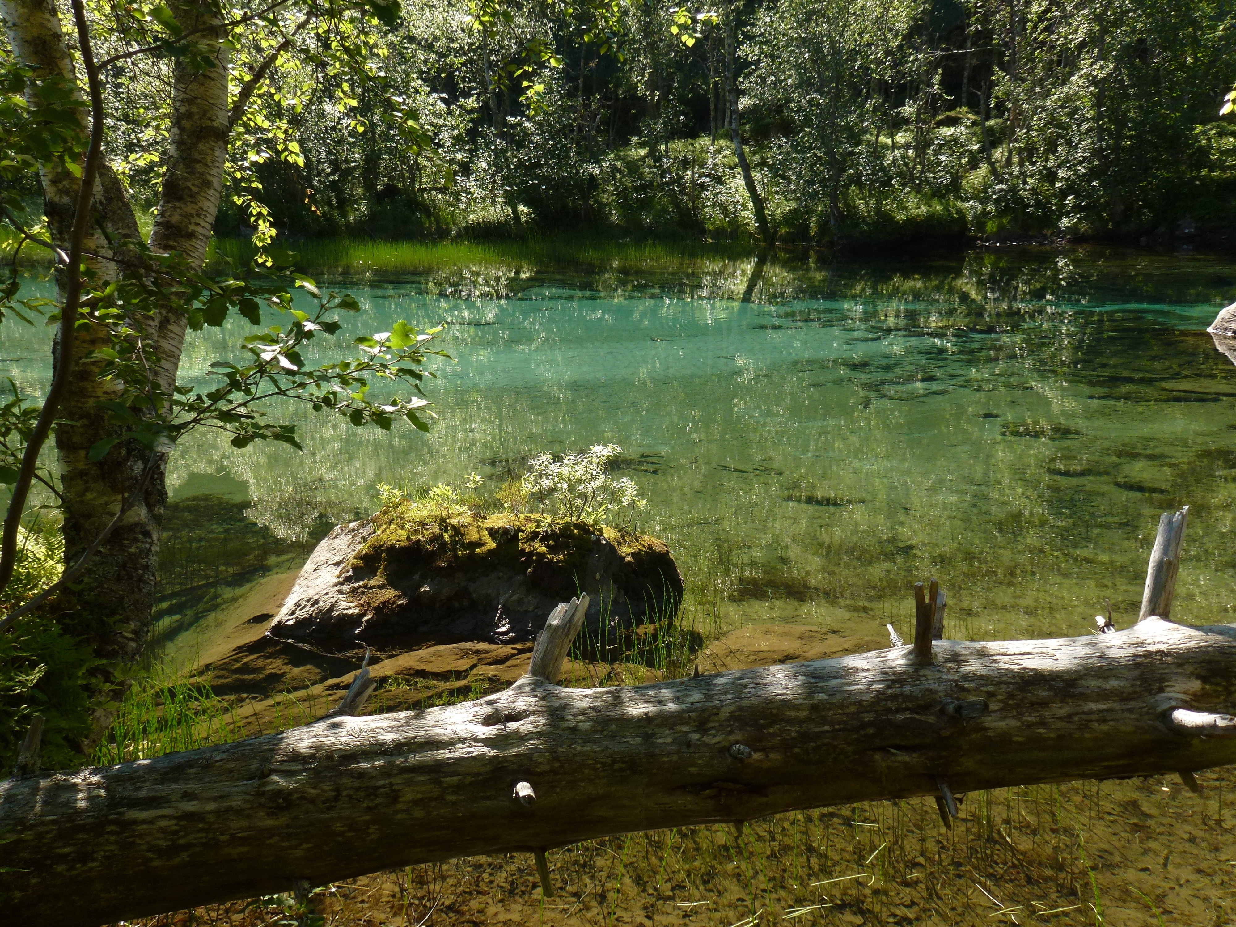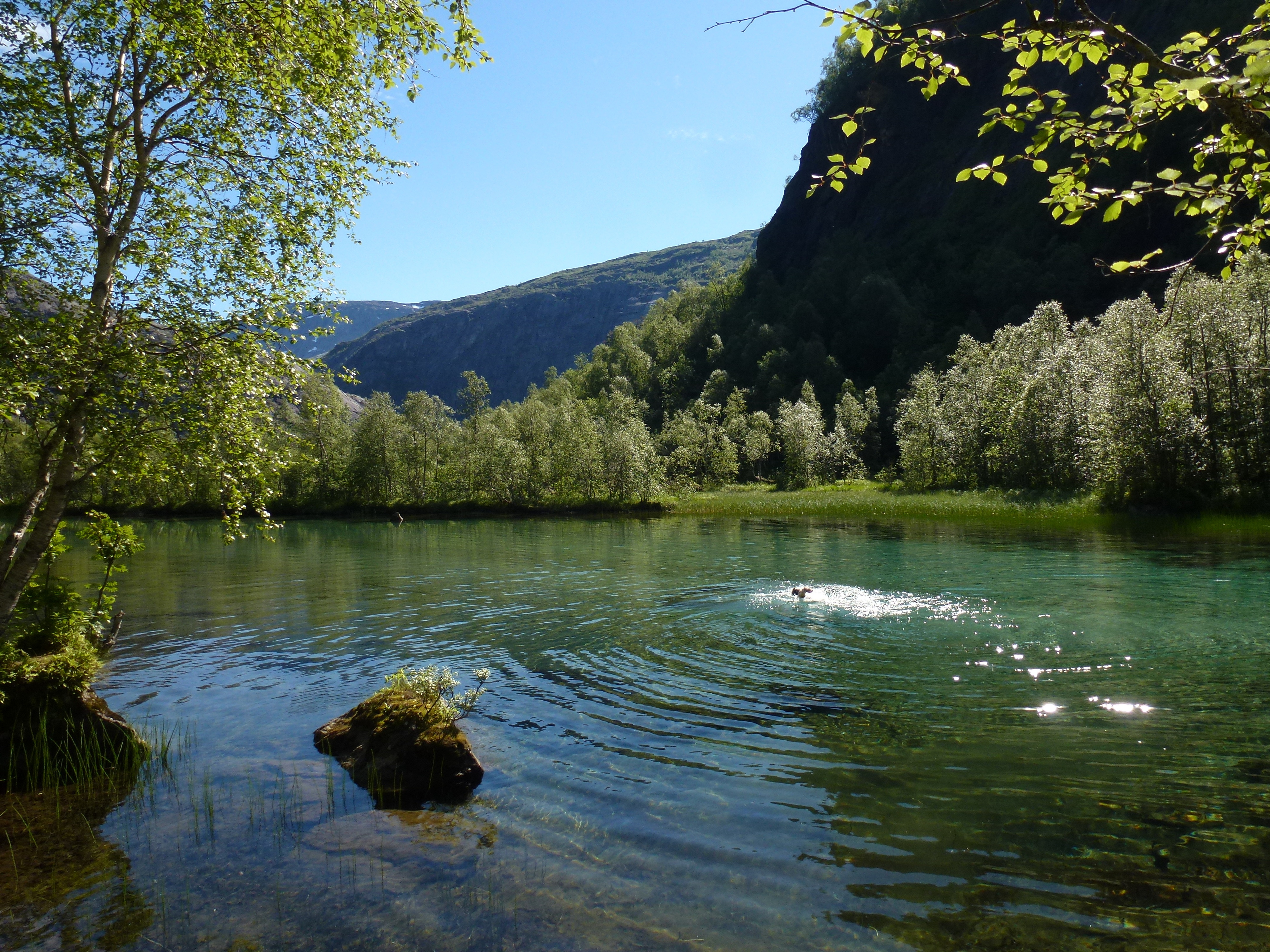 Gleich hinter Lakshol befinden wir uns einem grünen Berg- und Urwaldparadies. Ein türkisfarbener, breiter Fluss mäandert wunderbar durch das Tal, umgeben von steil aufragenden Granitfluchten. Die Sonne brennt fast südlich heiß von einem makellos blauen Himmel. Hinter einer Hängebrücke weitet sich der Fluss zu einer weiten Fläche.