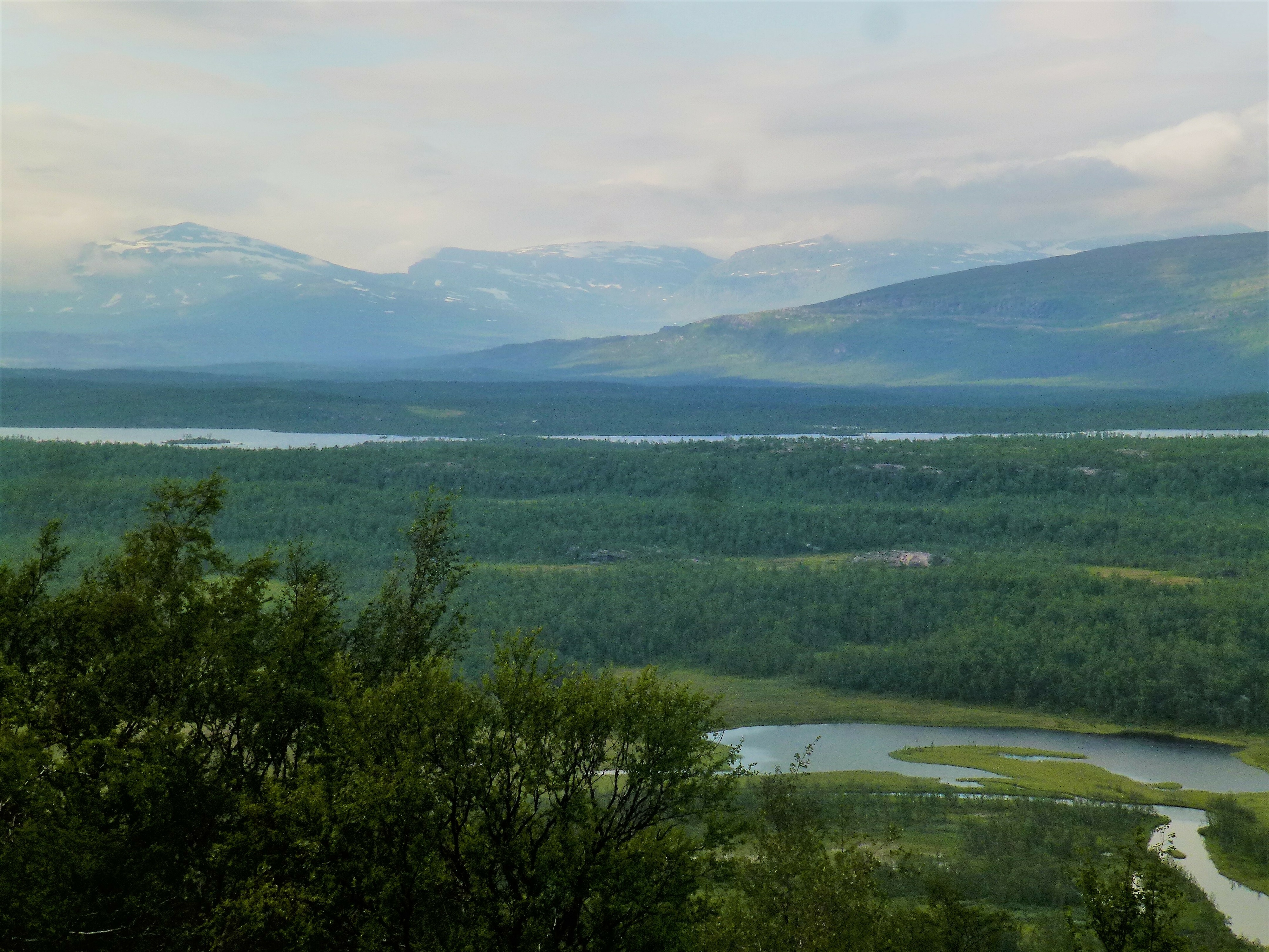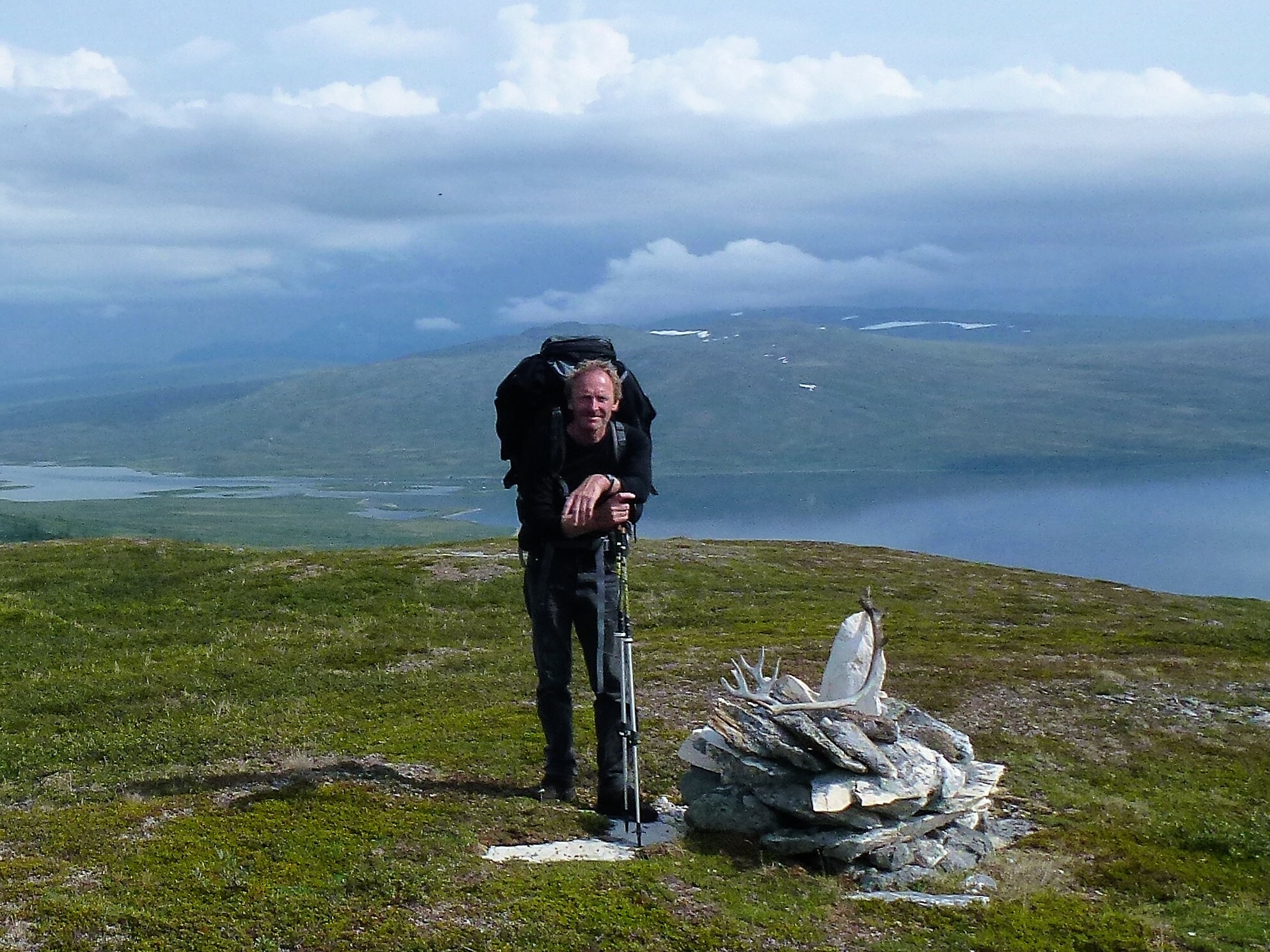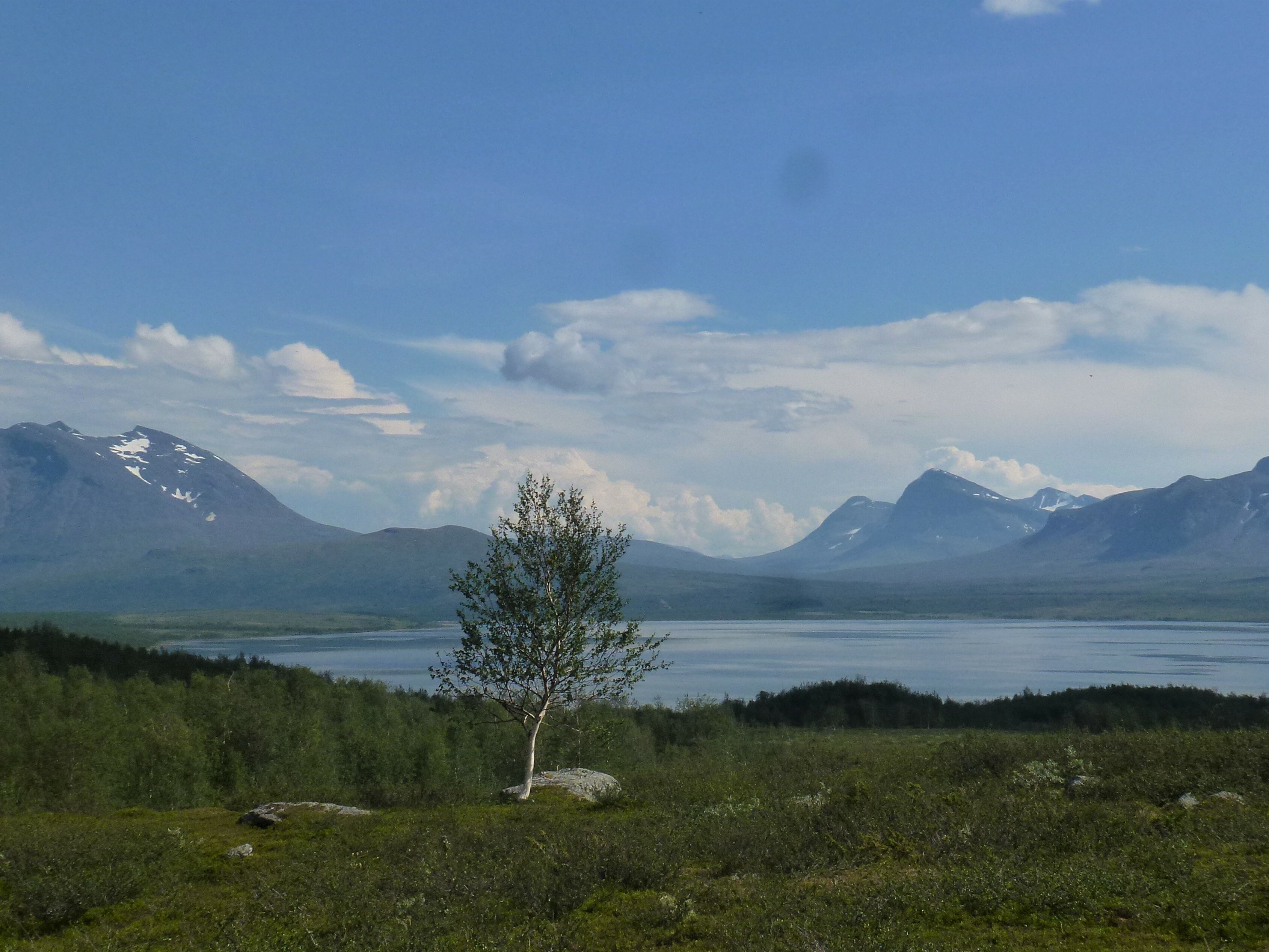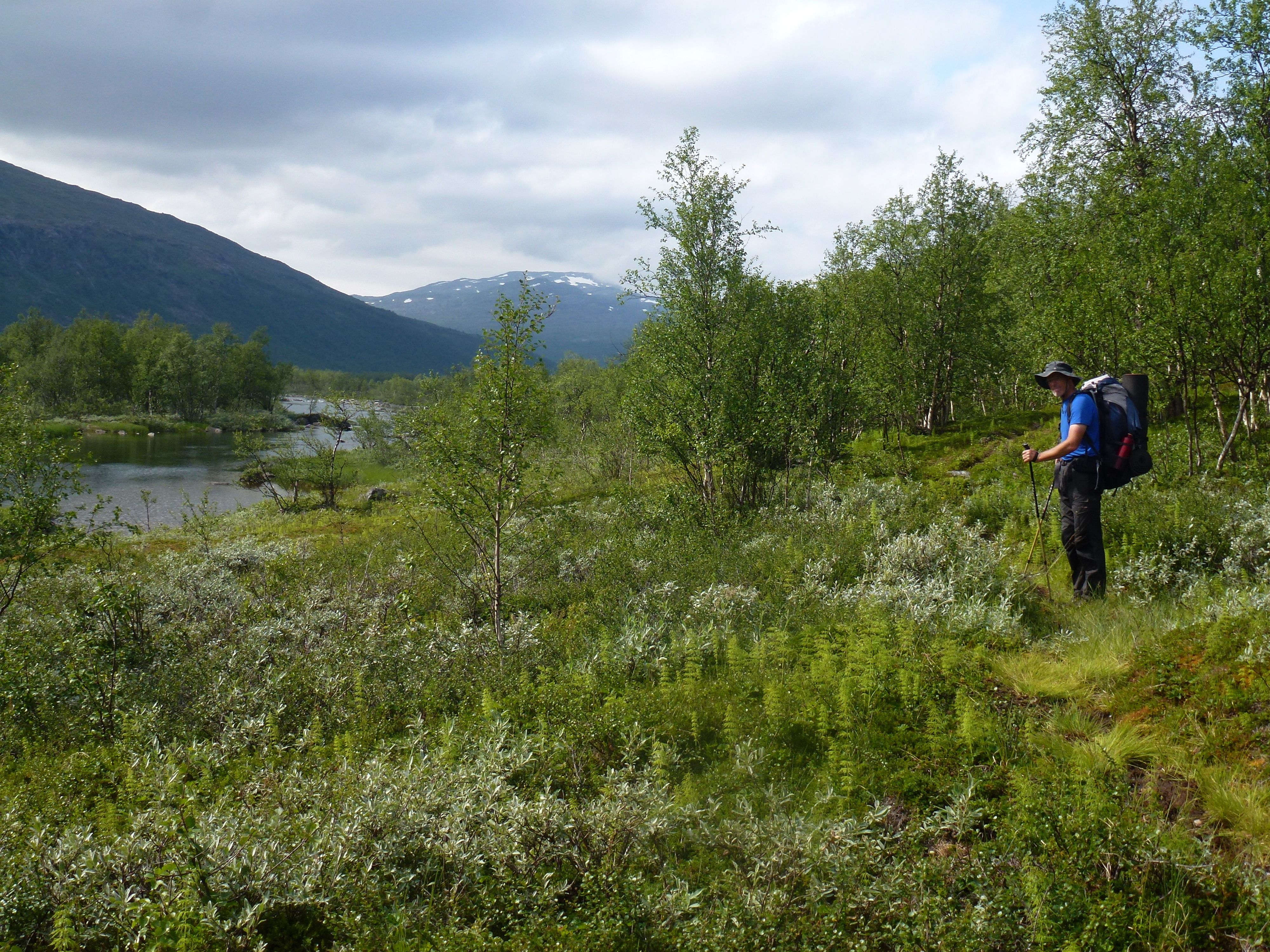 2. Tag: Rago-Nationalpark – Storskogvagnethütte: Beim Frühstück vorm Zelt eine Szenerie wie im bayrischen Voralpenland, fette, grüne Wiesen, der Fjord leuchtet hellblau, hinten schneegekränzte Berge. Wir laufen schwerbepackt mit unseren 22 kg- Rucksäcken 4 km nach Fauske-City. Auch dieses Städtchen wirkt eher spröde, aber zumindest scheint freundlich die Sonne. Wir suchen nach Wanderkarten mit mäßigem Erfolg (Padjelanta ja, Tysfjordgebiet nein), kaufen letzte Lebensmittel und stellen uns zum Trampen an die Straße nach Narvik. Vergeblich. Also nehmen wir ein Taxi, 40 km auf der E6 Richtung Norden durch eine wahre Panoramalandschaft, dann 6 km eine Stichstraße in ein schmales, grünes Tal zur letzten Ansiedlung Lakshol. Hier schultern wir unsere nunmehr 24 kg schweren Rucksäcke und unser Tripp in die nordische Wildnis kann beginnen. Mit uns stehen zwei etwa 20-jährige norwegische Wanderinnen aus Bodö am Start, die zum wiederholten Male in den Rago-Nationalpark aufbrechen.