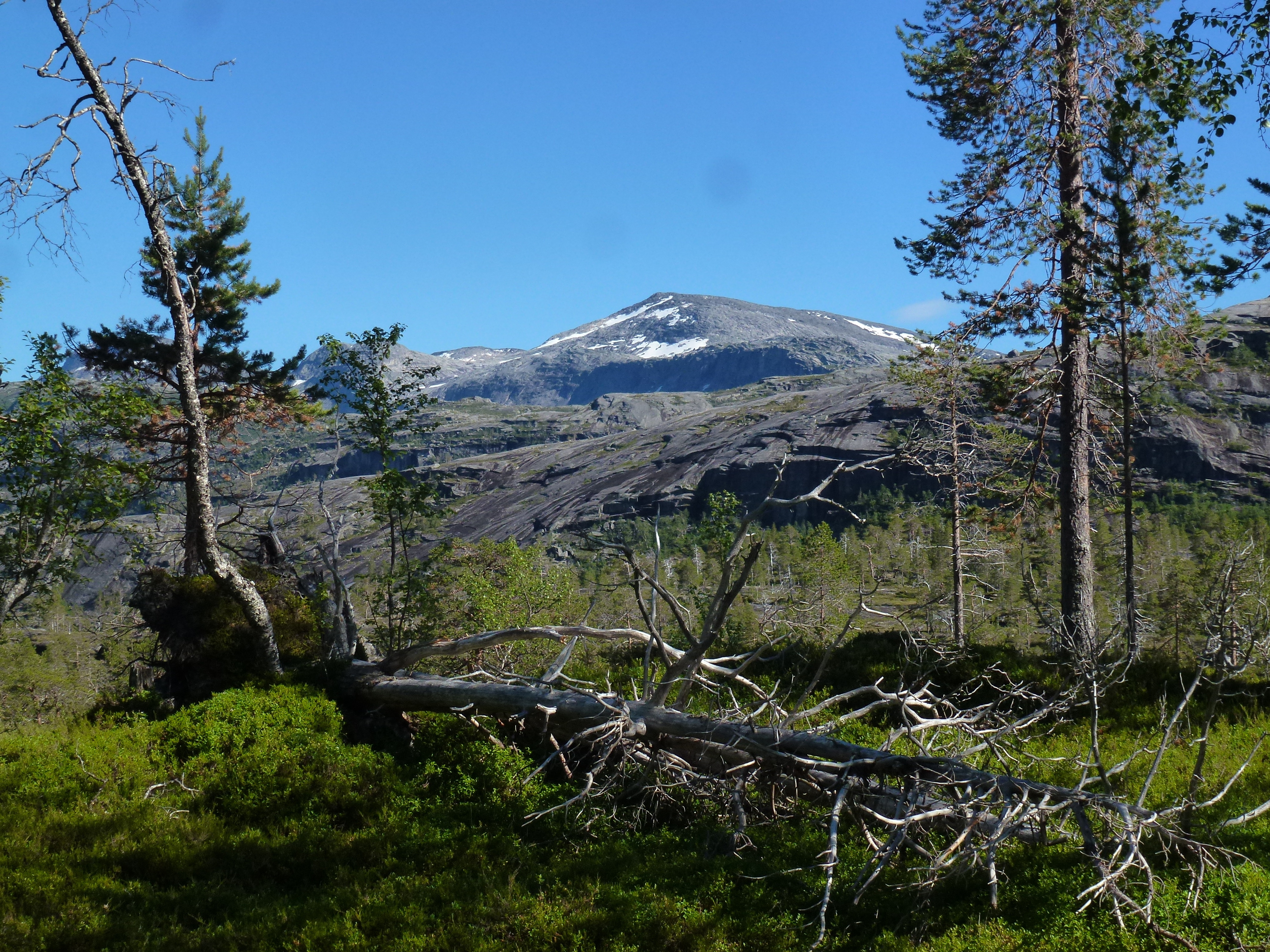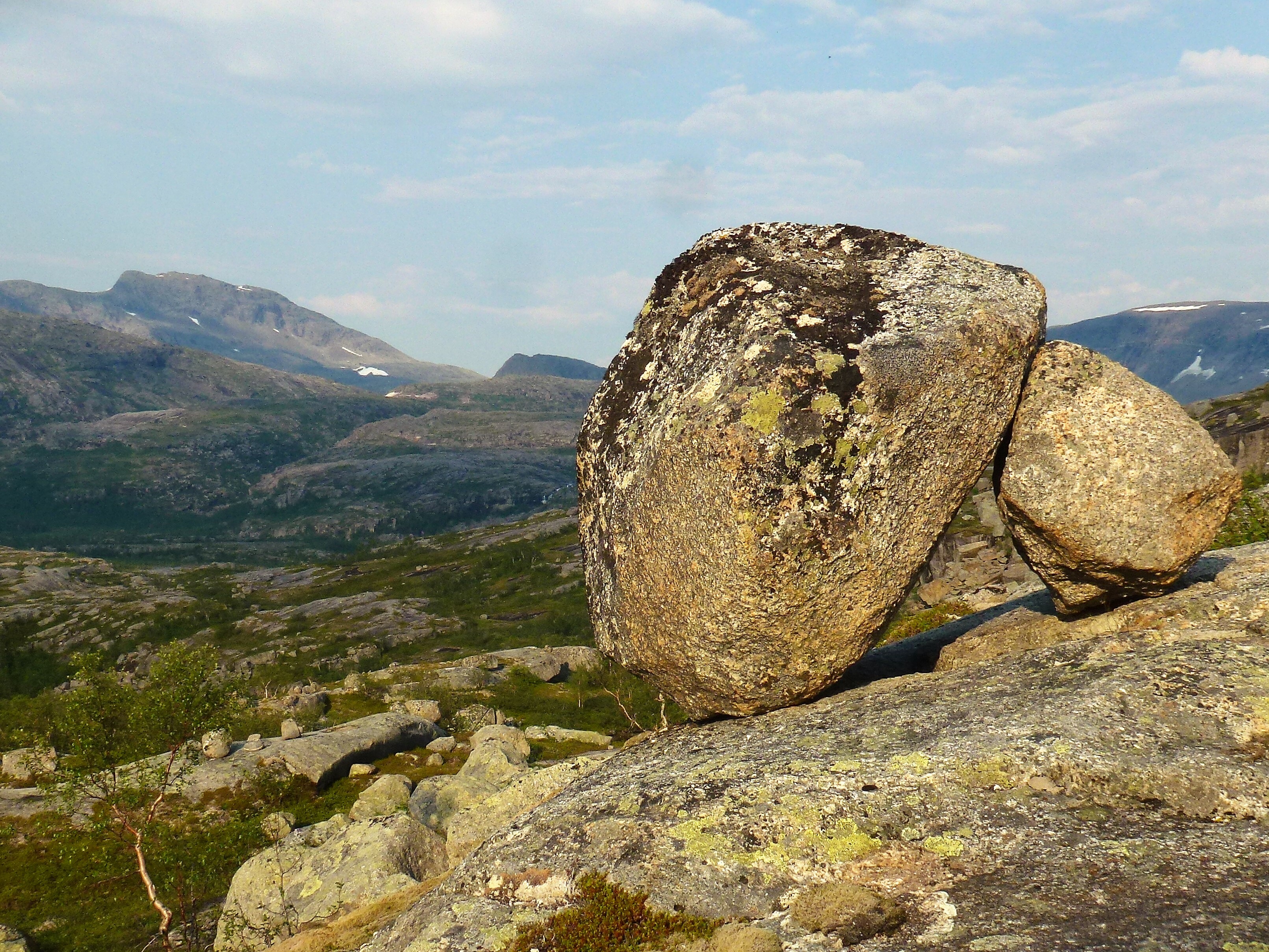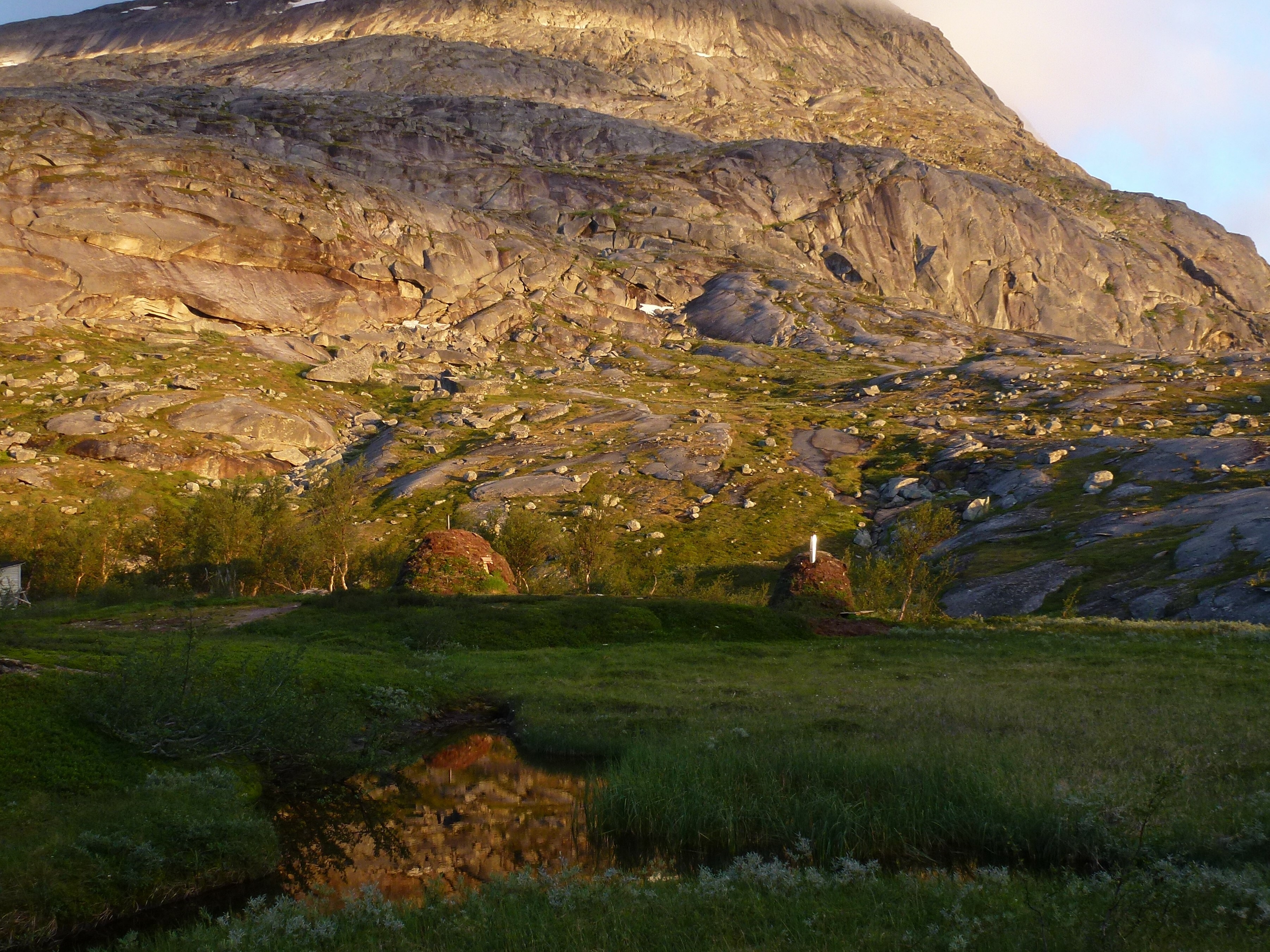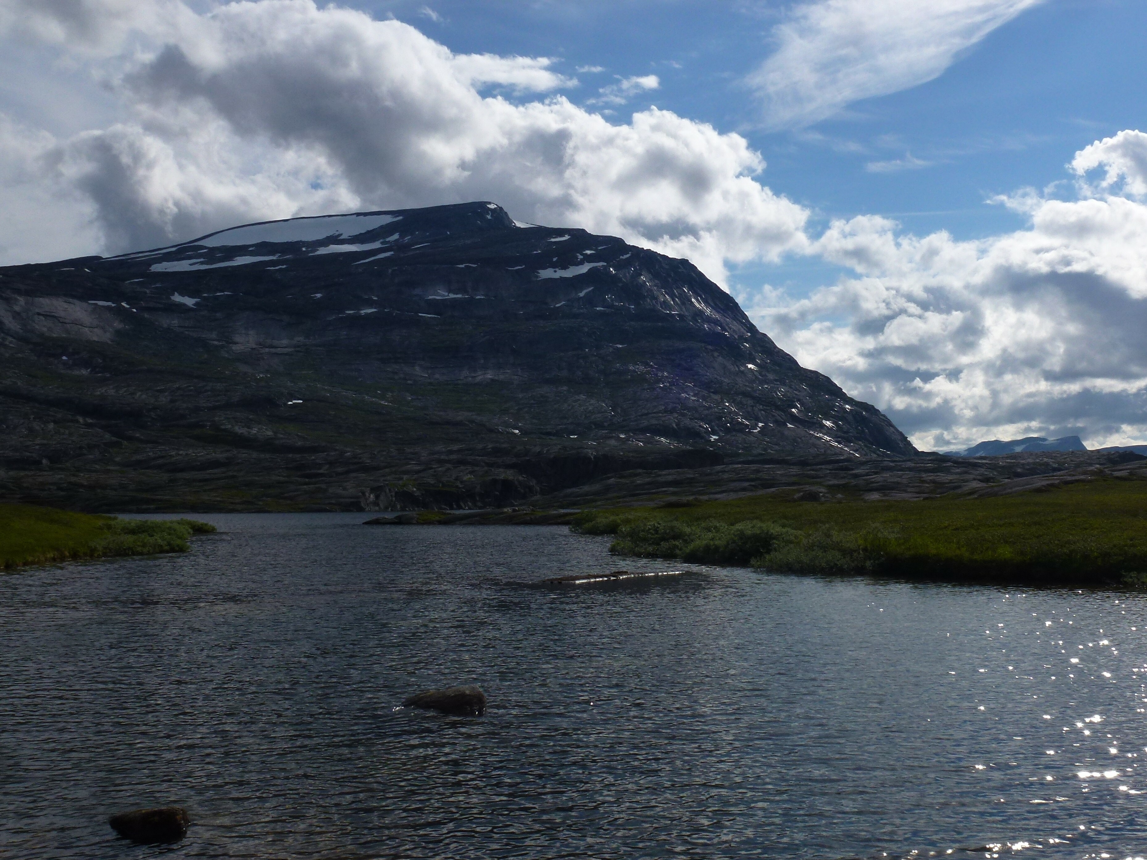 2. Tag: Rago-Nationalpark – Storskogvagnethütte: Beim Frühstück vorm Zelt eine Szenerie wie im bayrischen Voralpenland, fette, grüne Wiesen, der Fjord leuchtet hellblau, hinten schneegekränzte Berge. Wir laufen schwerbepackt mit unseren 22 kg- Rucksäcken 4 km nach Fauske-City. Auch dieses Städtchen wirkt eher spröde, aber zumindest scheint freundlich die Sonne. Wir suchen nach Wanderkarten mit mäßigem Erfolg (Padjelanta ja, Tysfjordgebiet nein), kaufen letzte Lebensmittel und stellen uns zum Trampen an die Straße nach Narvik. Vergeblich. Also nehmen wir ein Taxi, 40 km auf der E6 Richtung Norden durch eine wahre Panoramalandschaft, dann 6 km eine Stichstraße in ein schmales, grünes Tal zur letzten Ansiedlung Lakshol. Hier schultern wir unsere nunmehr 24 kg schweren Rucksäcke und unser Tripp in die nordische Wildnis kann beginnen. Mit uns stehen zwei etwa 20-jährige norwegische Wanderinnen aus Bodö am Start, die zum wiederholten Male in den Rago-Nationalpark aufbrechen.