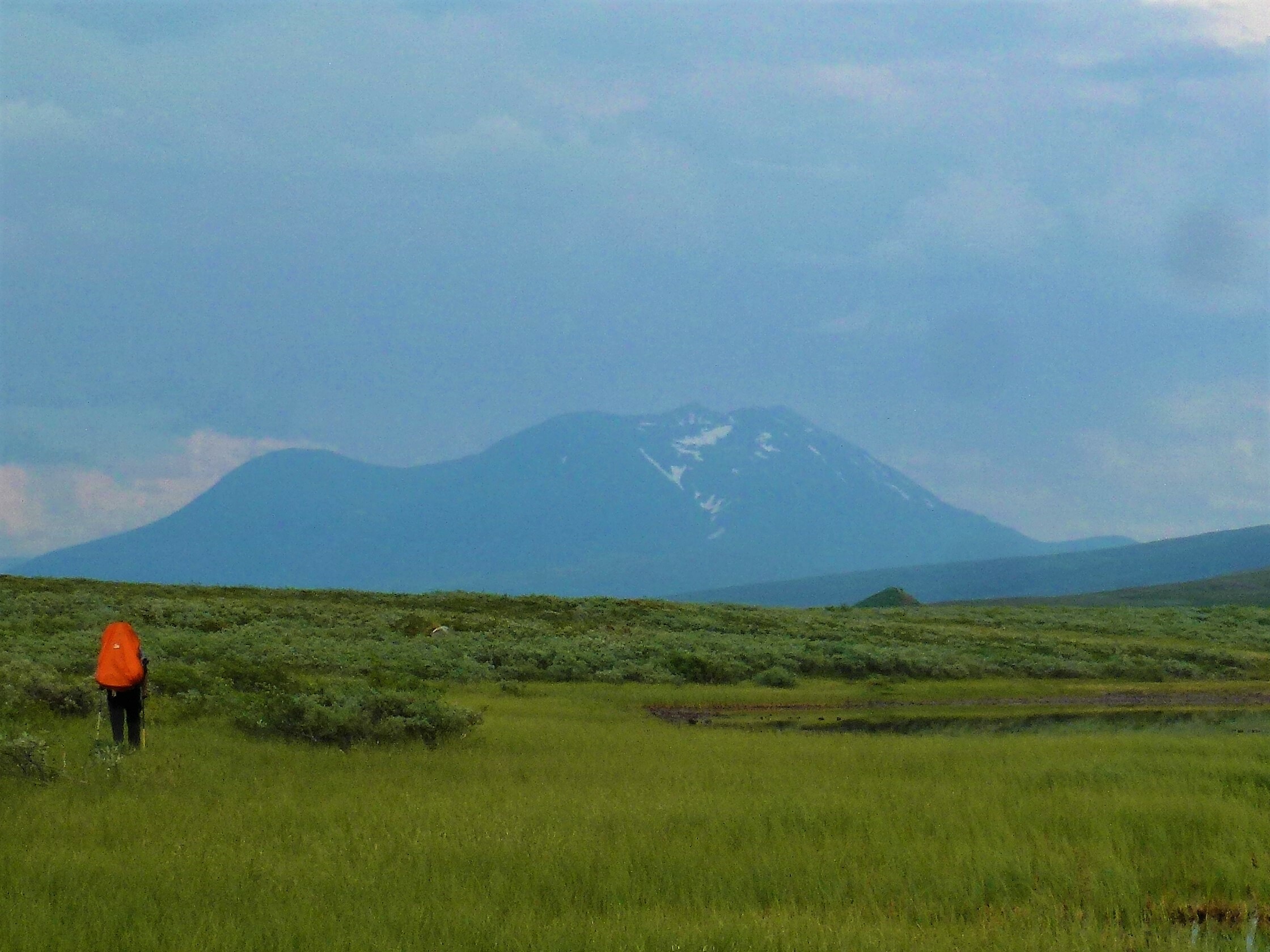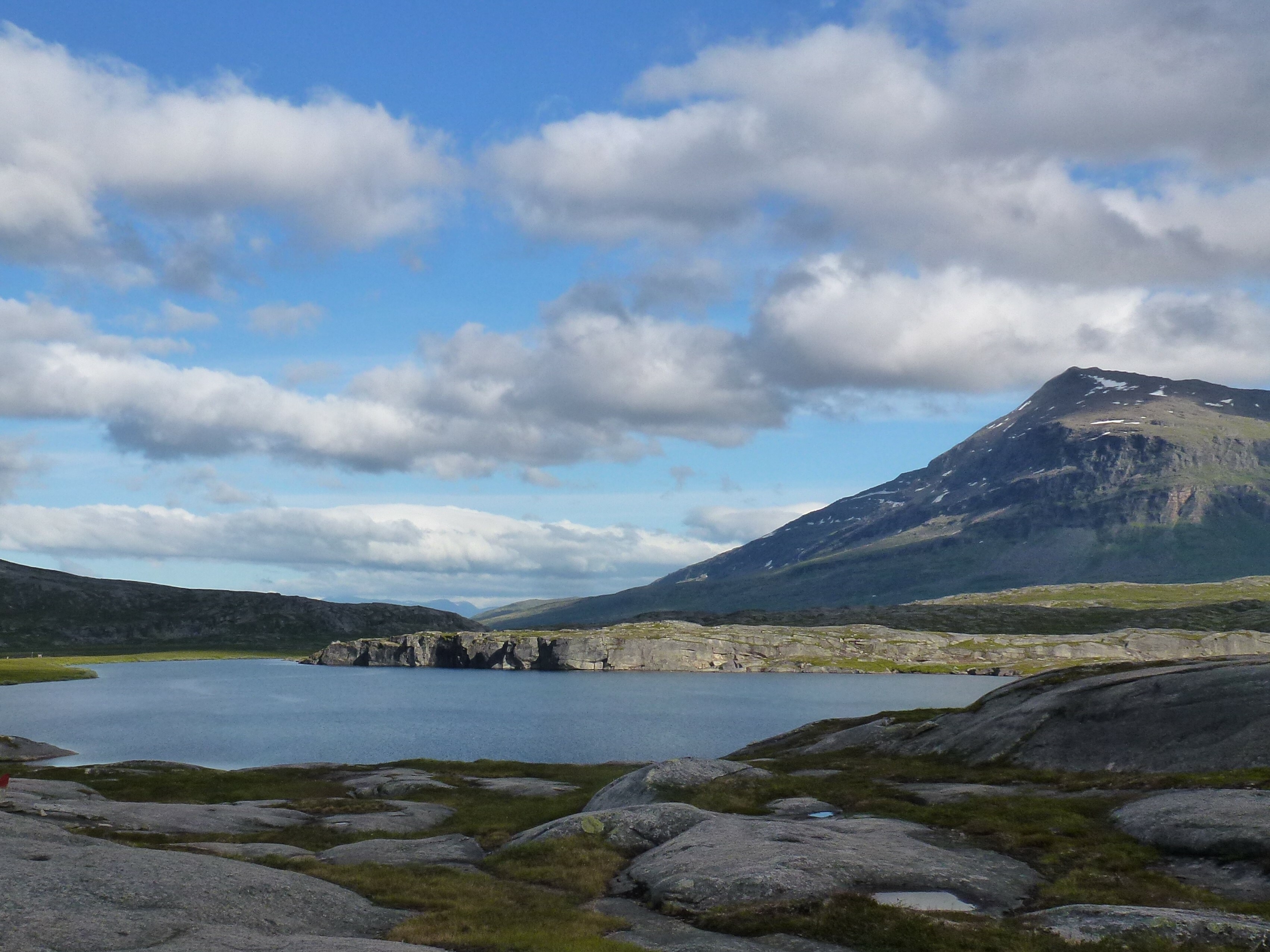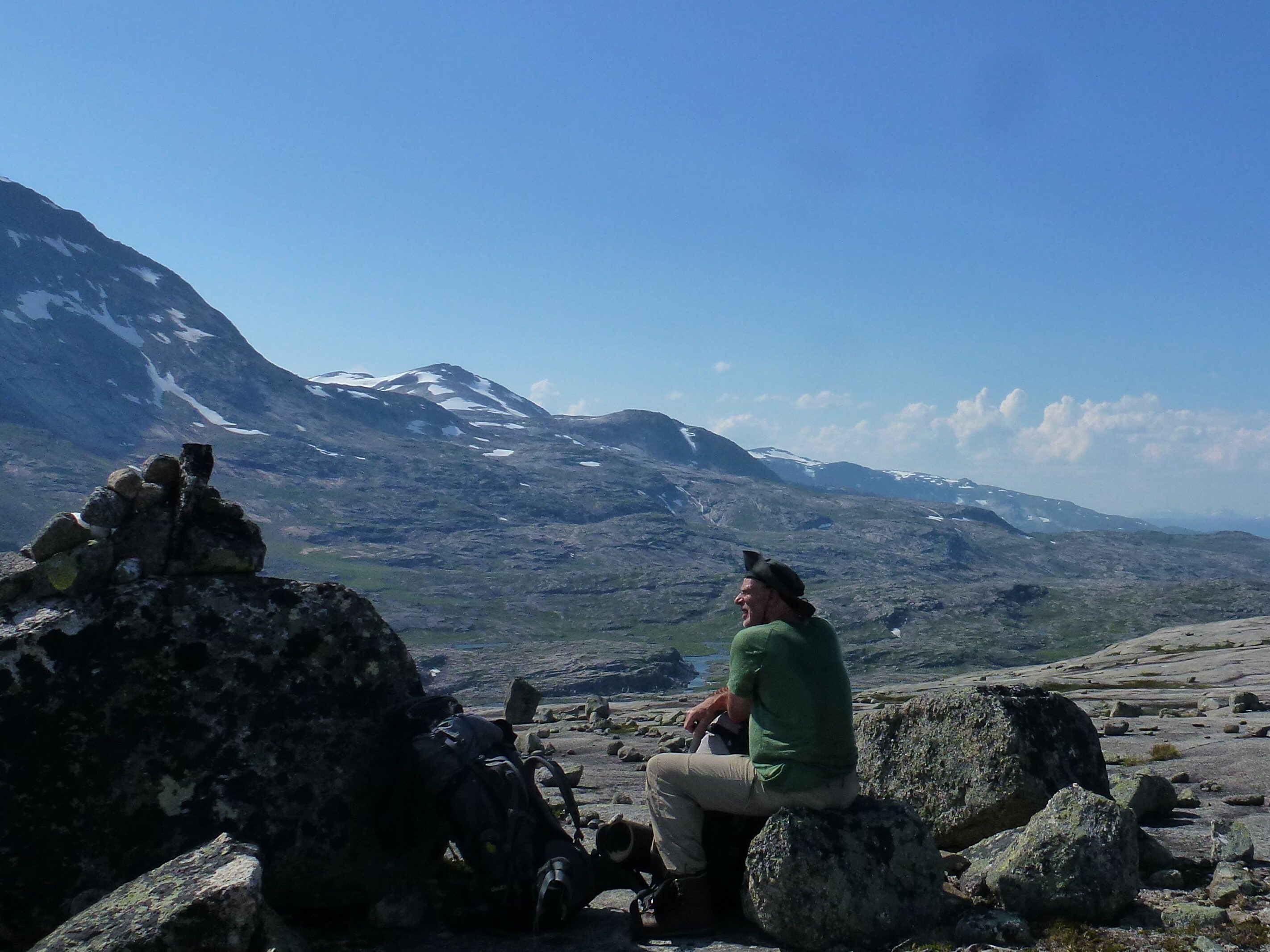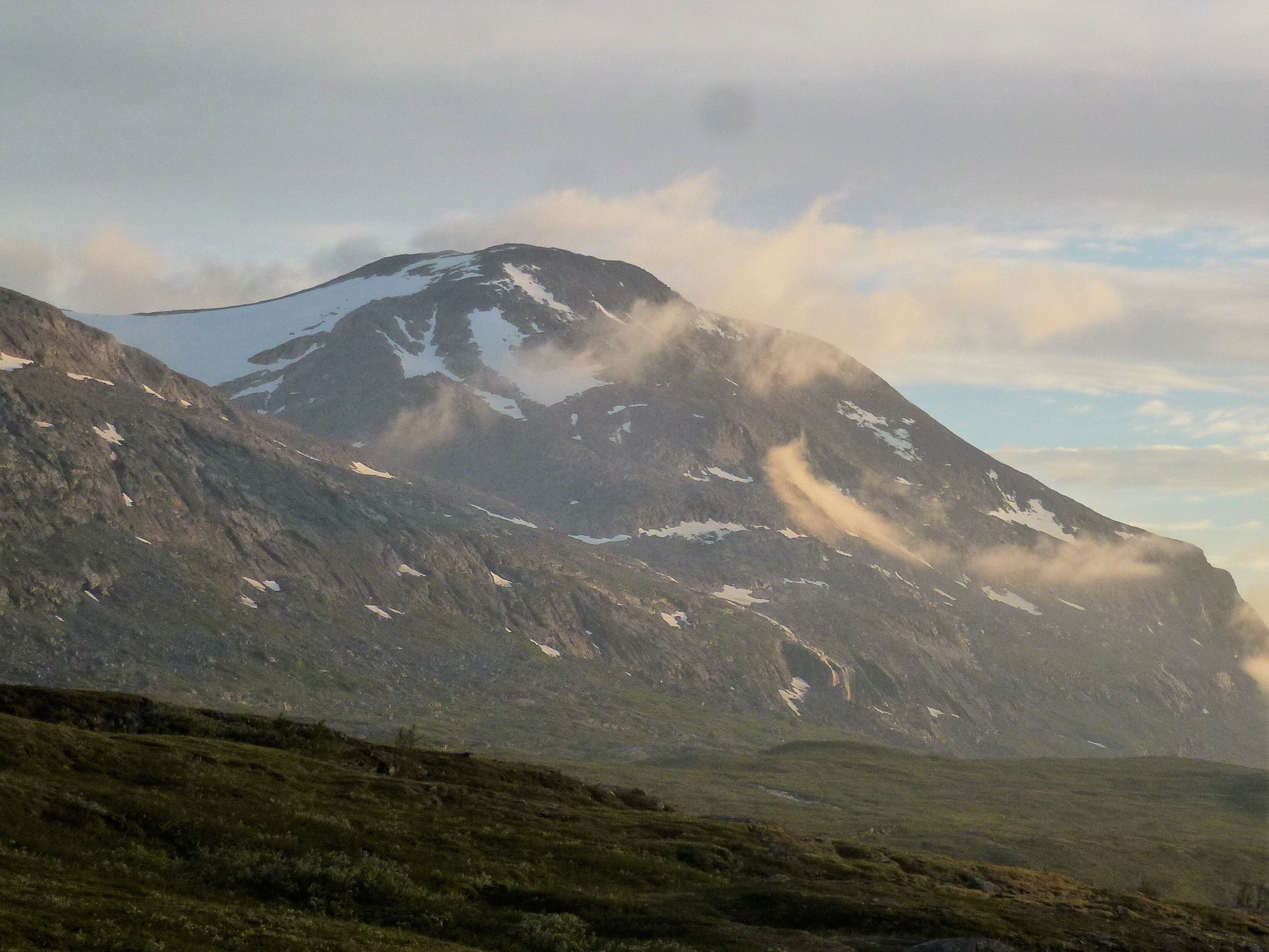 2. Tag: Rago-Nationalpark – Storskogvagnethütte: Beim Frühstück vorm Zelt eine Szenerie wie im bayrischen Voralpenland, fette, grüne Wiesen, der Fjord leuchtet hellblau, hinten schneegekränzte Berge. Wir laufen schwerbepackt mit unseren 22 kg- Rucksäcken 4 km nach Fauske-City. Auch dieses Städtchen wirkt eher spröde, aber zumindest scheint freundlich die Sonne. Wir suchen nach Wanderkarten mit mäßigem Erfolg (Padjelanta ja, Tysfjordgebiet nein), kaufen letzte Lebensmittel und stellen uns zum Trampen an die Straße nach Narvik. Vergeblich. Also nehmen wir ein Taxi, 40 km auf der E6 Richtung Norden durch eine wahre Panoramalandschaft, dann 6 km eine Stichstraße in ein schmales, grünes Tal zur letzten Ansiedlung Lakshol. Hier schultern wir unsere nunmehr 24 kg schweren Rucksäcke und unser Tripp in die nordische Wildnis kann beginnen. Mit uns stehen zwei etwa 20-jährige norwegische Wanderinnen aus Bodö am Start, die zum wiederholten Male in den Rago-Nationalpark aufbrechen.