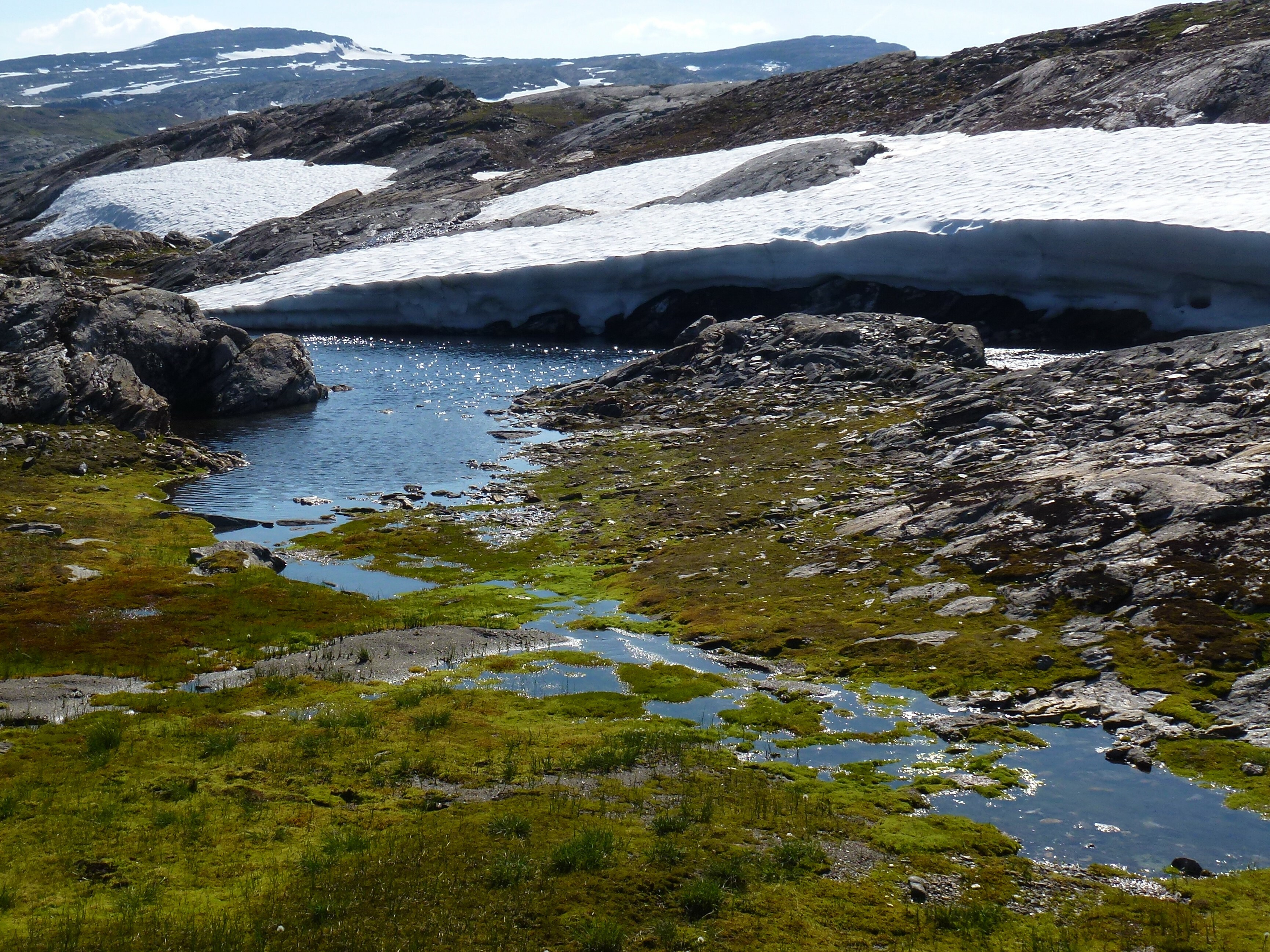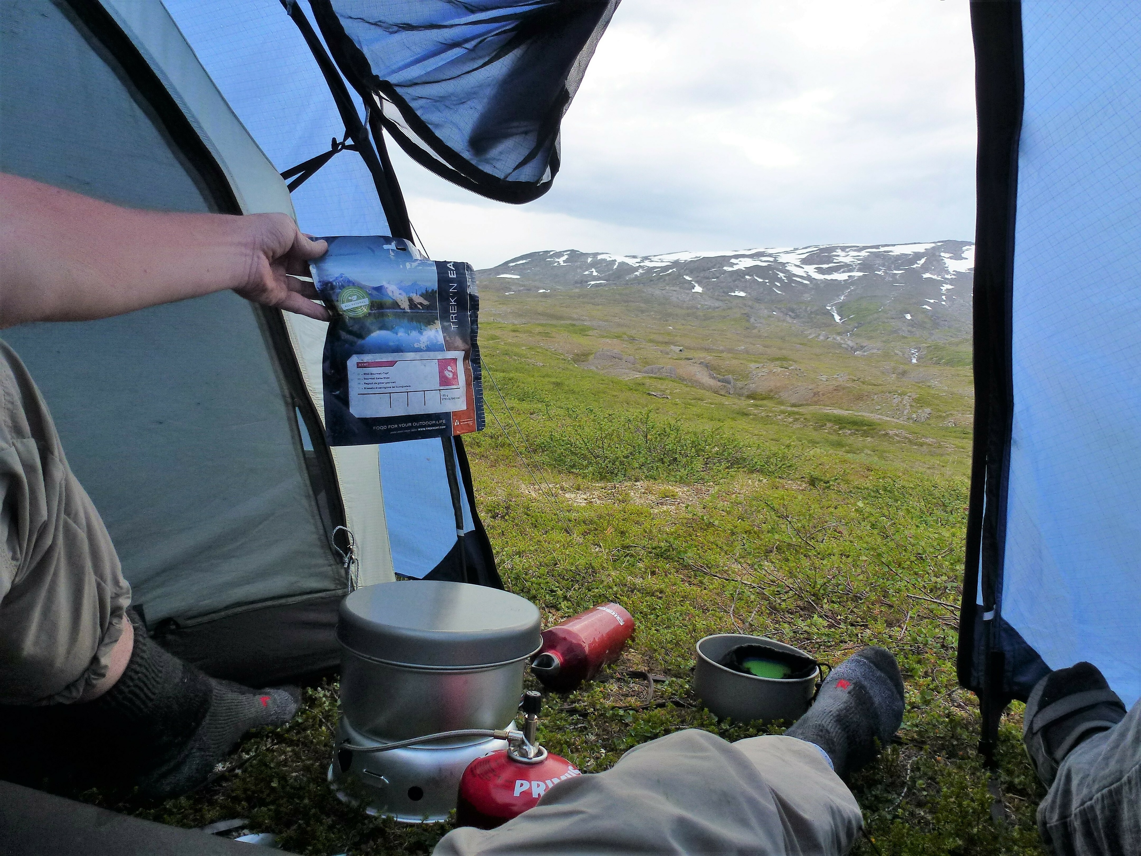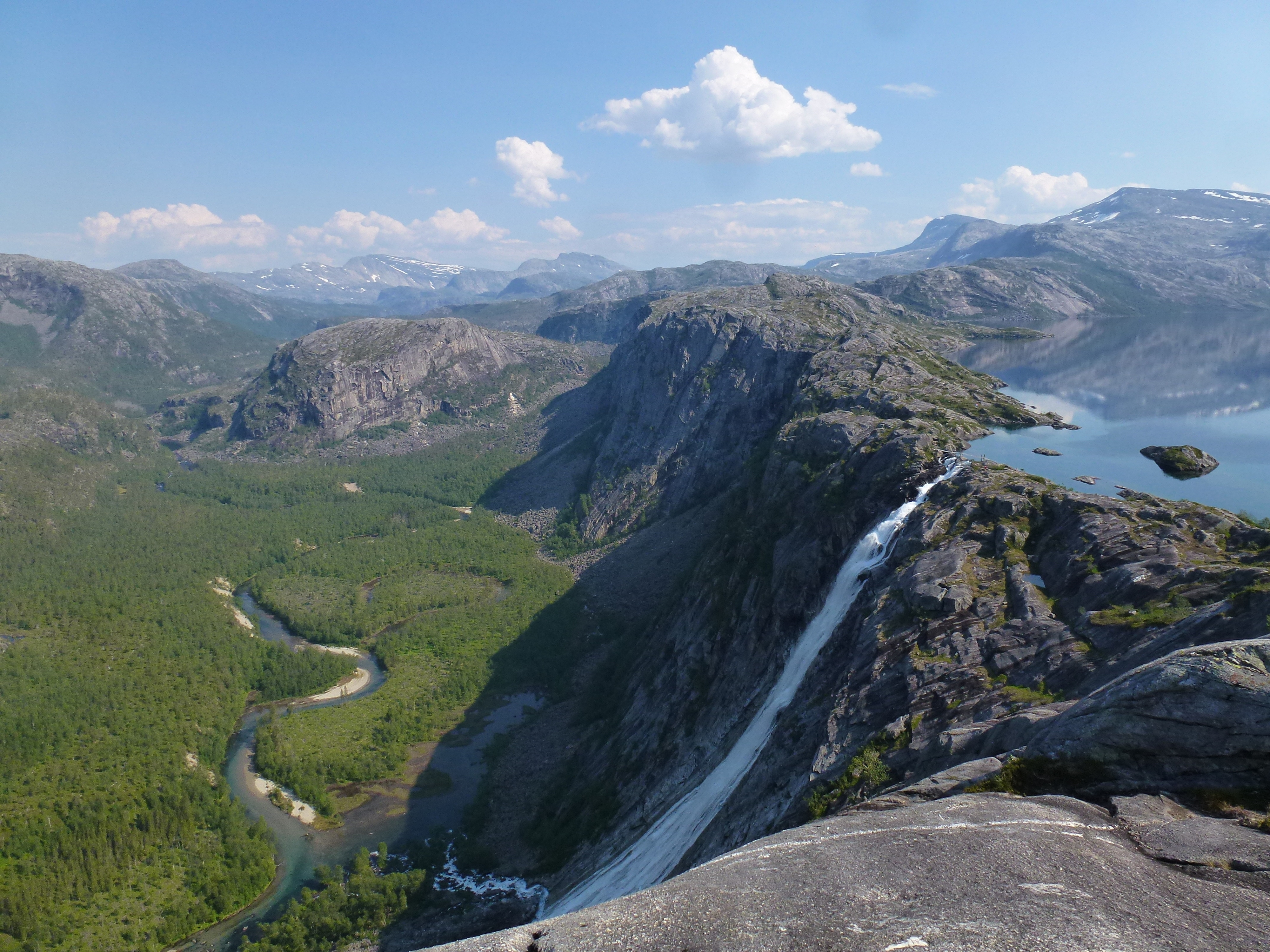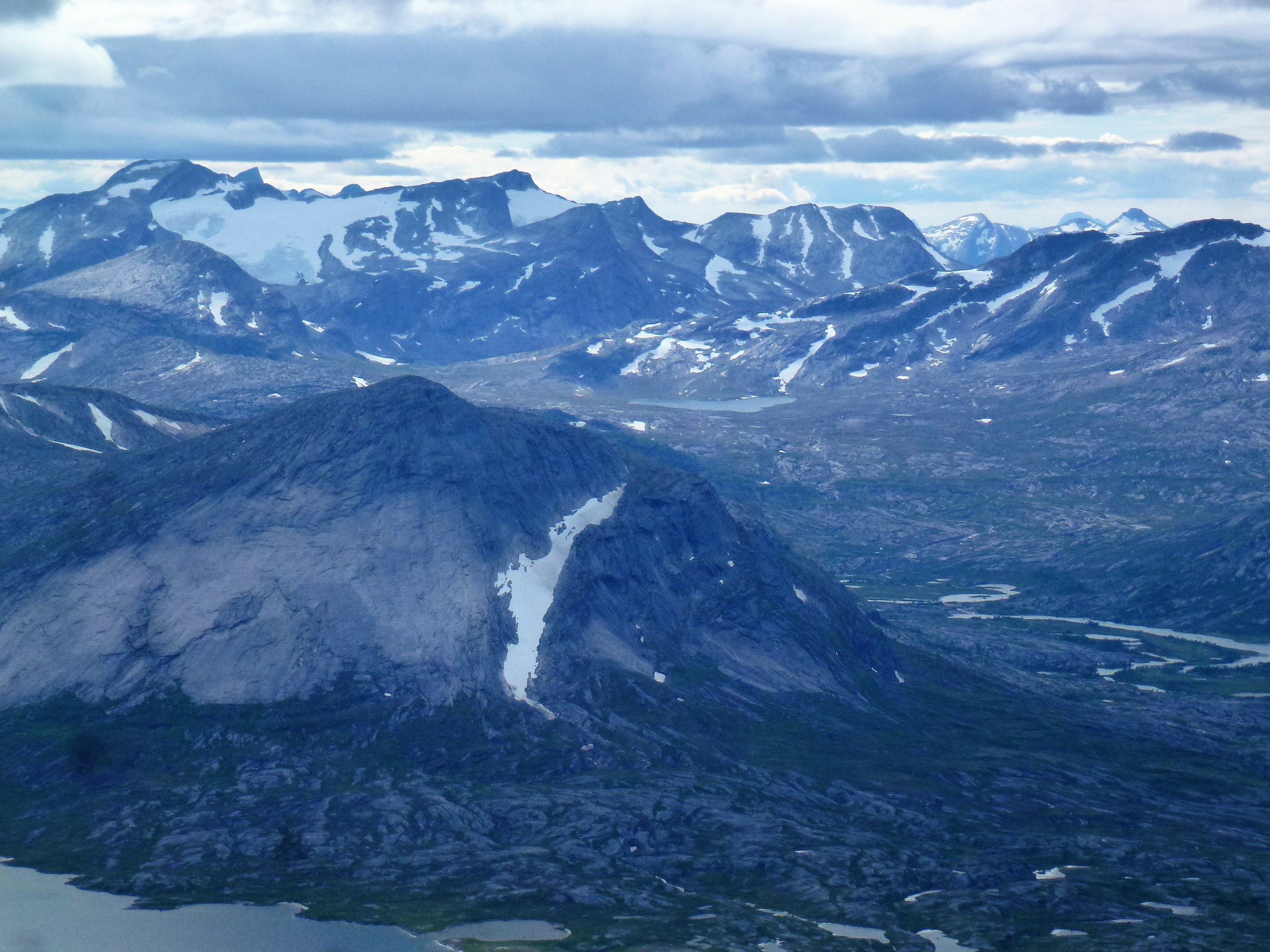 2. Tag: Rago-Nationalpark – Storskogvagnethütte: Beim Frühstück vorm Zelt eine Szenerie wie im bayrischen Voralpenland, fette, grüne Wiesen, der Fjord leuchtet hellblau, hinten schneegekränzte Berge. Wir laufen schwerbepackt mit unseren 22 kg- Rucksäcken 4 km nach Fauske-City. Auch dieses Städtchen wirkt eher spröde, aber zumindest scheint freundlich die Sonne. Wir suchen nach Wanderkarten mit mäßigem Erfolg (Padjelanta ja, Tysfjordgebiet nein), kaufen letzte Lebensmittel und stellen uns zum Trampen an die Straße nach Narvik. Vergeblich. Also nehmen wir ein Taxi, 40 km auf der E6 Richtung Norden durch eine wahre Panoramalandschaft, dann 6 km eine Stichstraße in ein schmales, grünes Tal zur letzten Ansiedlung Lakshol. Hier schultern wir unsere nunmehr 24 kg schweren Rucksäcke und unser Tripp in die nordische Wildnis kann beginnen. Mit uns stehen zwei etwa 20-jährige norwegische Wanderinnen aus Bodö am Start, die zum wiederholten Male in den Rago-Nationalpark aufbrechen.