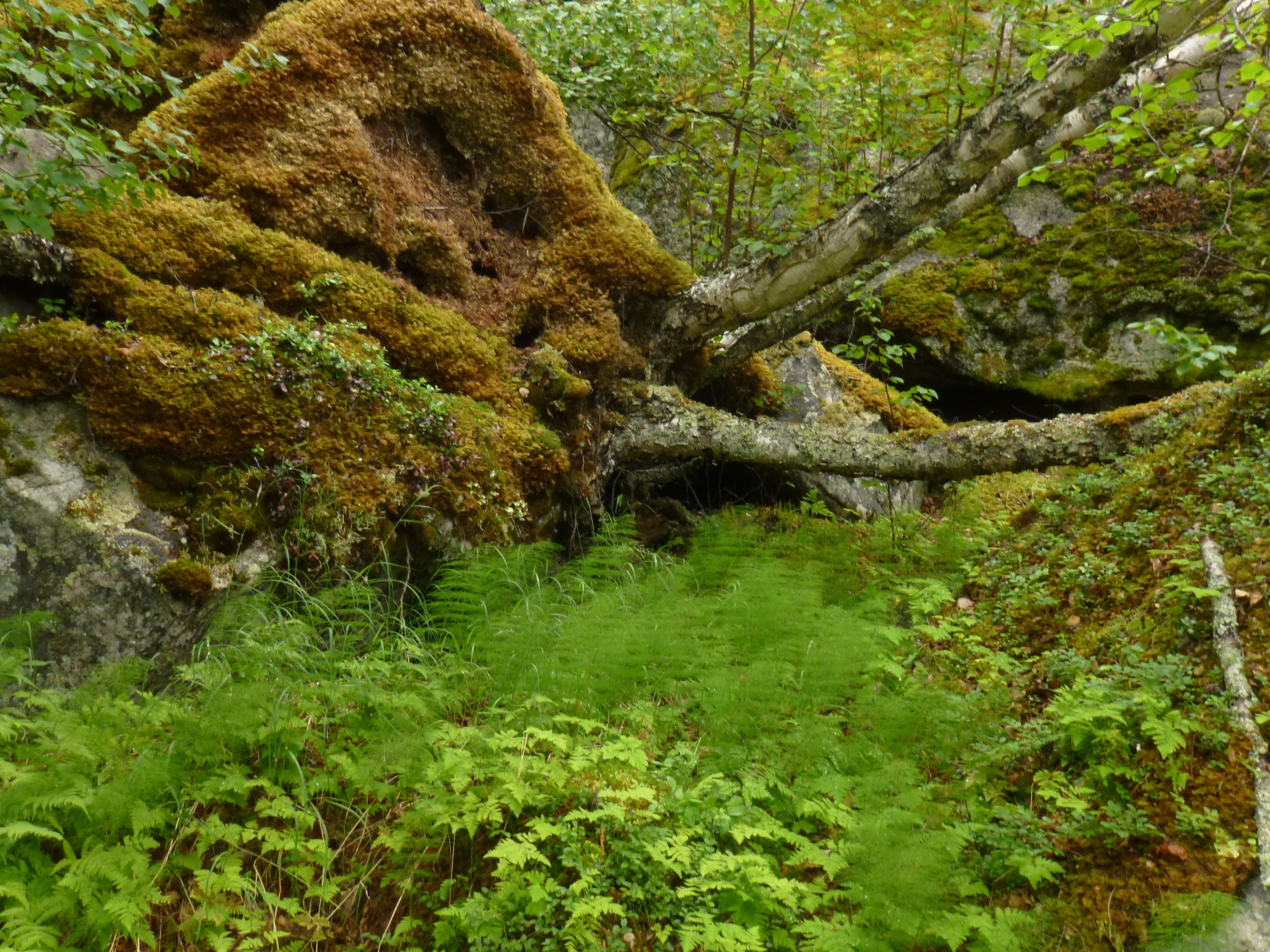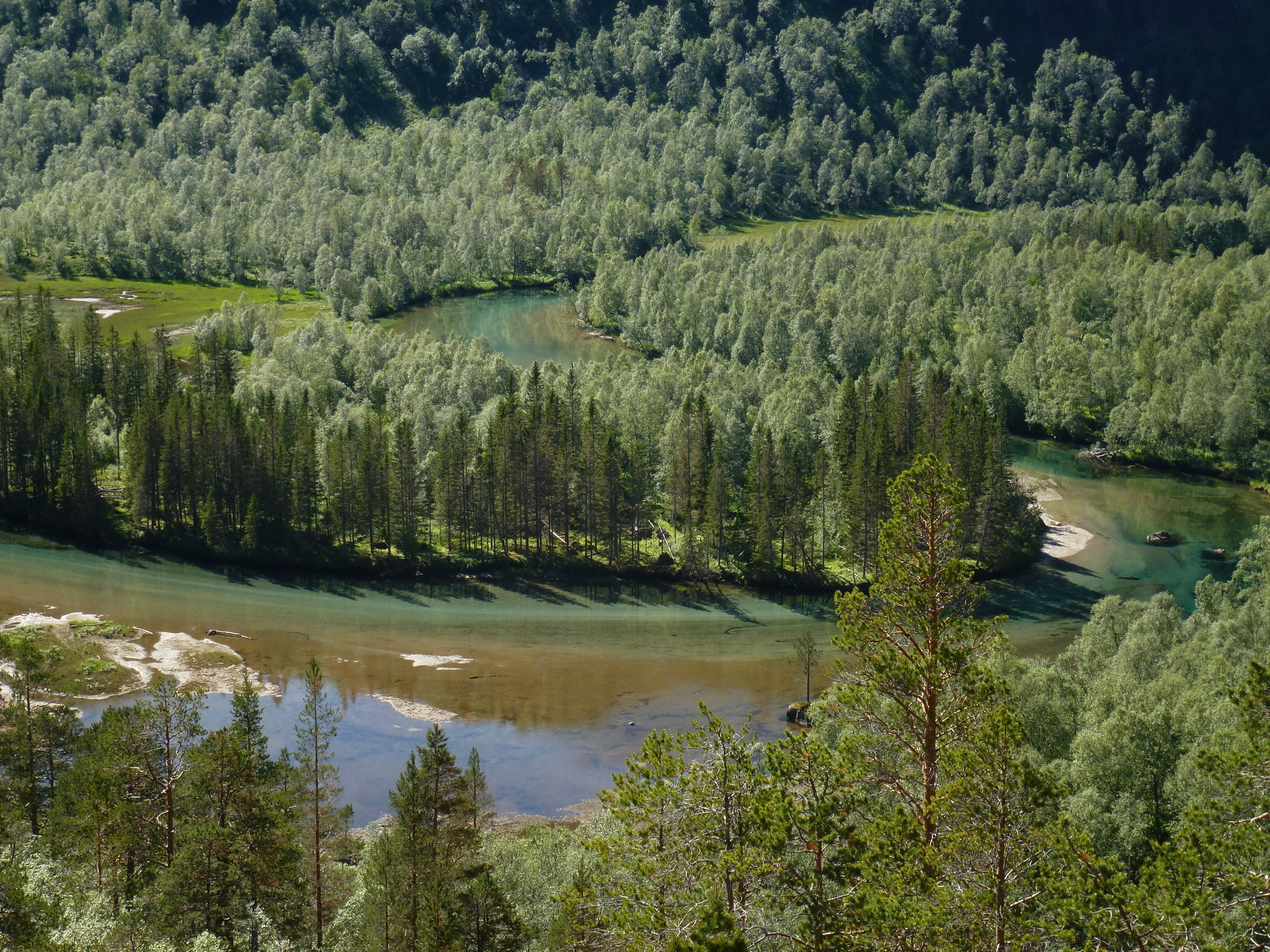 Der Pfad zieht anschließend in viel Auf-und-Ab durch Birken, Fichten und Kiefern, zwischendurch begeisternd schöne Blicke auf den grünen Wildfluss.