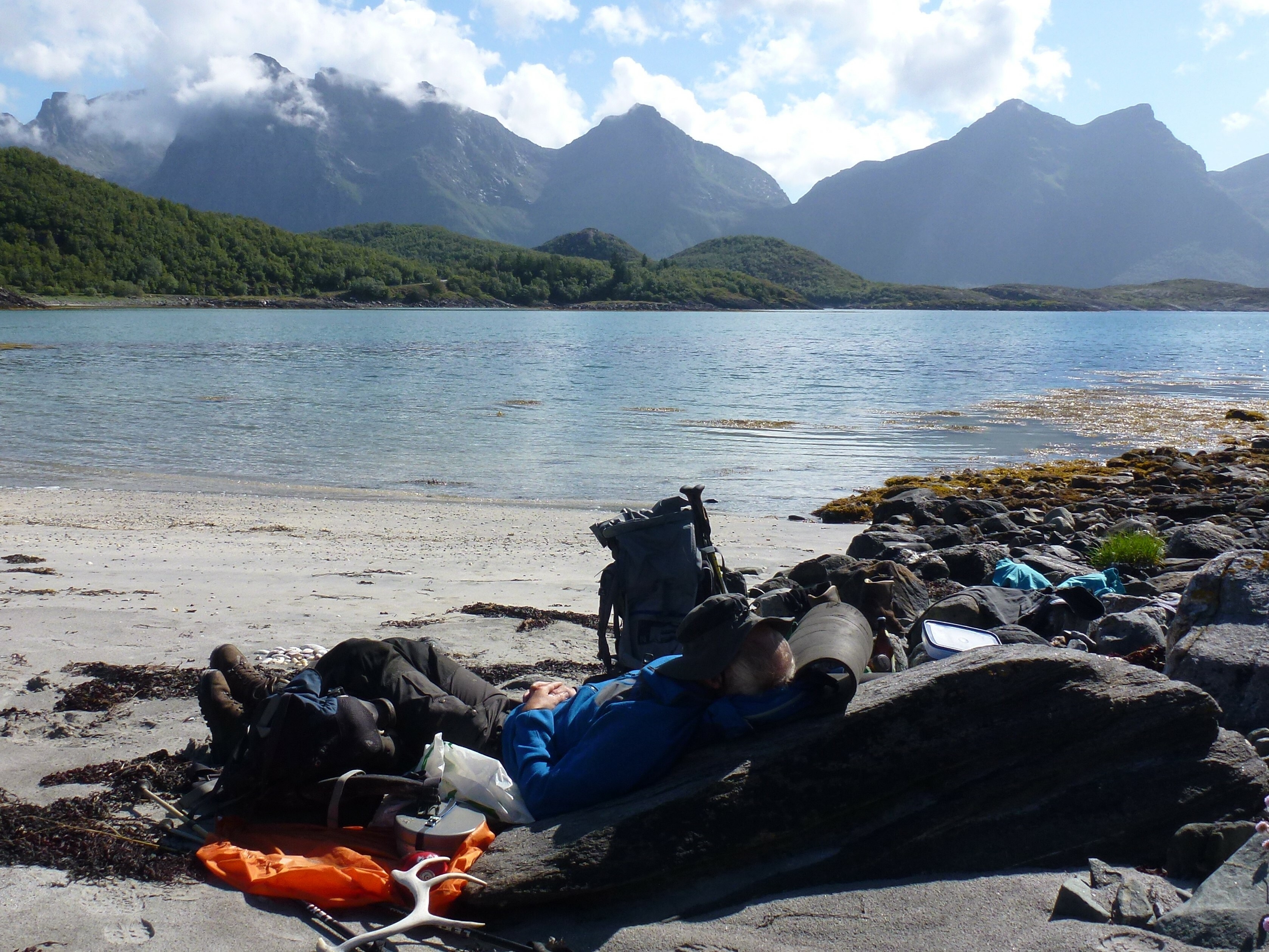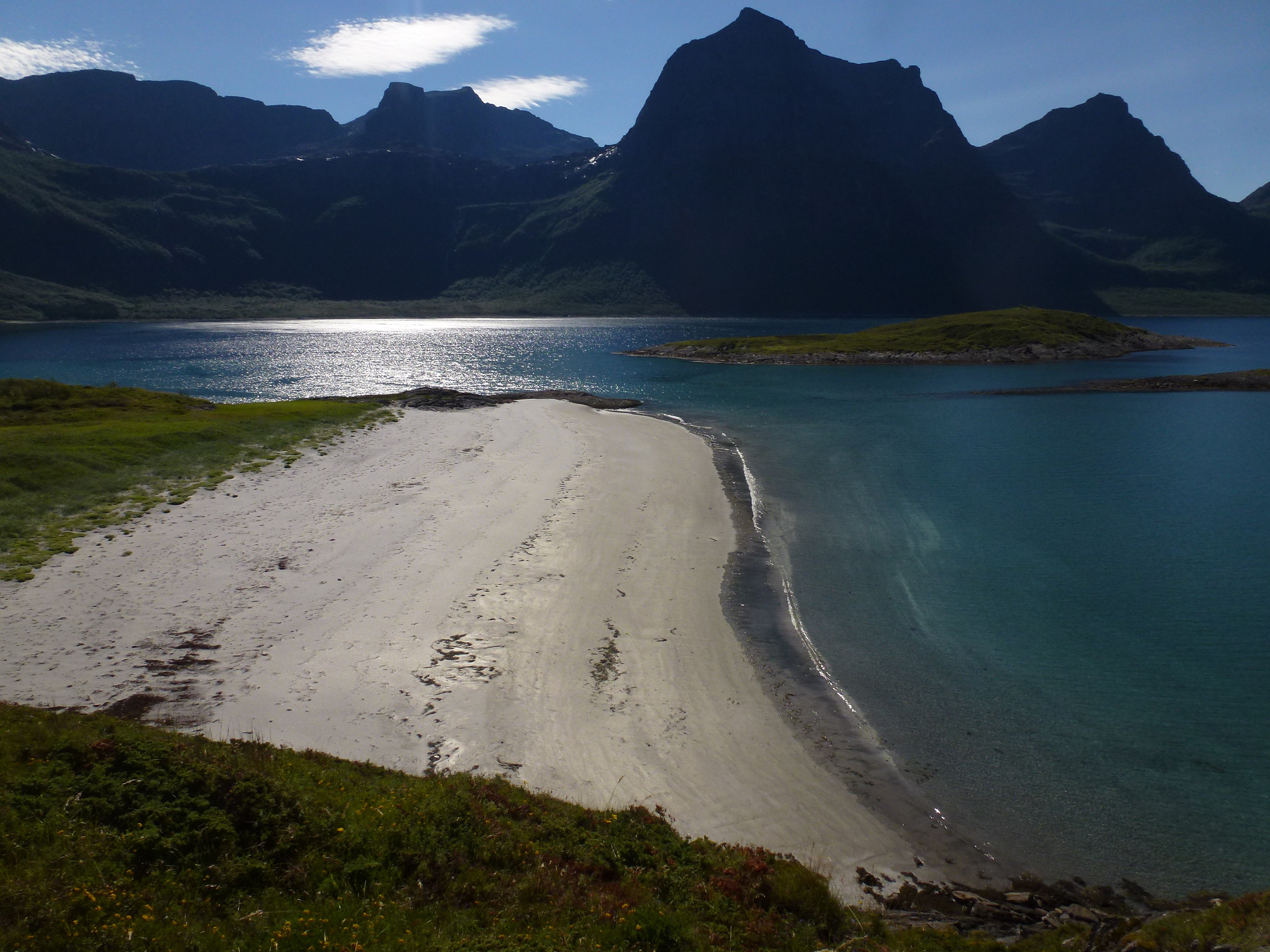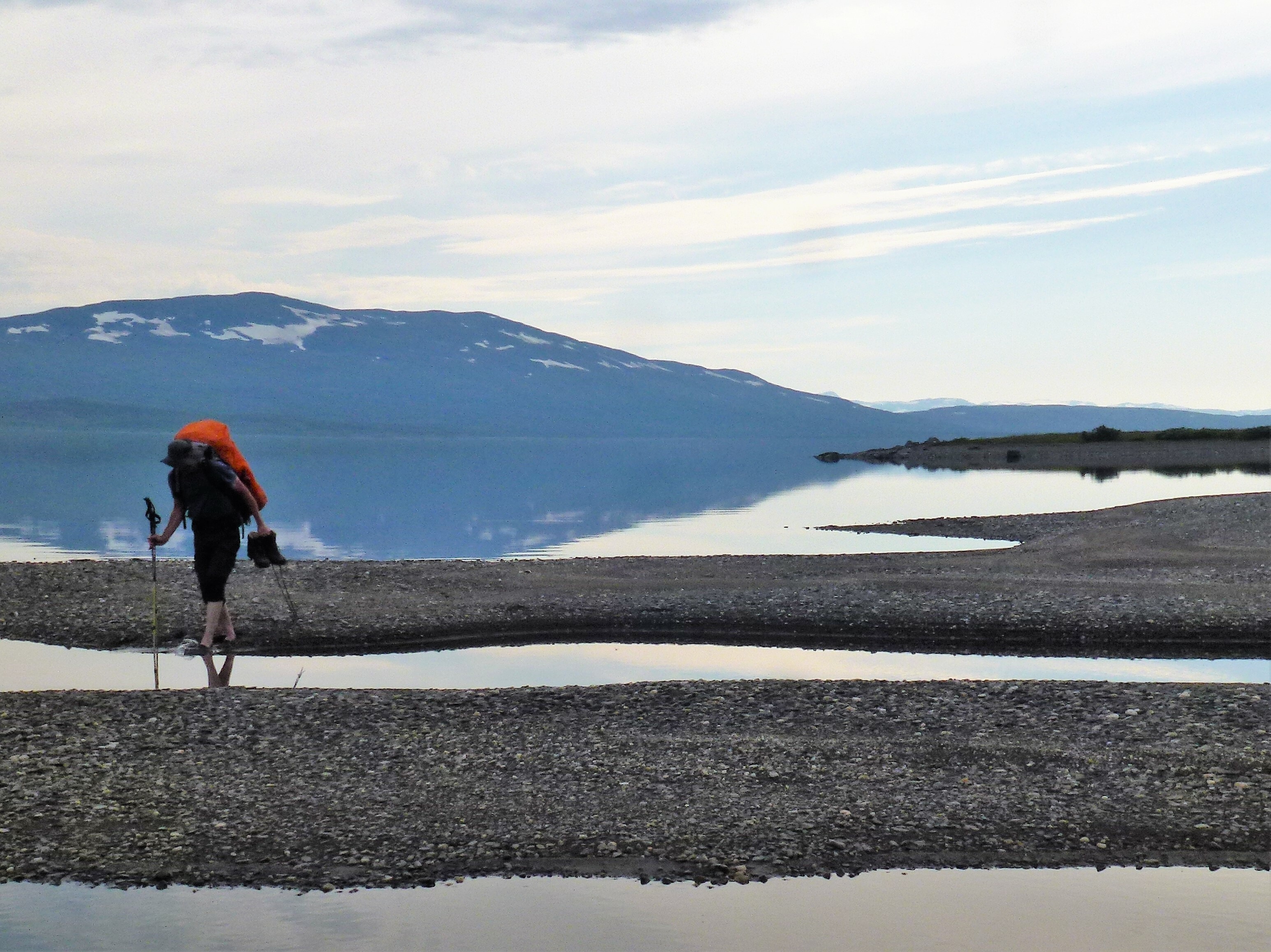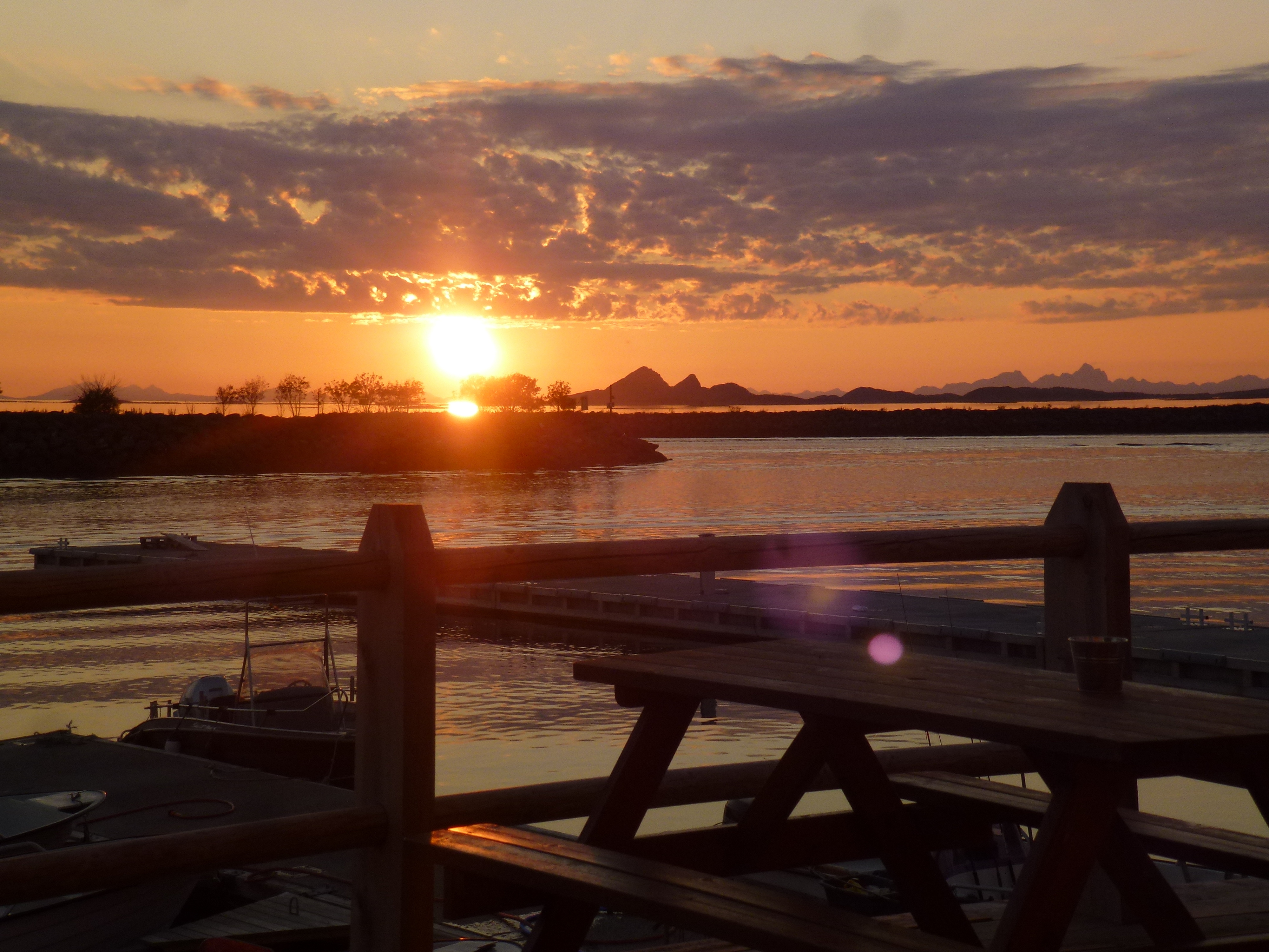 1. Tag: Frankfurt – Bodö – Fauske: Früher Flug von Frankfurt nach Oslo, dann weiter von Oslo in die nordnorwegische Hafenstadt Bodö. Europa einschließlich Südskandinavien liegt seit Wochen unter einer außergewöhnlichen Sonnen- und Hitzeglocke, die Wiesen am Flughafen von Oslo sind braun verbrannt, erst hoch im Norden gibt es eine Wolkendecke und in Bodö empfängt uns standesgemäß Nieselregen bei 12°. Bodö: Viel Beton, wenig Charme, kaum Menschen in den Straßen, Läden haben zu (Sonntag). Wir nehmen einen Bus und fahren 30 km einen Fjord entlang in die Kleinstadt Fauske, stellen unser Zelt auf einen netten Campingplatz und schauen in der Campingplatzküche das WM- Endspiel France: Krotia – 4:2 – France is Champion. Abendwanderung bis ans Ende einer in den Fjord ragenden Halbinsel, 5 km hin, 5 km zurück, die Wolken reißen auf, ein mildes Lüftchen weht, die Nacht bleibt hell: Seltsam.