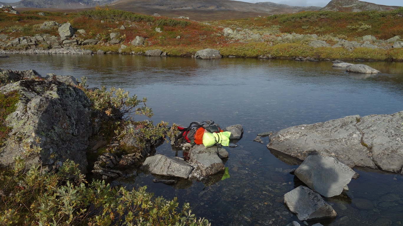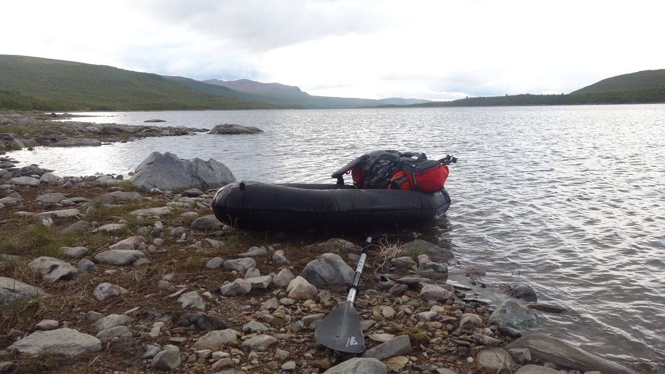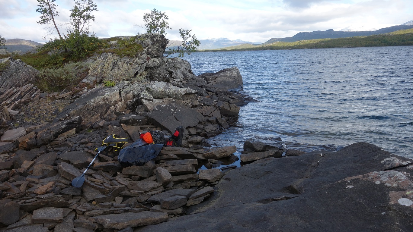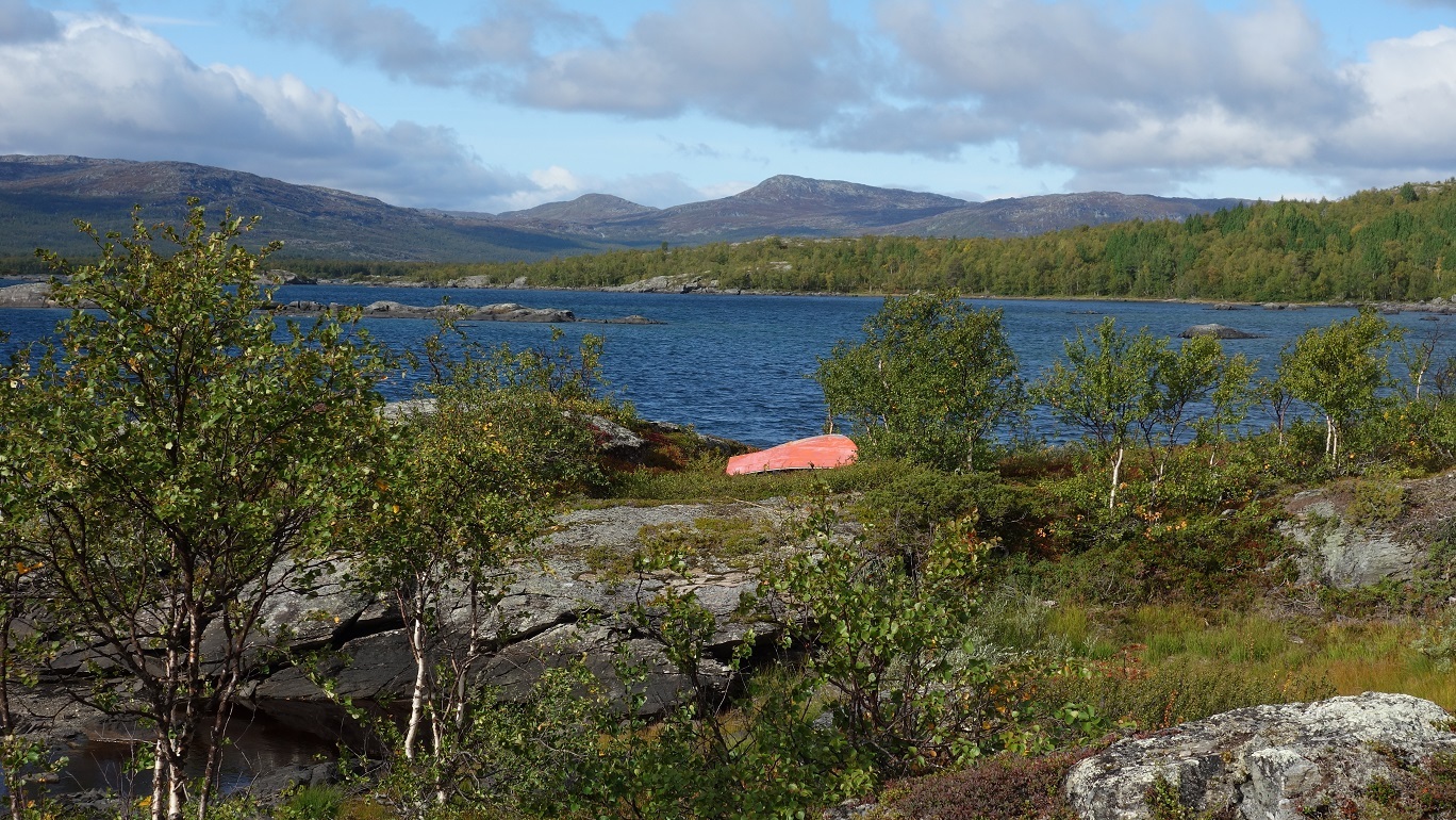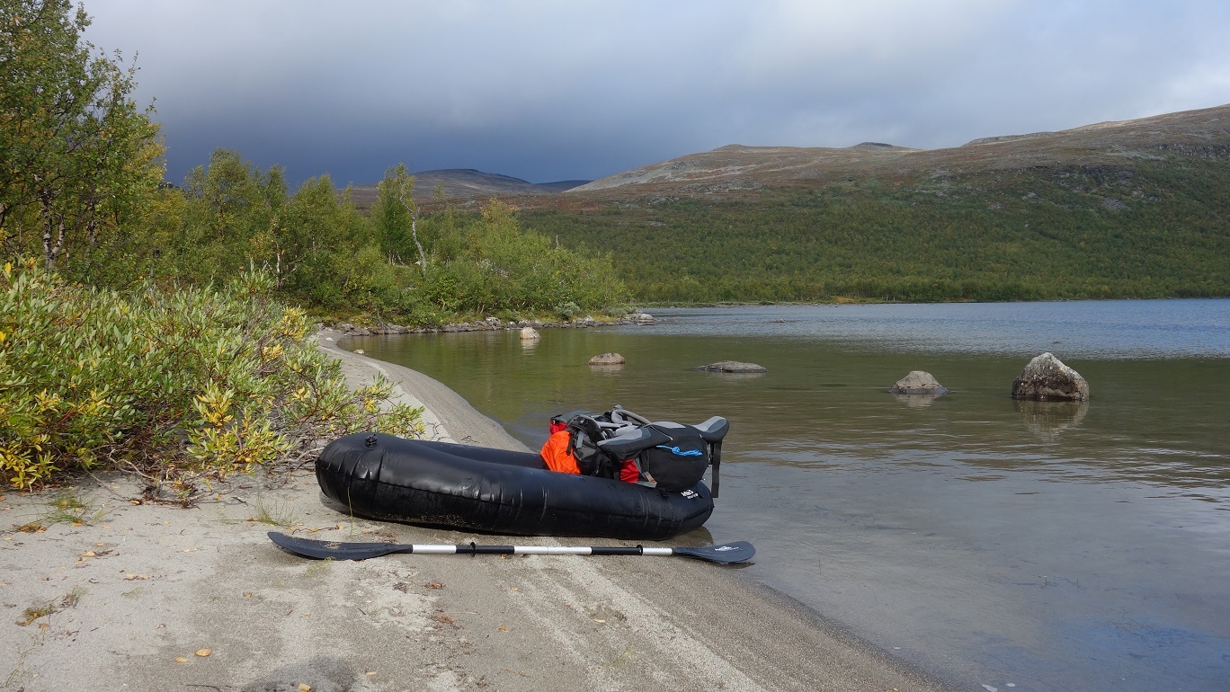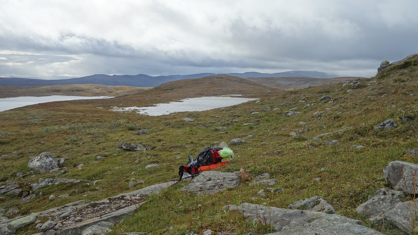 Es sollte ins Arjeplogsfjäll gehen, etwas westlich vom Kungsledenabschnitt Jäckvik - Kvikkjokk. Eine sehr abwechslungsreiche und durchaus alpine Gegend, die allerdings mit vielen feuchten Hindernissen gespickt ist ... genau das richtige Terrain, wenn man so ein Boot als Joker dabei hat. Ansonsten nur schwer auf wenigen Routen zu queren, weshalb sich hier nicht so viele Leute tummeln. Tatsächlich sollte ich 8 Tage lang niemanden treffen.... und die ersten, die ich dann traf, waren natürlich ODSler! (Bourne und seine Elisabeth)