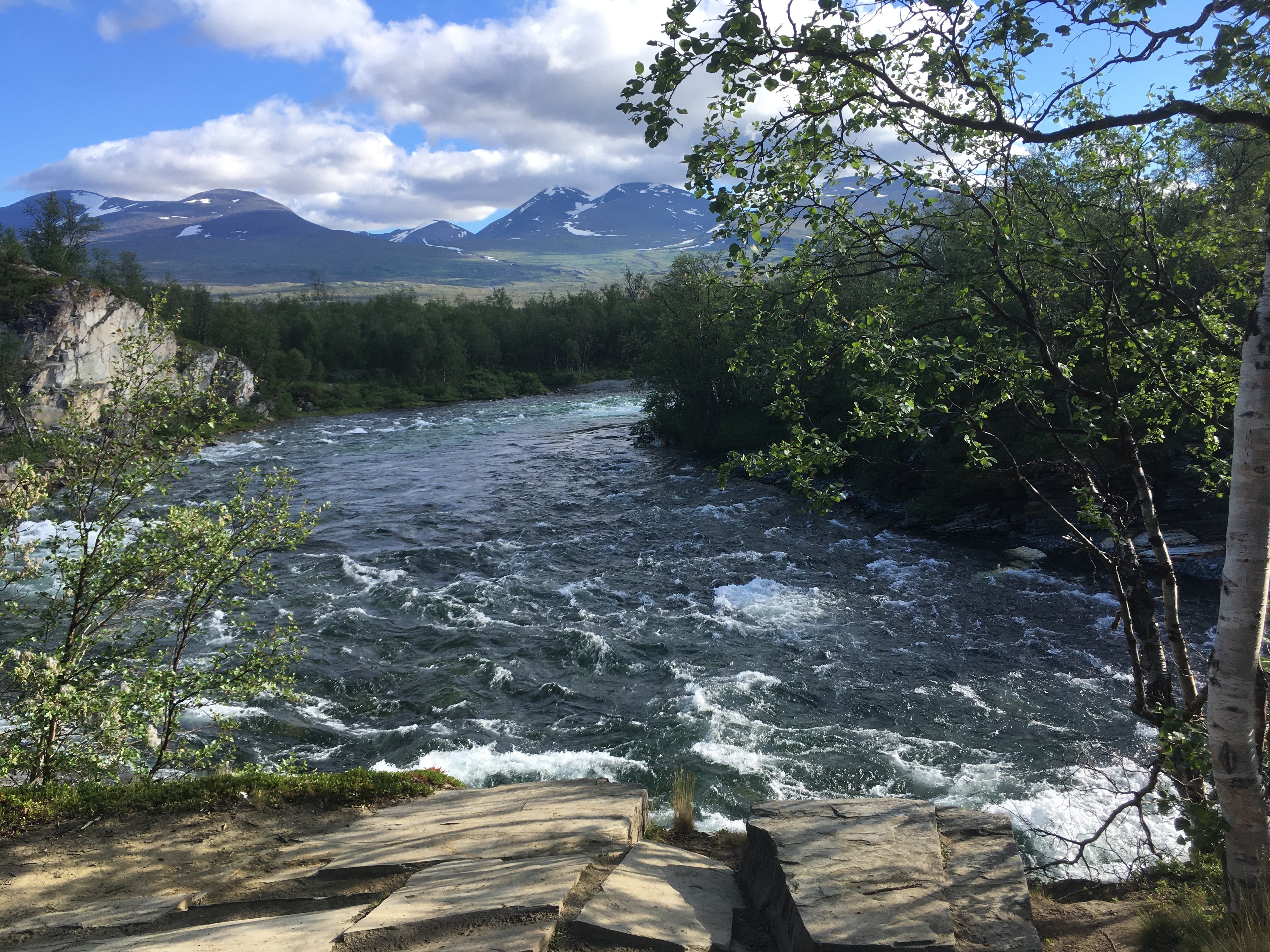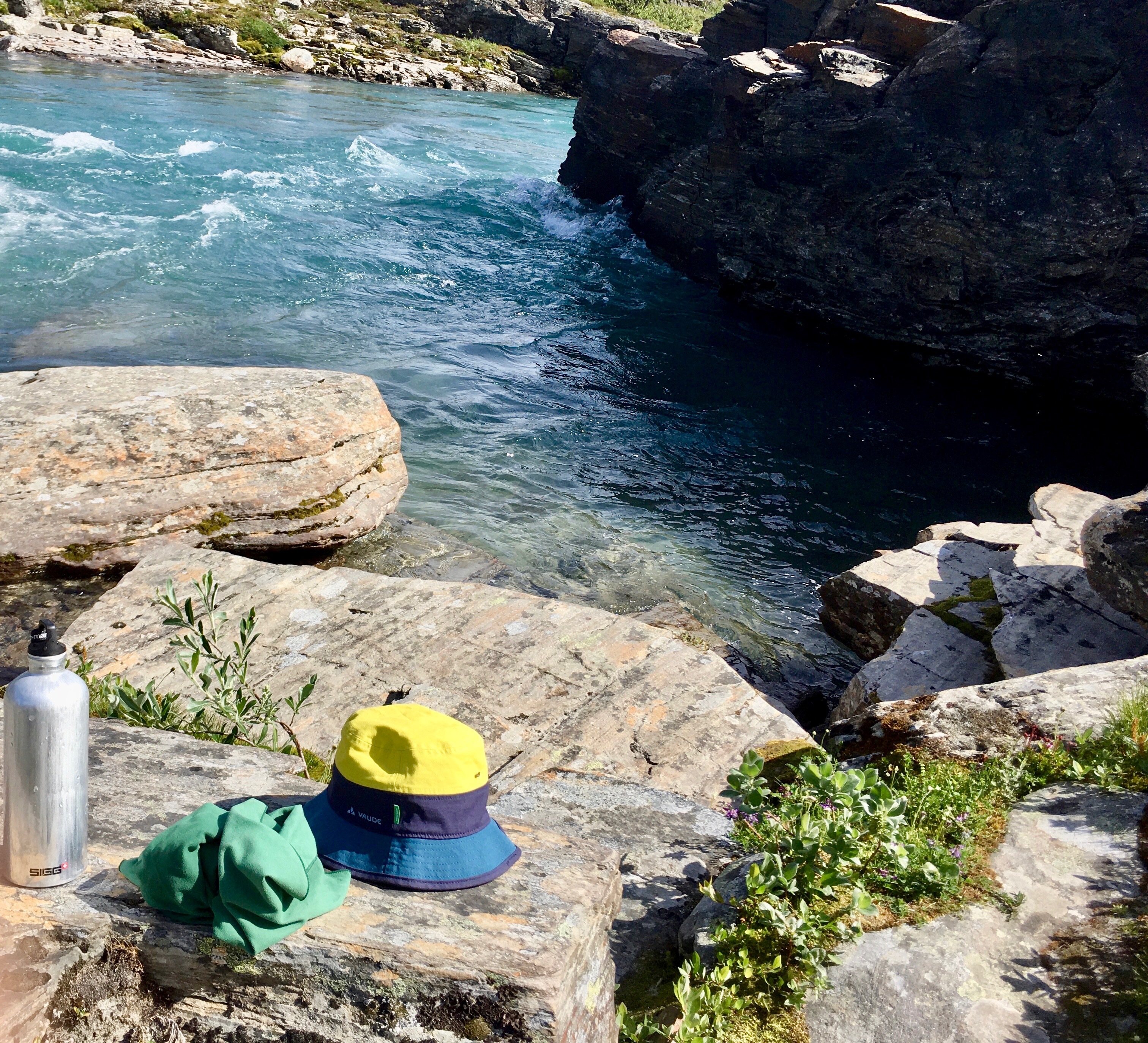 An der Kaitumjaurestugorna angekommen, traf ich auch wieder Johanna, Lina, Lisa und Patrick (vom 2. Tag), die mir dringend den Weg zum Fluss empfahlen. Ich hatte das Schild, das vom Weg abzweigte und eine Badestelle ankündigte, gesehen und mich gefragt ob sich der extra Weg wohl lohnen würde. Ihre begeisterte Beschreibung der kleinen Lagune im Fluss überzeugte mich restlos. Und so liess ich alles stehn und liegen und ging die angegeben 360m (?) zum Fluss. Wow! Es war schlicht fantastisch! Das Wasser in der schön türkis-blauen Farbe schoss in wilden Stromschnellen den Berg herunter, aber an einem kleinen Privatstrand gab es eine strömungsfreie «Badewanne» mit «Treppe» zum Einsteigen. Sehr empfehlenswert. (Auch mal wieder dringend nötig. Und sowieso war es hier noch dazu erstaunlich Mücken frei.)