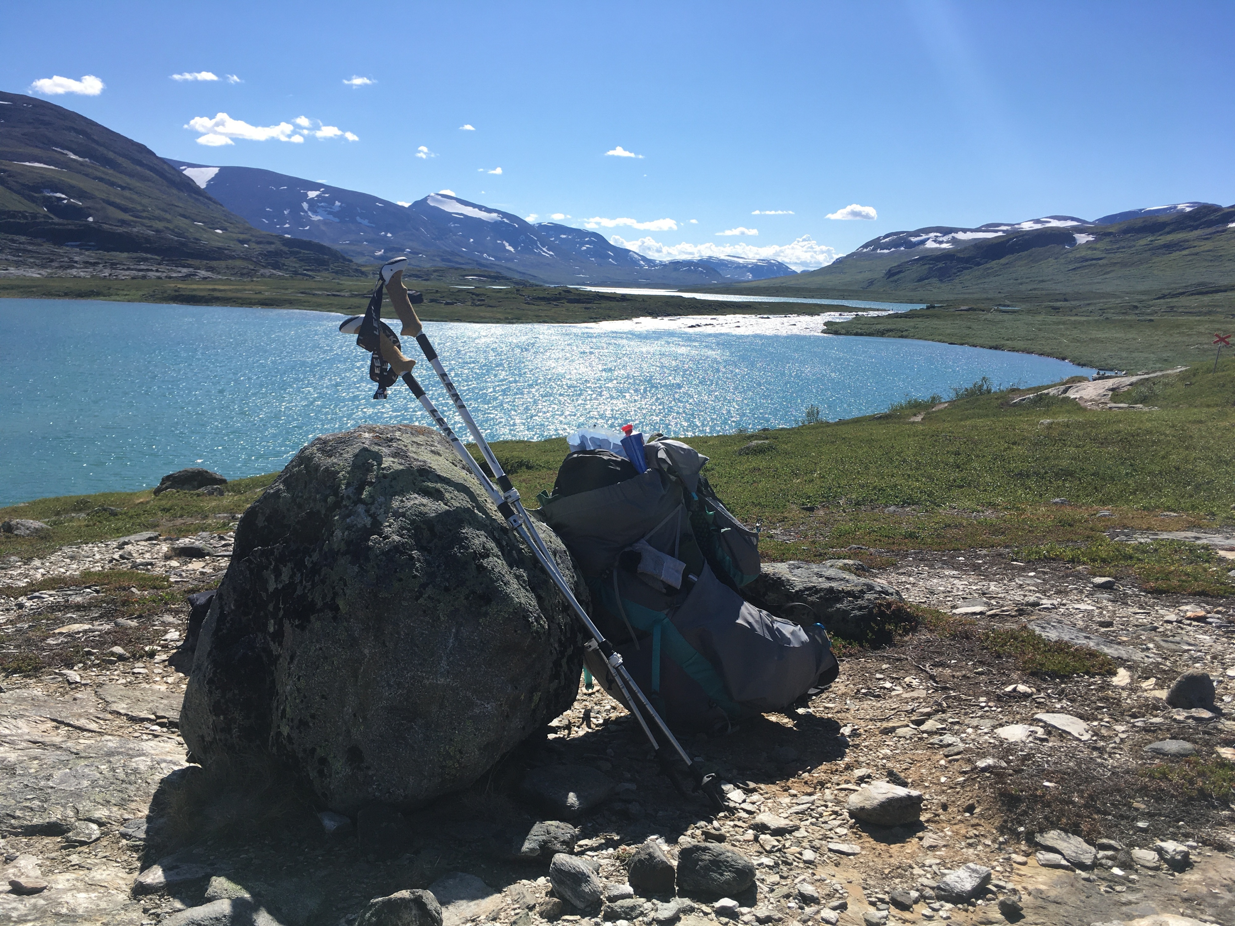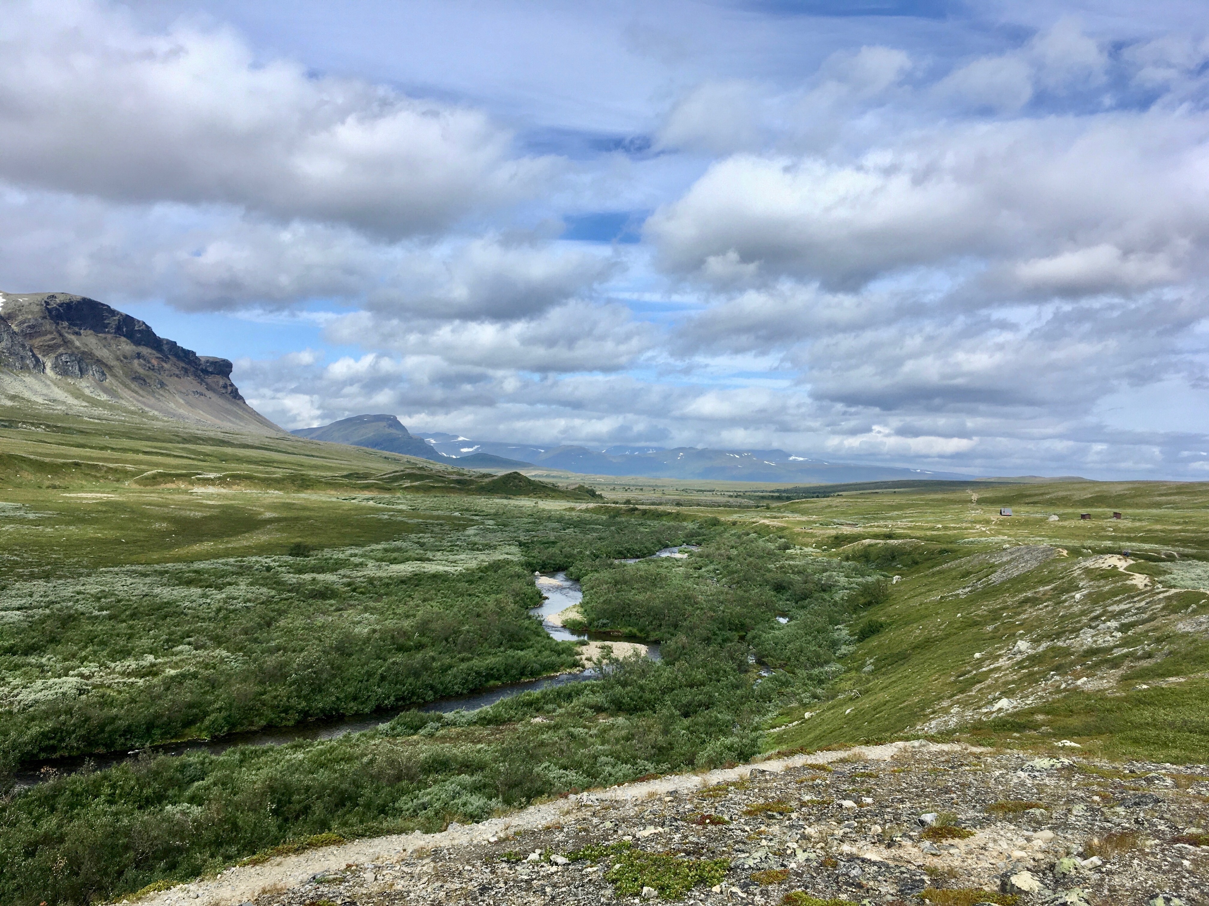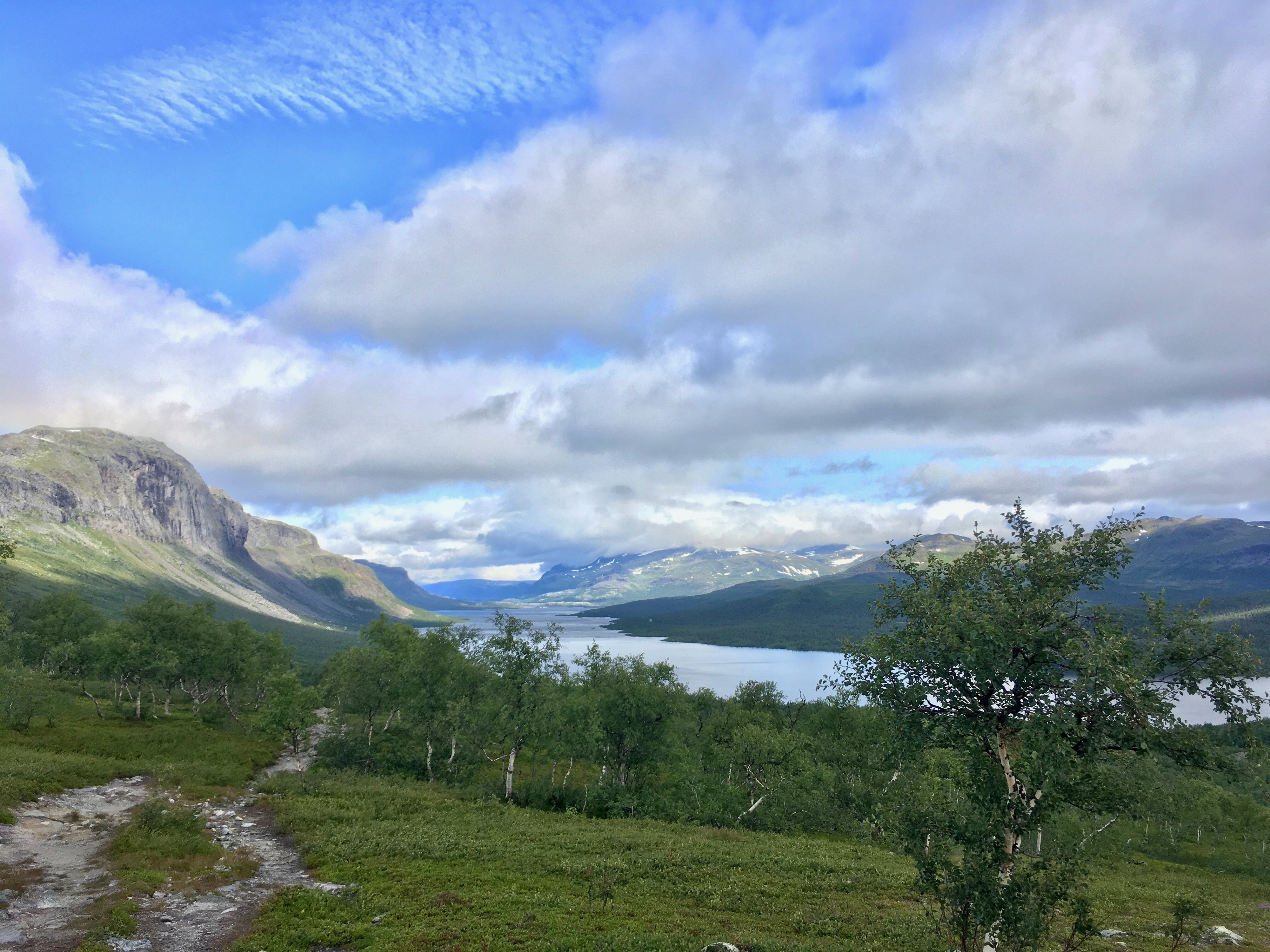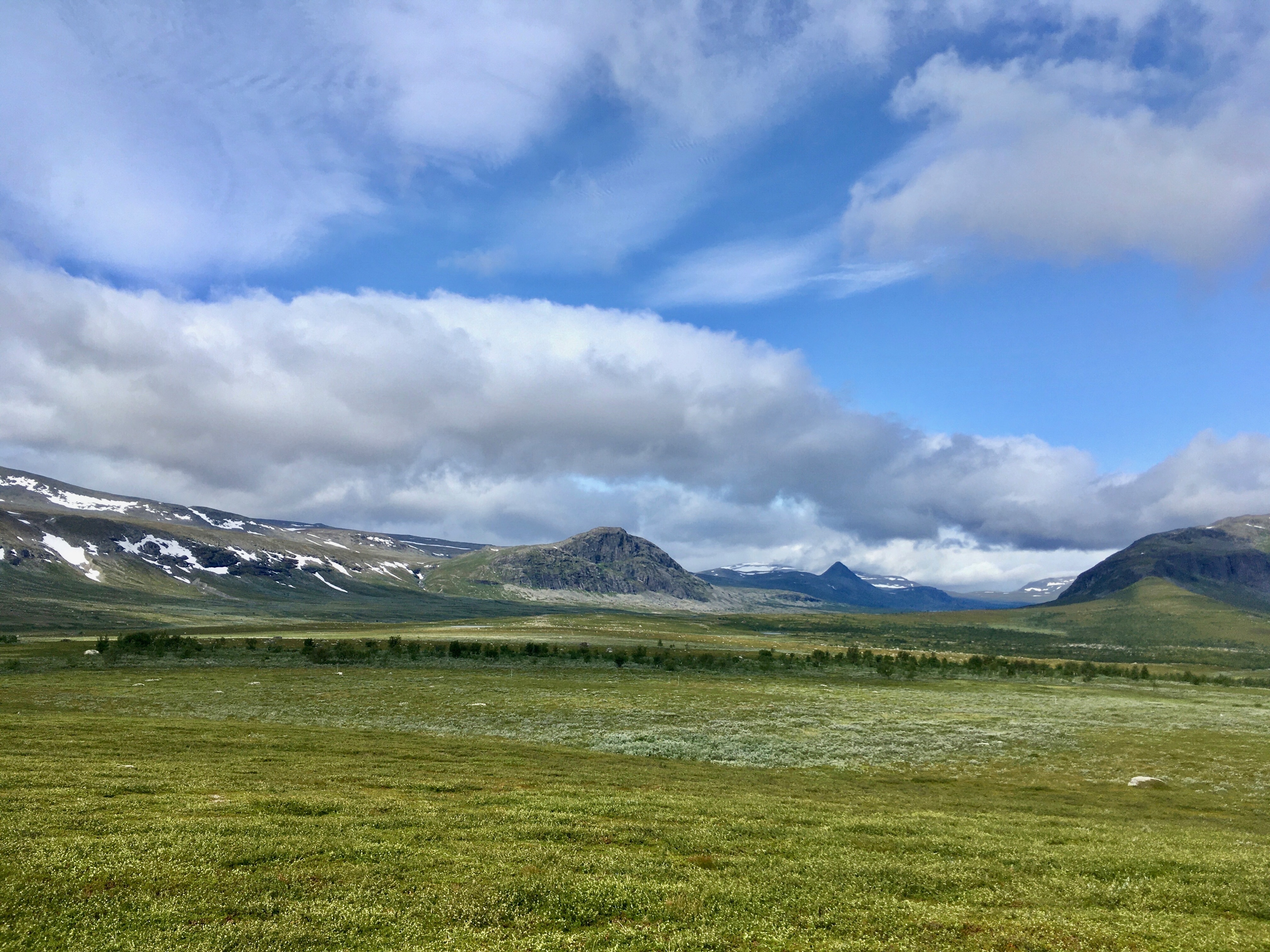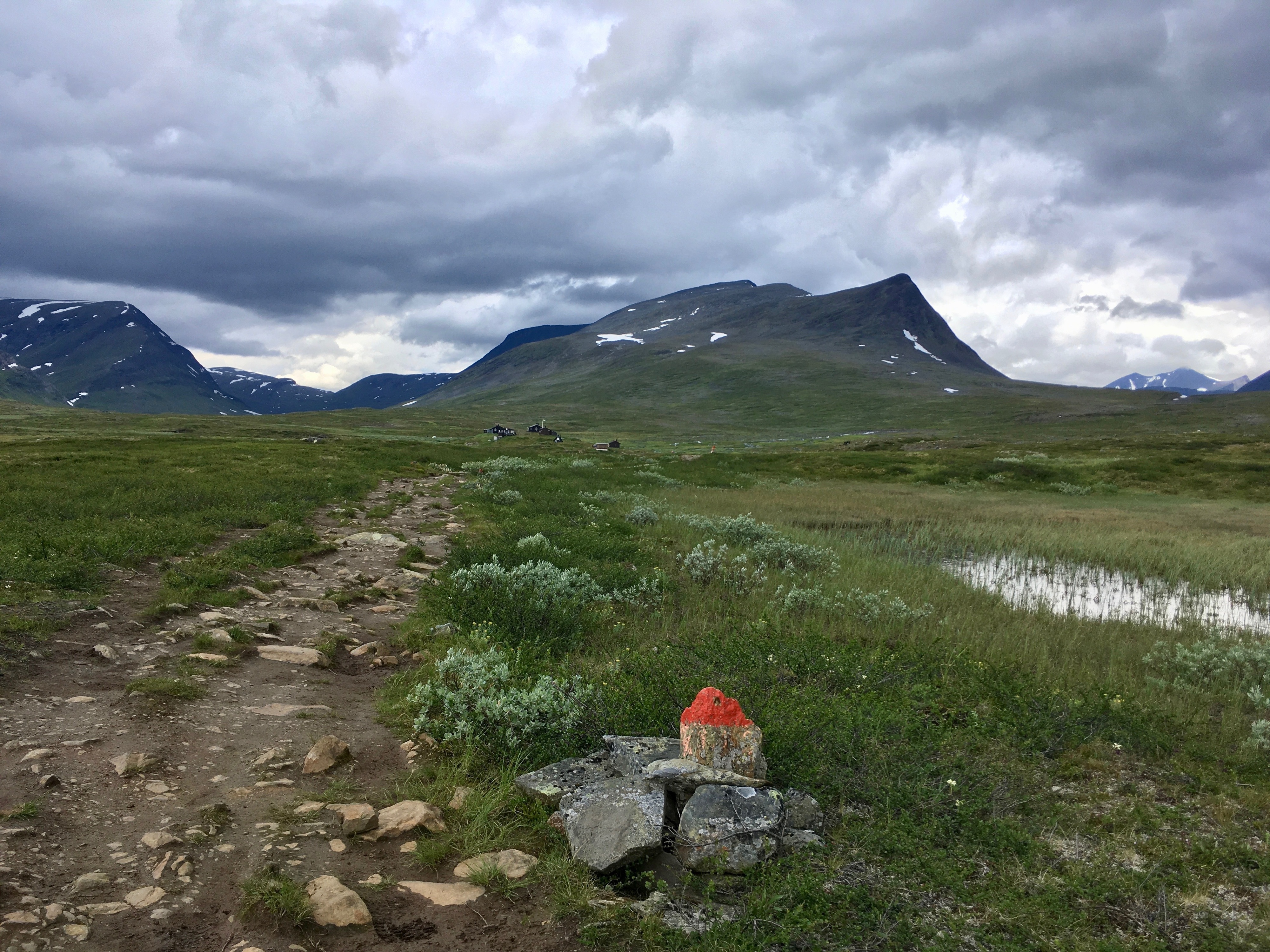 Nach anfänglich dramatischem Himmel wurde heute wieder ein sonnig heisser Tag auf dem Kungsleden. Pausen mussten gut mit den Menschen vor und hinter mir koordiniert werden. Nicht nachdem überholen einer Person gleich Pause machen. Nicht die Pause aufhören, wenn gerade eine Person näherkommt. Wo und wann aufs Klo? Logistik auf dem Kungsleden.