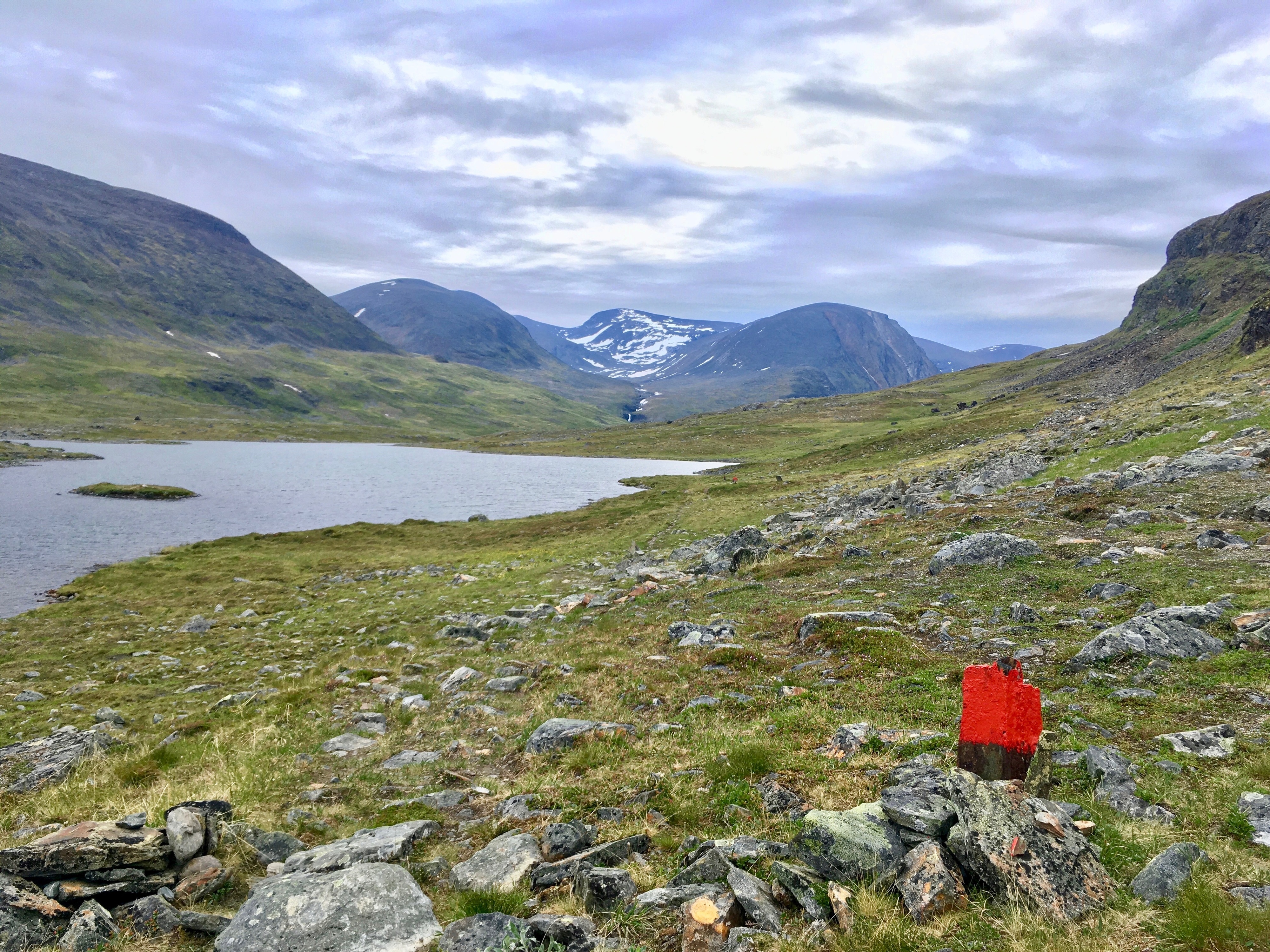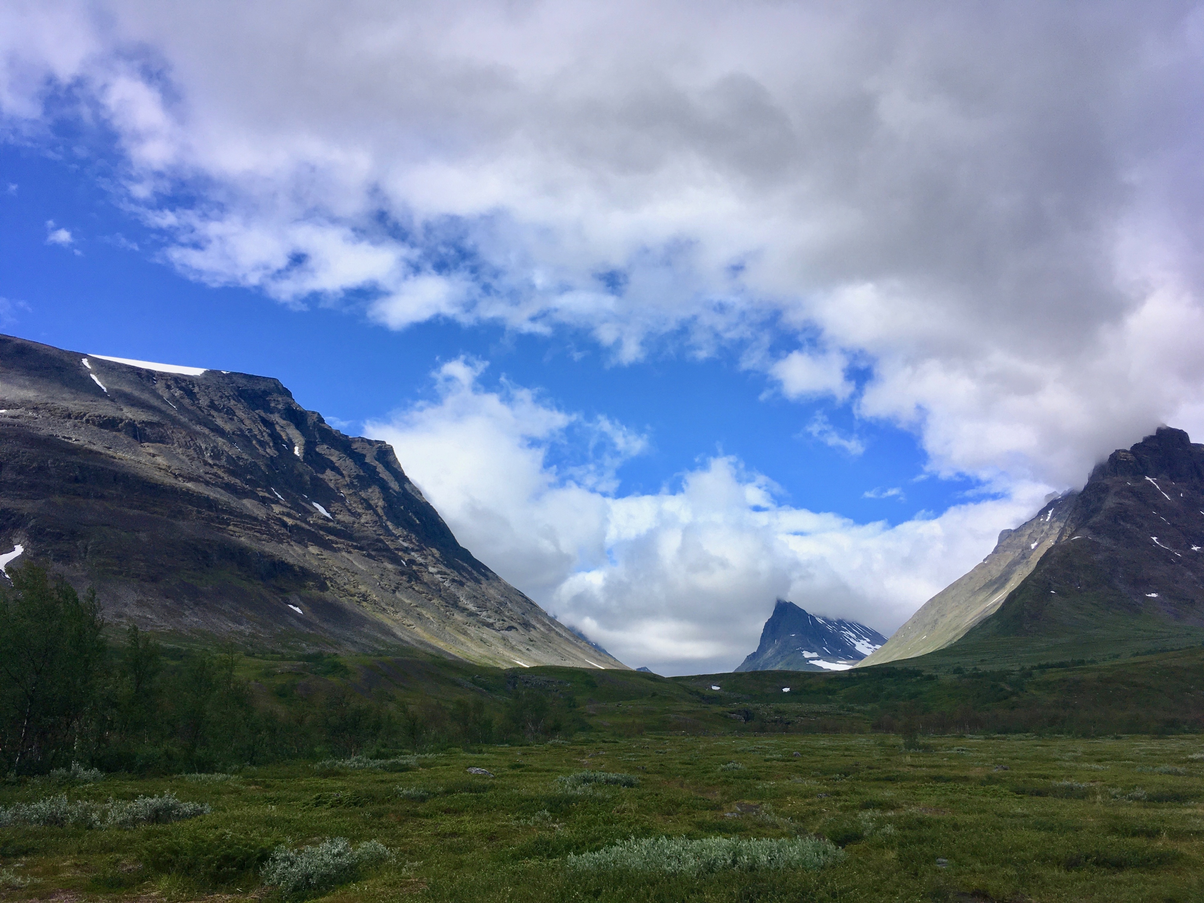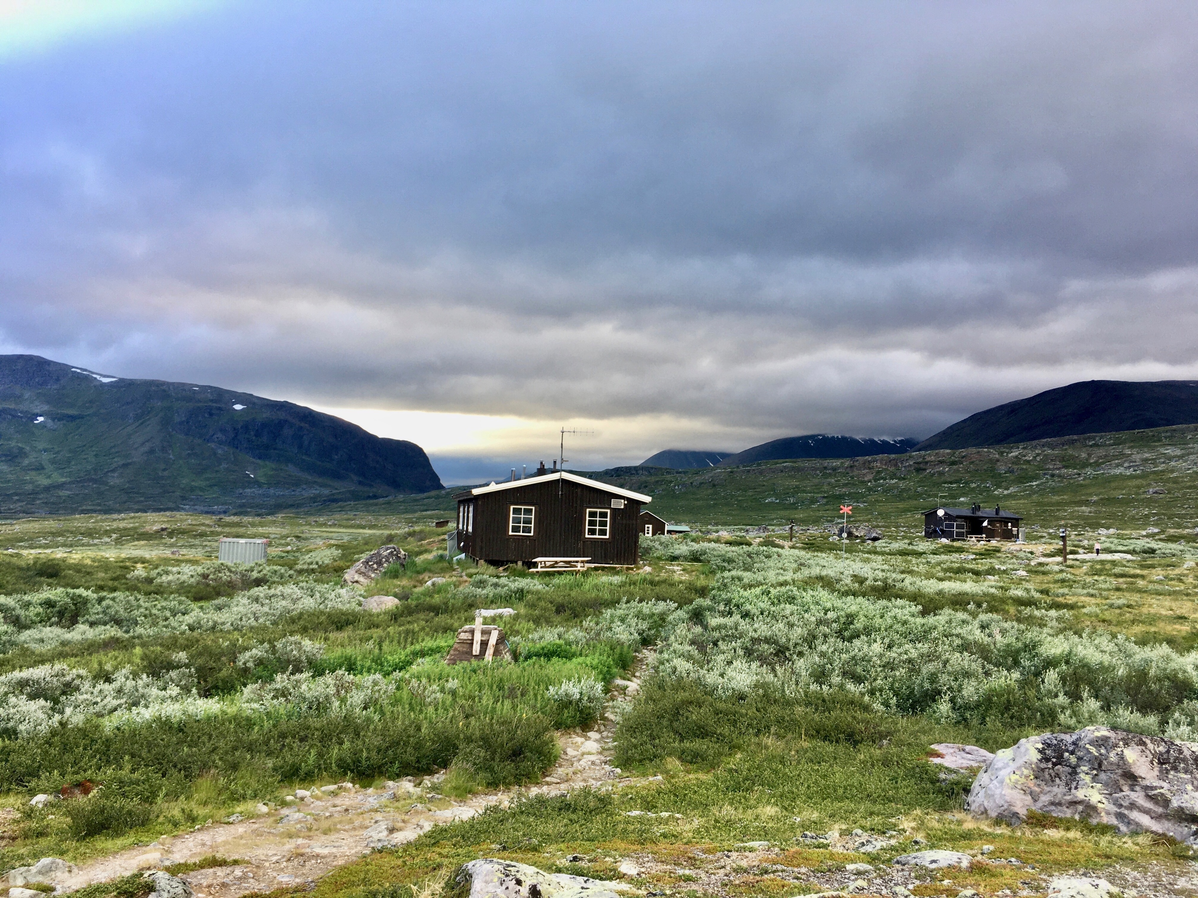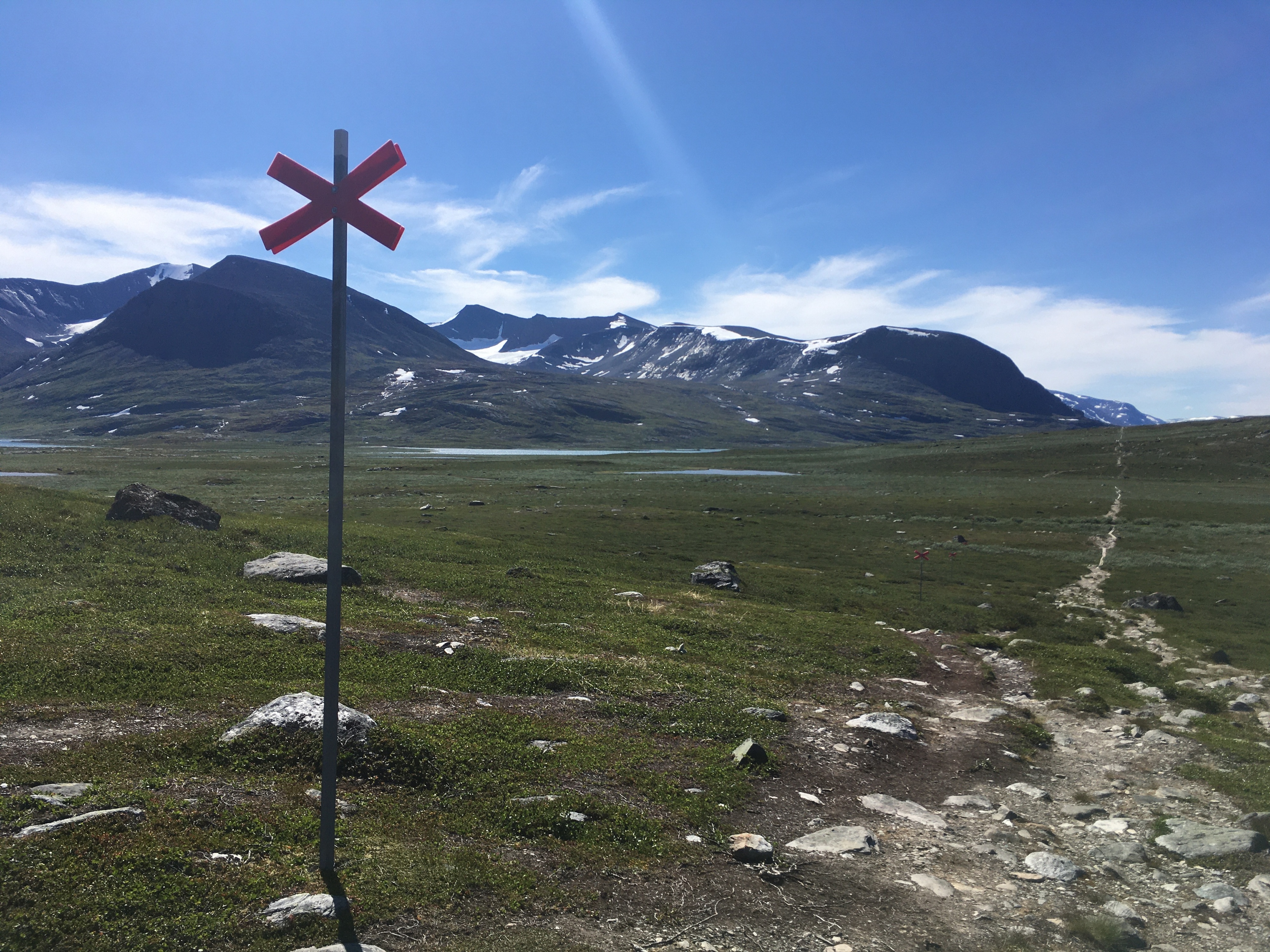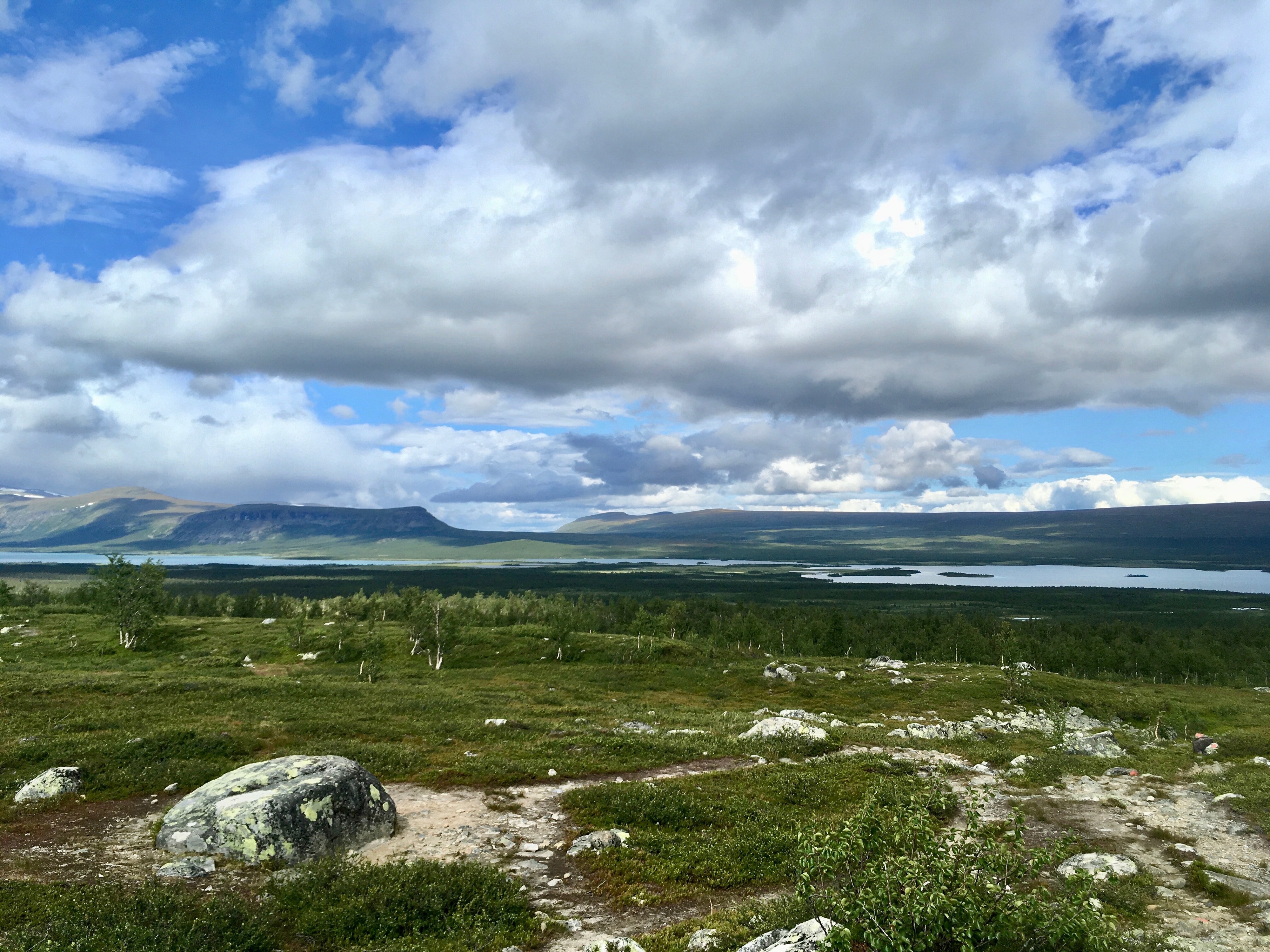Nach anfänglich dramatischem Himmel wurde heute wieder ein sonnig heisser Tag auf dem Kungsleden. Pausen mussten gut mit den Menschen vor und hinter mir koordiniert werden. Nicht nachdem überholen einer Person gleich Pause machen. Nicht die Pause aufhören, wenn gerade eine Person näherkommt. Wo und wann aufs Klo? Logistik auf dem Kungsleden.