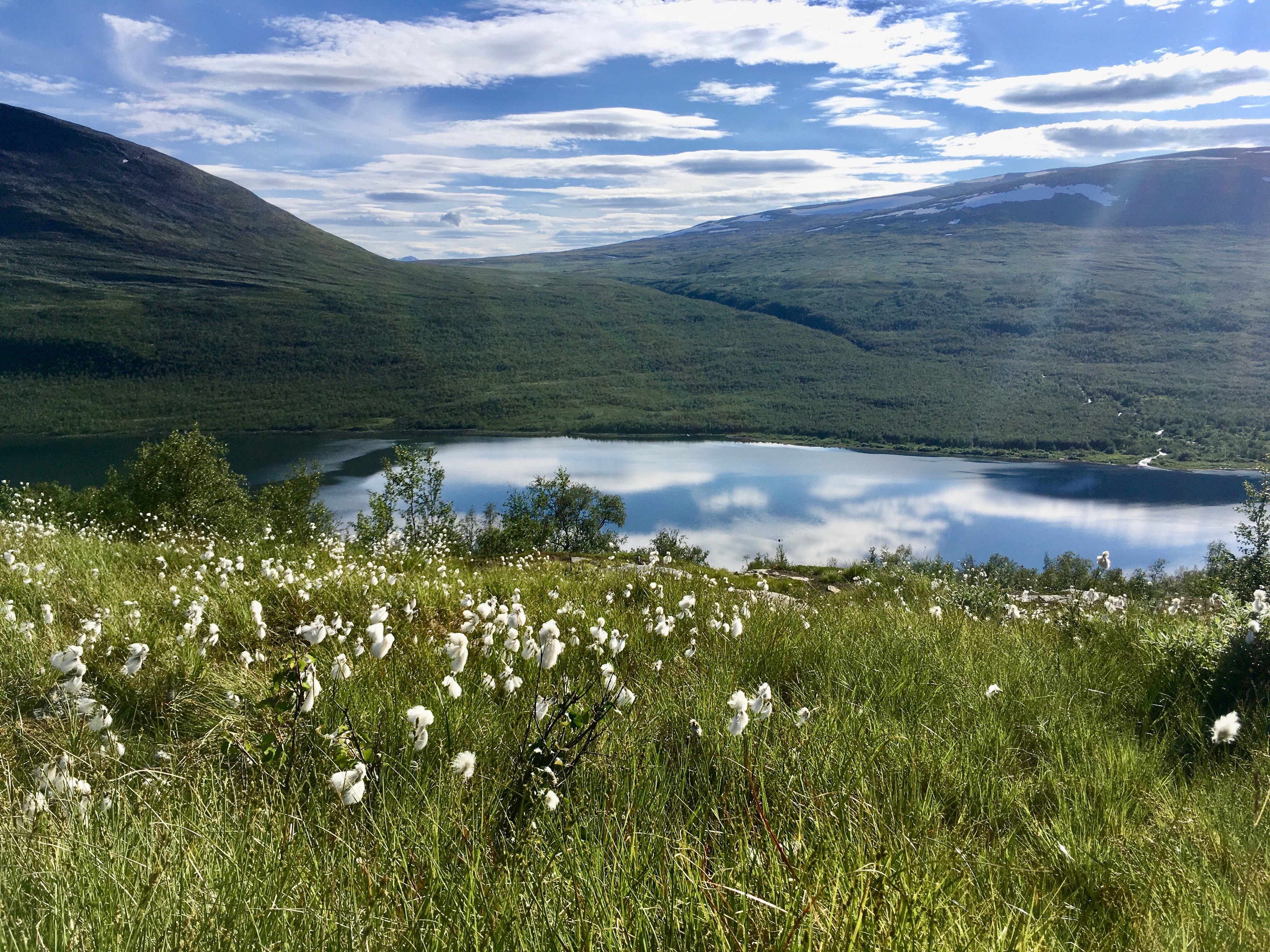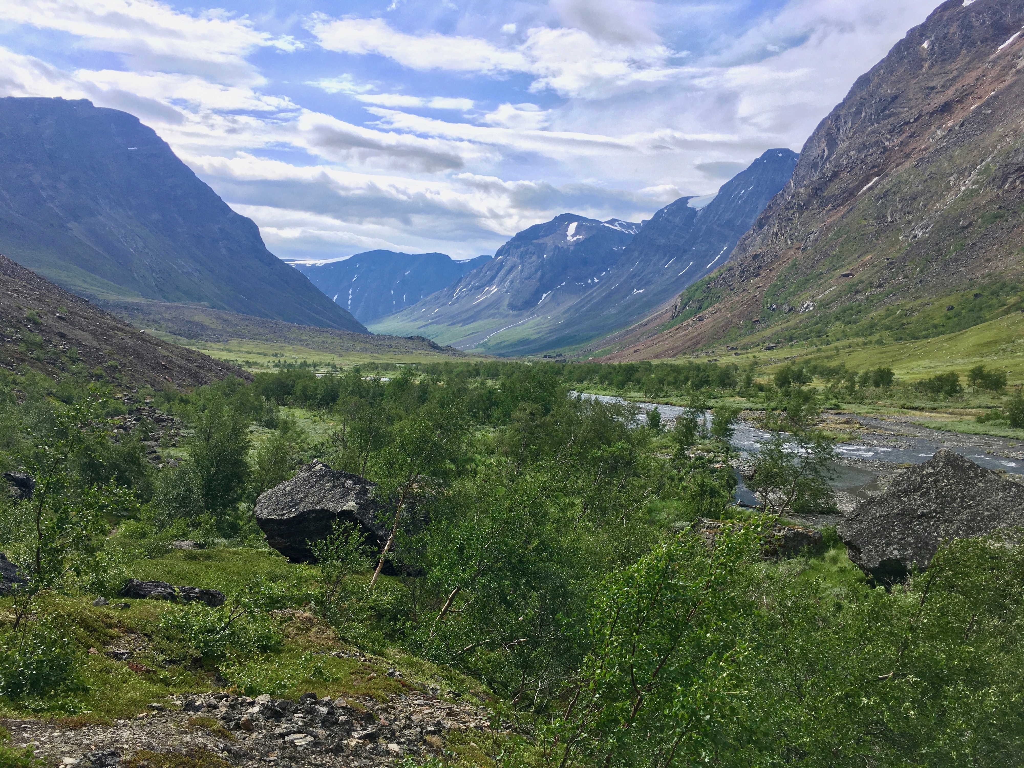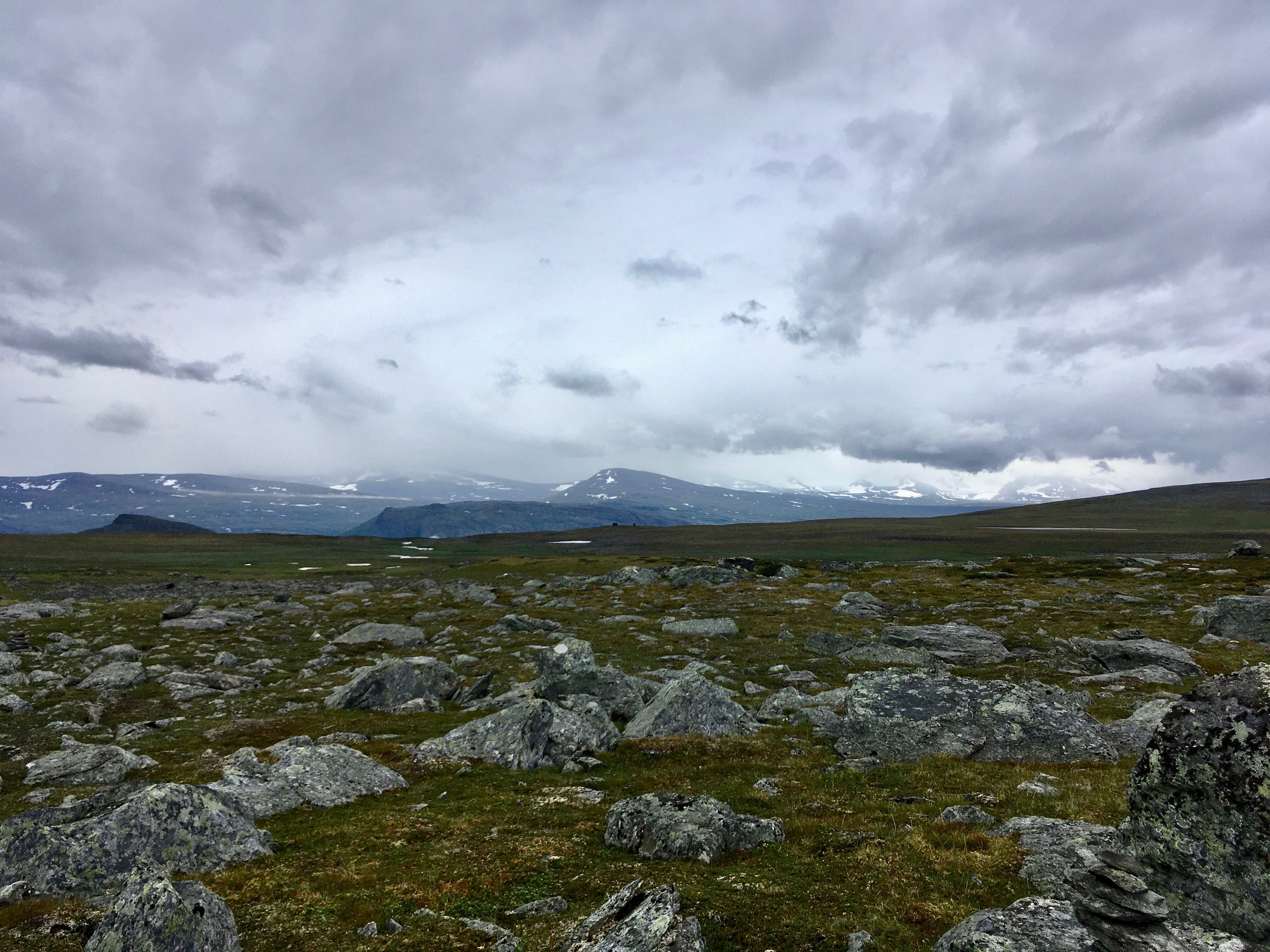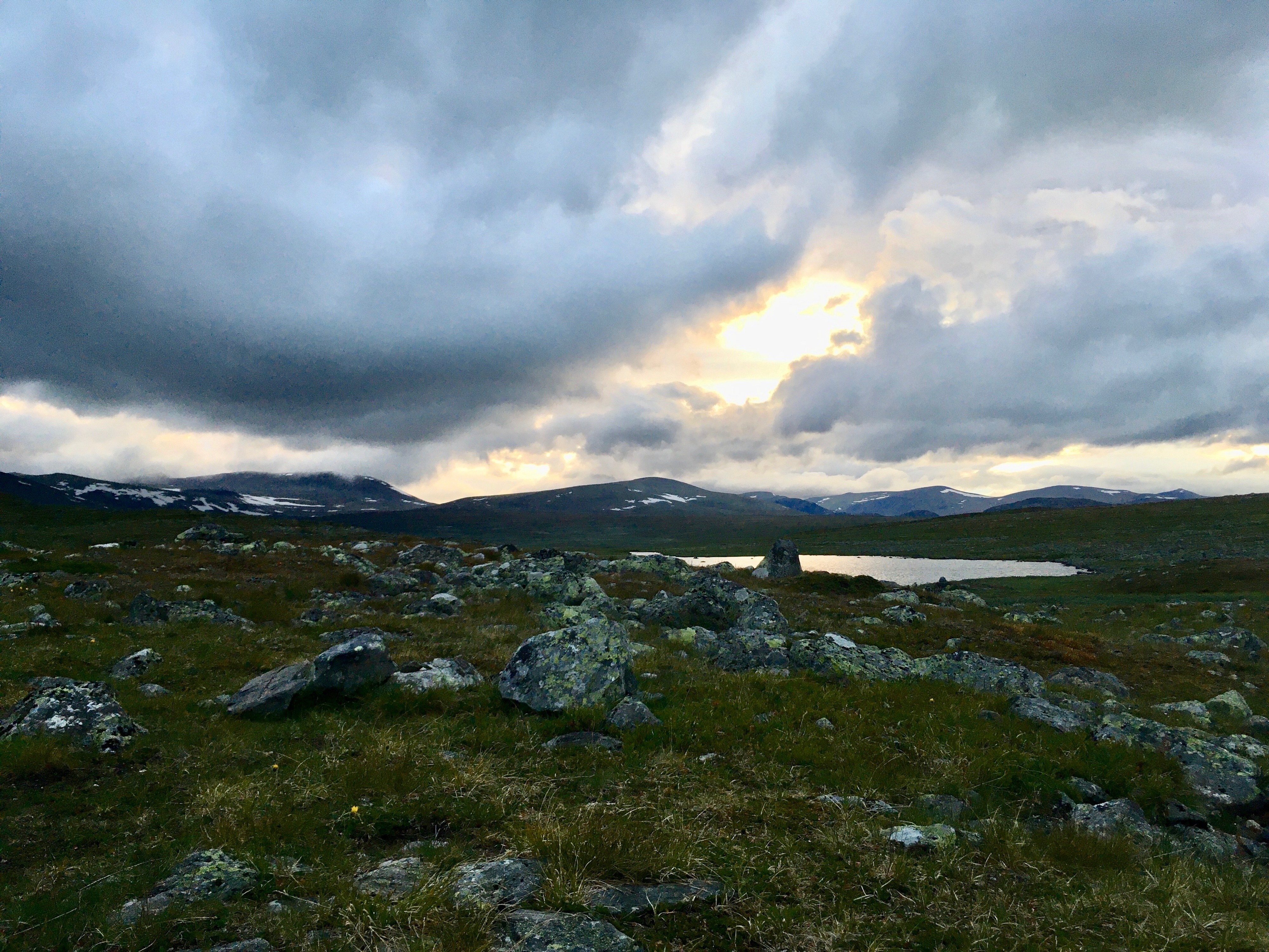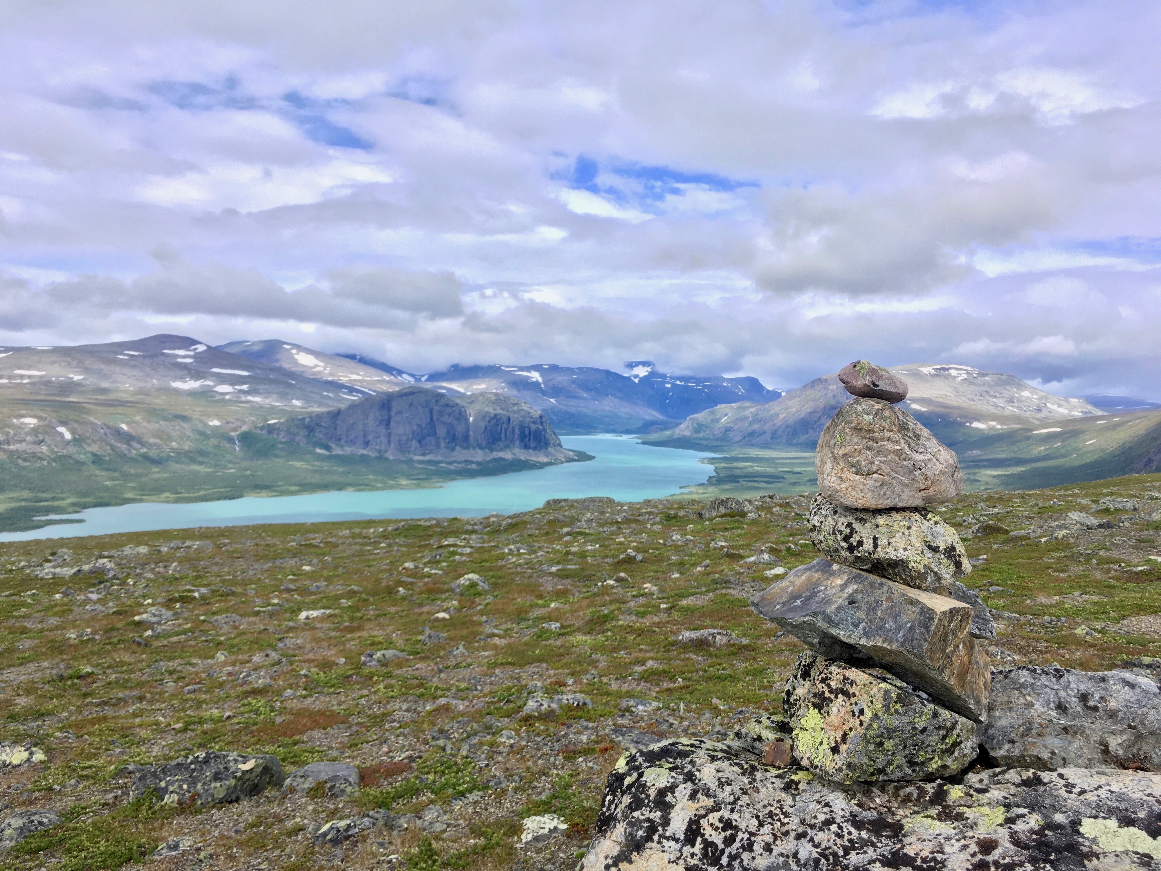 Nach anfänglich dramatischem Himmel wurde heute wieder ein sonnig heisser Tag auf dem Kungsleden. Pausen mussten gut mit den Menschen vor und hinter mir koordiniert werden. Nicht nachdem überholen einer Person gleich Pause machen. Nicht die Pause aufhören, wenn gerade eine Person näherkommt. Wo und wann aufs Klo? Logistik auf dem Kungsleden.