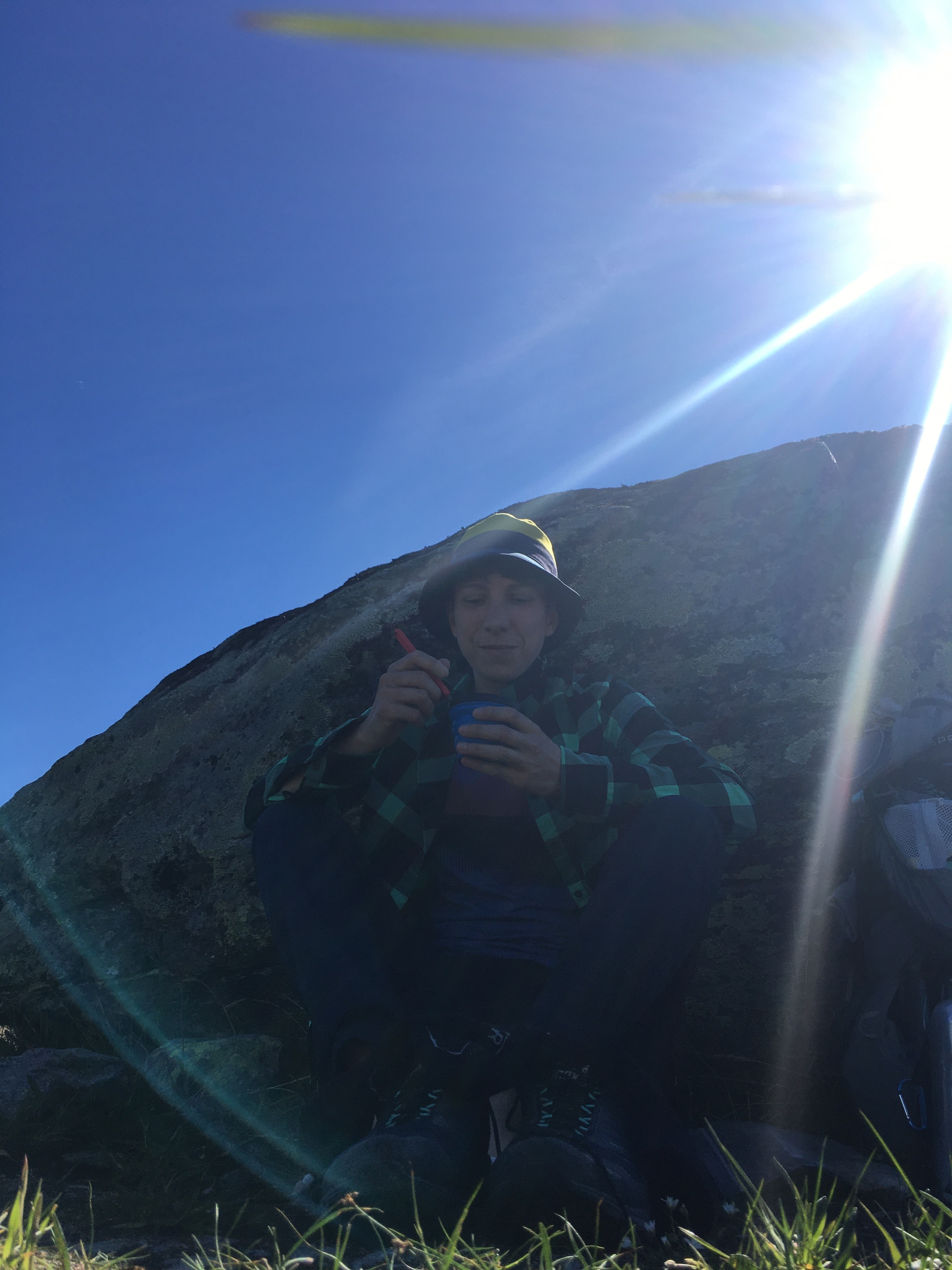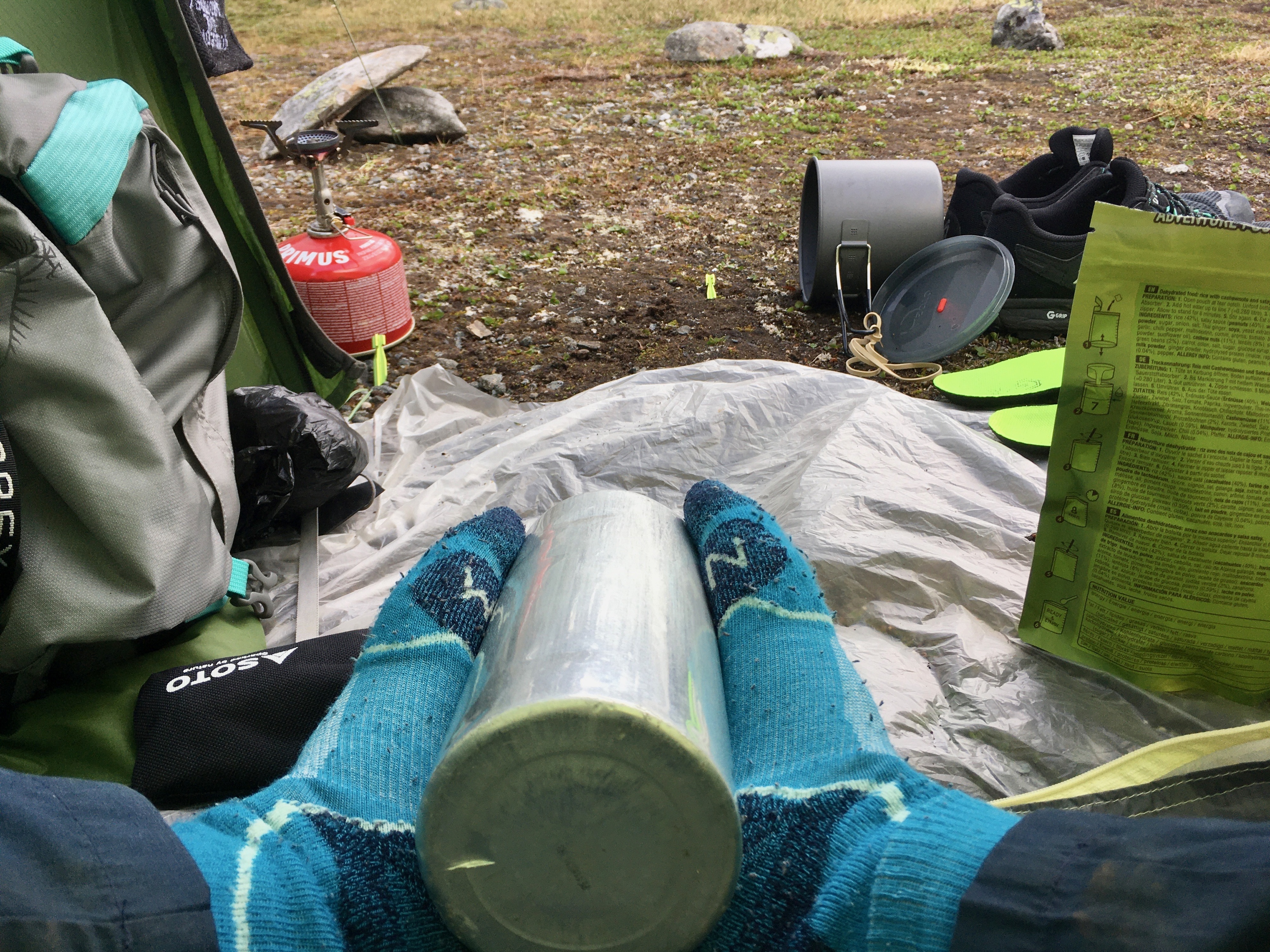 Ich schlief so dermassen gut. Ich und Schlafen im Zelt, das war bis zu diesem Urlaub eigentlich immer mehr so ein notwendiges Übel. Aber vielleicht war es einfach der Umstand, dass es nicht dunkel wurde. Oder das Rauschen der verschiedenen Flüsse neben denen ich schlief. Um 4 Uhr begann es zu regnen, aber nicht so schlimm und bis ich aufstand, war das Zelt schon fast trocken und ich freute mich auf den heutigen Tag. (Wenn nur meine Schultern, Füsse und Hüften bald aufhörten weh zu tun. Ich musste noch mehr von meinem schweren Lakritz-Vorrat essen…)