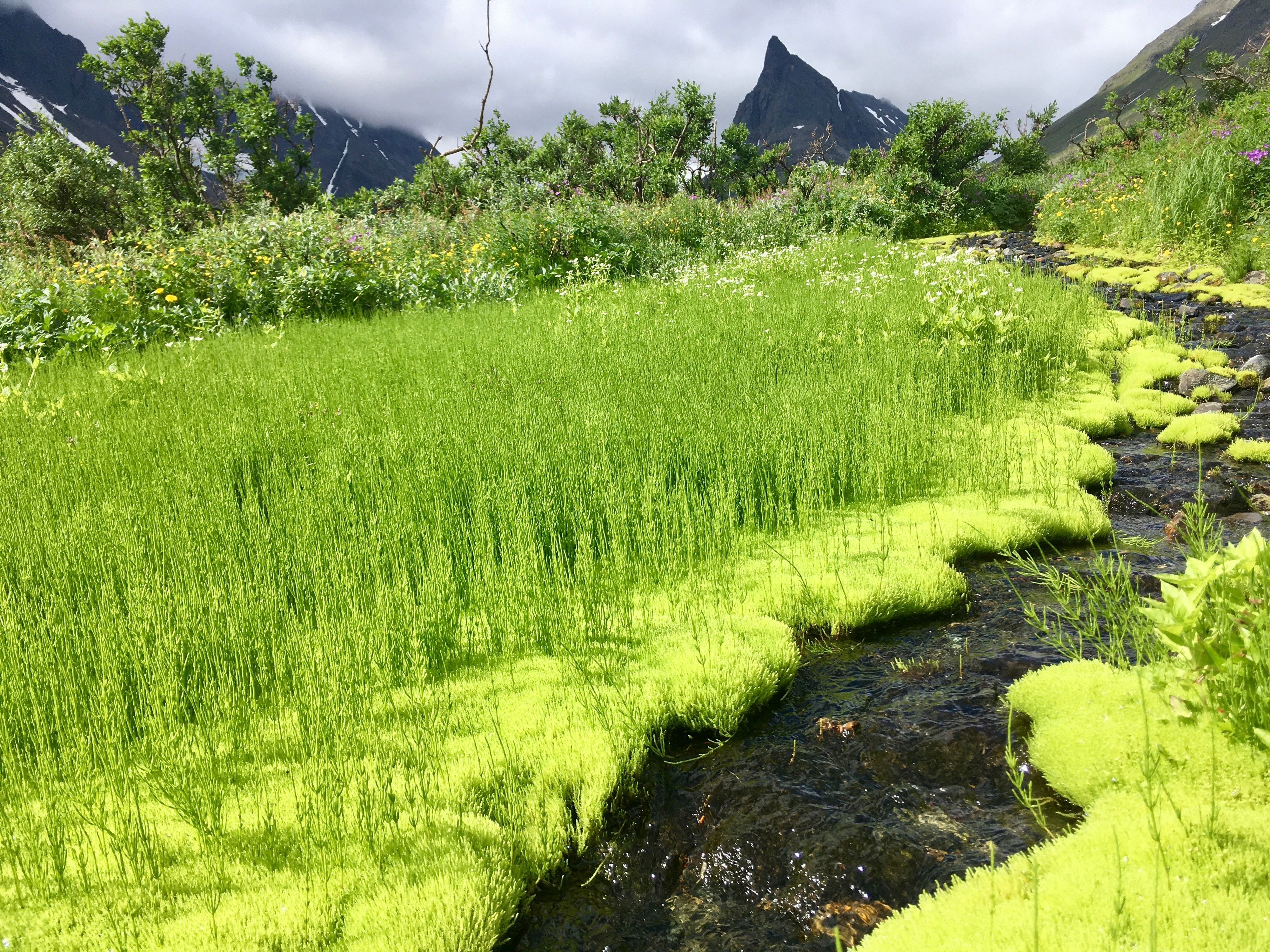Gleich zu Beginn stiegt der Weg stetig an und ich musste mich immer wieder umdrehen und den Blick zurück nach Vistas geniessen. Vor mir war das Tal Richtung Nállu allerdings auch nicht an Schönheit zu übertreffen. Mal warfen die Wolken kontrastreiche Schatten auf die Bergflanken, mal wurden verschiedene Stellen dramatisch beleuchtet. Farn bildete zu meiner Rechten einen kleinen Wald, giftgrüne Algen (oder Moos?) wuchsen im Flusslauf und sahen sehr unecht, aber toll aus. Über allem thronte die kantige Spitze des Nállu.