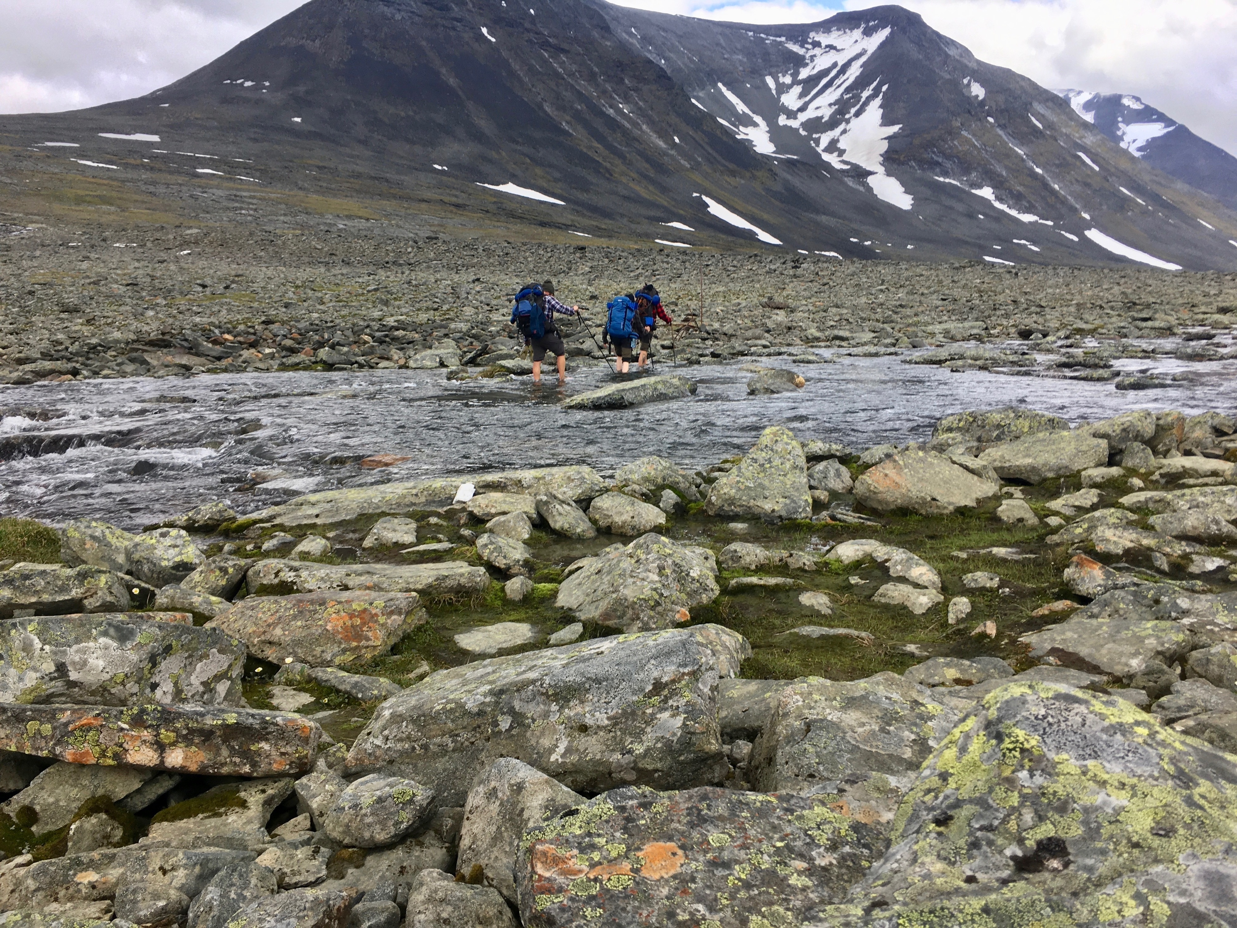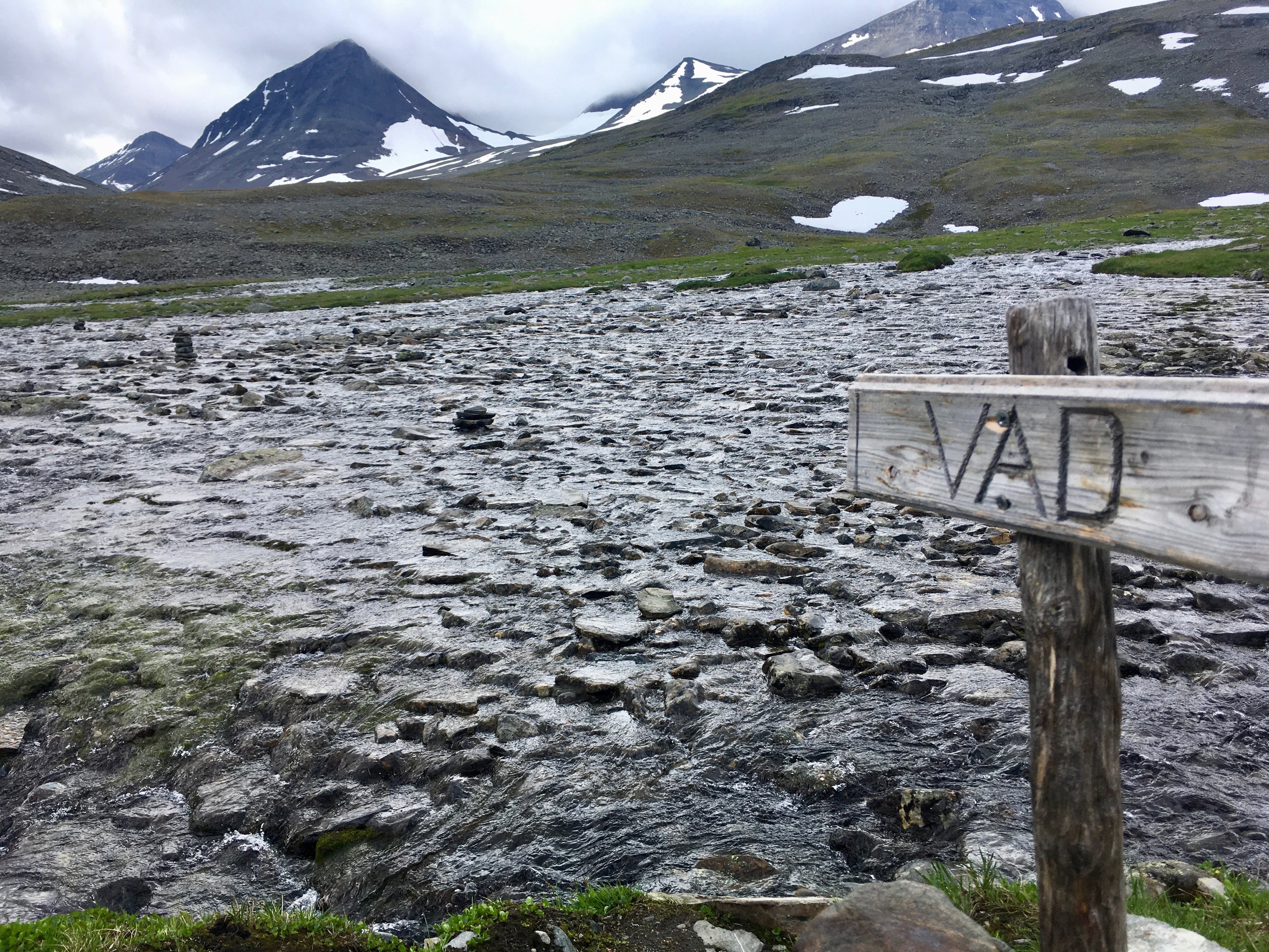 Die Watstelle vor der Hütte anschliessend war zwar sehr lang, aber durch ziemlich flaches Wasser, sodass ich einfach nur in meinen durchnässten wasserdichten Socken durch den Fluss ging, weil ich fand, dass meine Schuhe schon etwas trockener geworden waren. An der Nallostugan angekommen, kochte ich mir etwas Warmes zu trinken, stellte meine Schuhe in den Wind und kokelte aus Versehen mein Sitzkissen an, als ich es als Windschutz für den Kocher benutzte. Ich cremte meine Füsse zum wiederholten Mal mit Hirschtalg ein. Aber barfuss sein, während ich sonst schon alles, was ich zum Anziehen dabeihatte, anhatte half natürlich nicht gegen kalte Füsse. Der Hüttenwart schüttelte über die gesammelte Dummheit der Flussquerer:innen den Kopf. (Er tat das allerdings sehr höfflich, er war ja Schwede.) Das Paar, das auf dem Weg nach Vistas war, wurde gewarnt beim Fluss nicht dem grössten Steinhaufen zu folgen, sondern dem schlausten. ;)