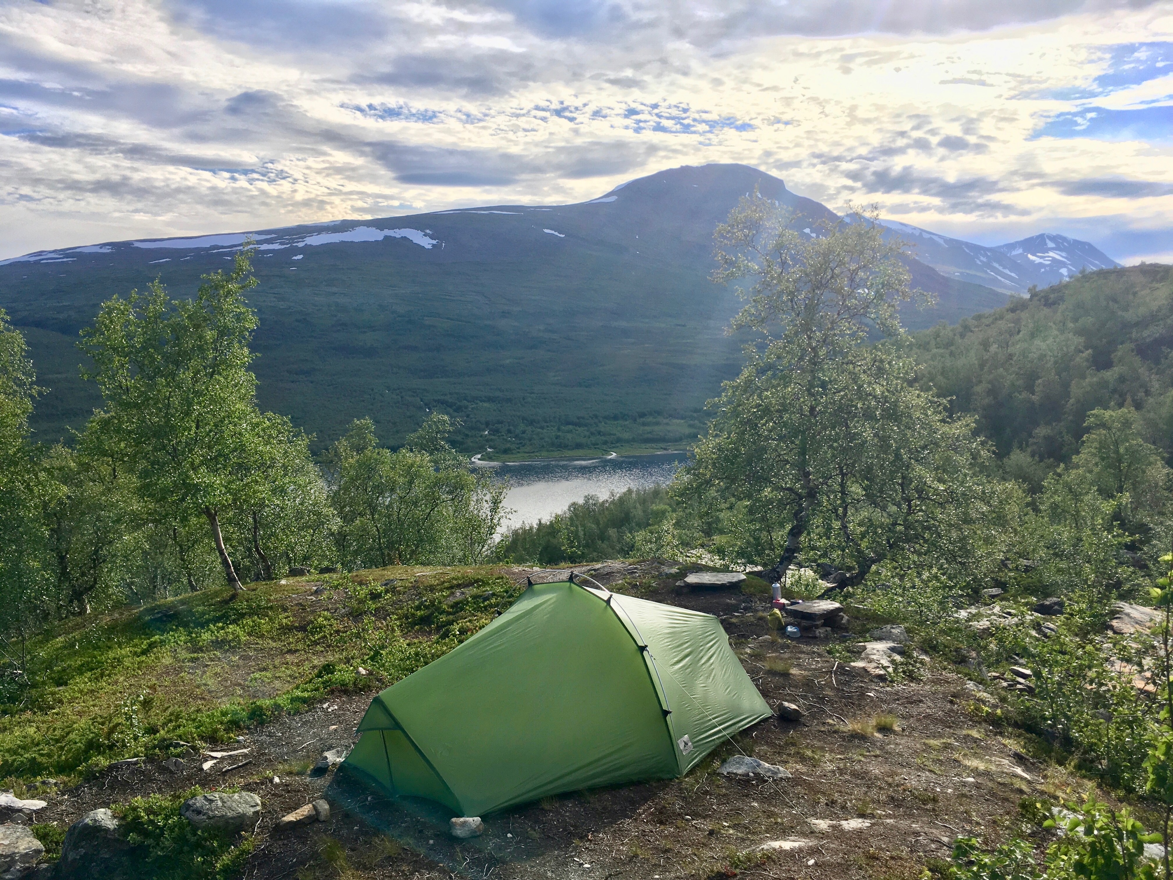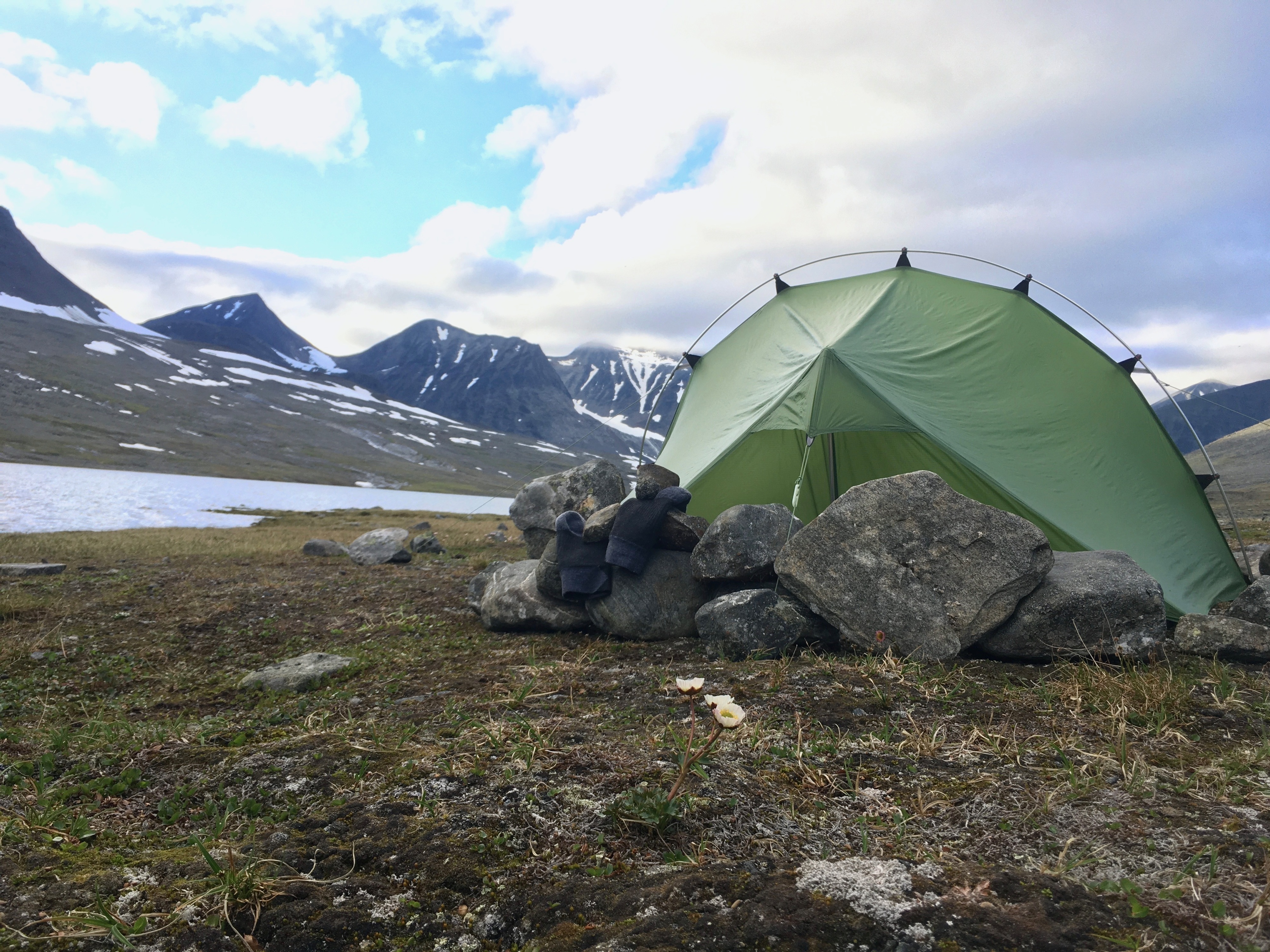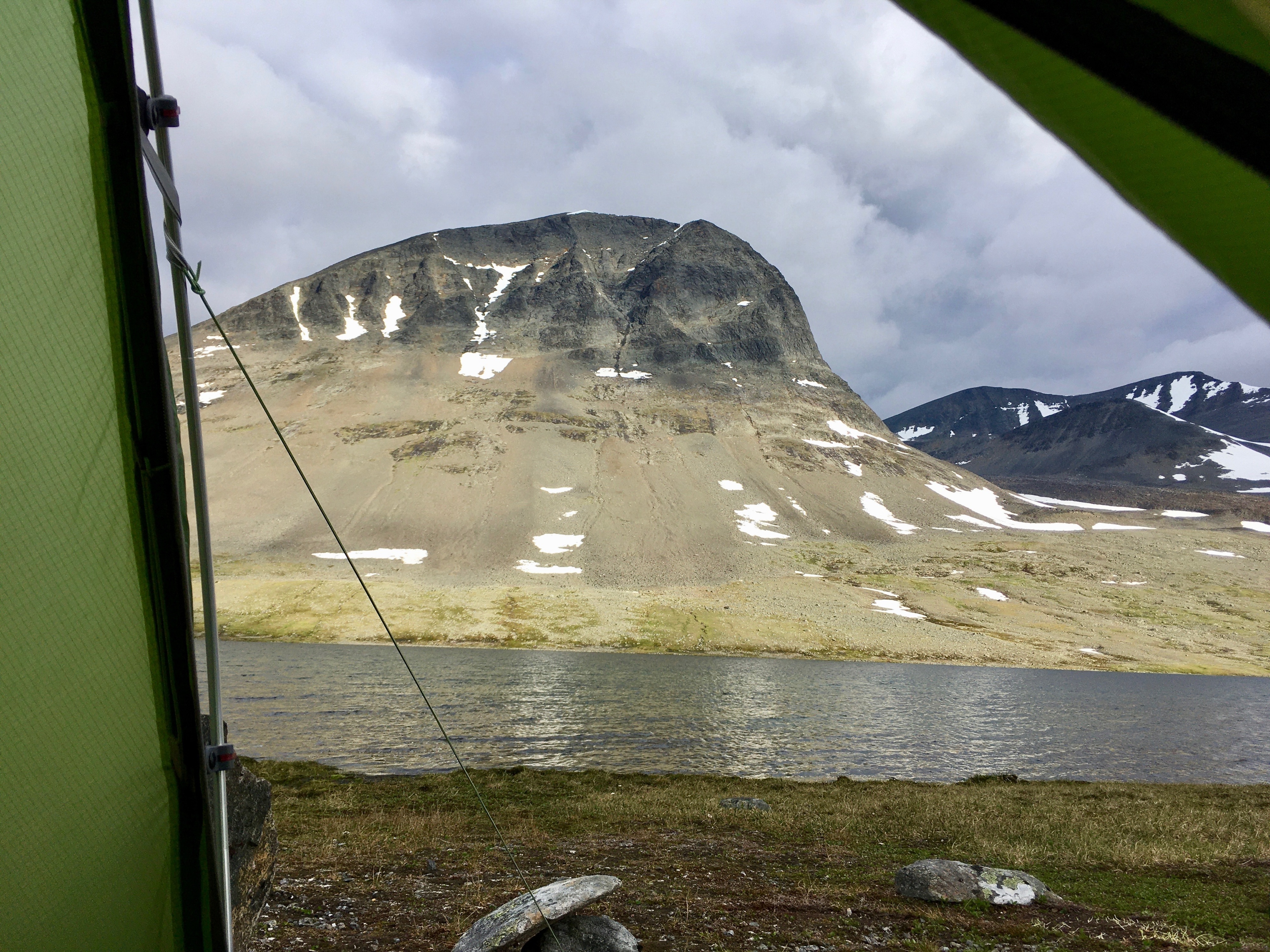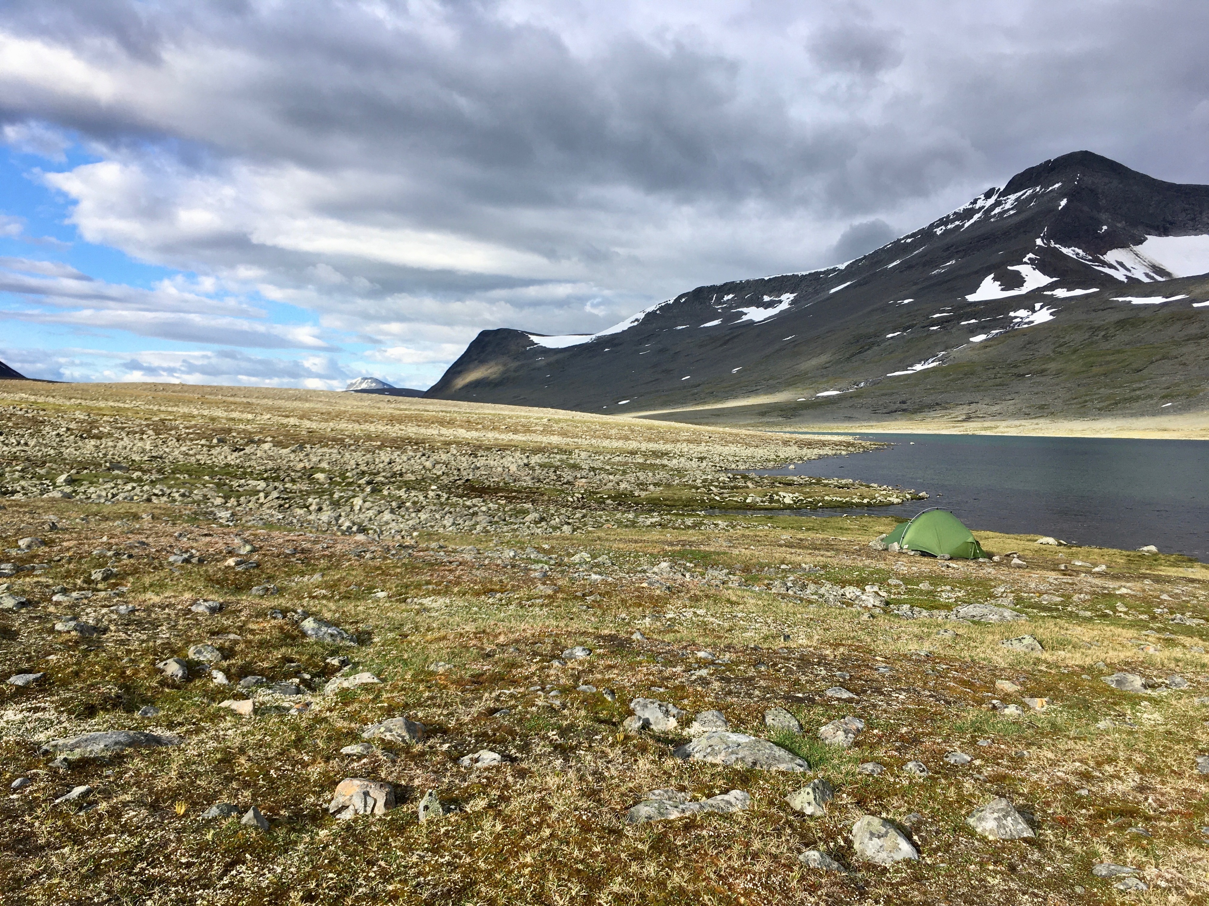 Aber, der Tag war ja noch gar nicht zu Ende! Ich querte noch ein paar Flüsschen und kleine ungefährliche Schneefelder, warf einen letzten Blick zurück ins grüne Vistastal und bog um die Kurve ins Stuor Reaiddávággi. Die extra mit Metalstangen markierte Flussquerung vorm See, stellte kein grösseres Hindernis mehr dar und so schlug ich bald an einer steinfreien Stelle am Seeufer mein Zelt auf. Ich überlegte, ob es eine schlaue Idee ist, hier so recht ungeschützt in diesem starken Wind das Zelt aufzustellen, aber die Faulheit und das Bedürfnis nach Schlafsack und Wärmflasche gewann. Und die Aussicht lohnte sich allemal. Ein toller Tag! Mantra des Tages: «Wie kann es nur so schön sein?!» Und sind wir ehrlich: so kleine Abenteuer, machen im Nachhinein ja auch Spass.
