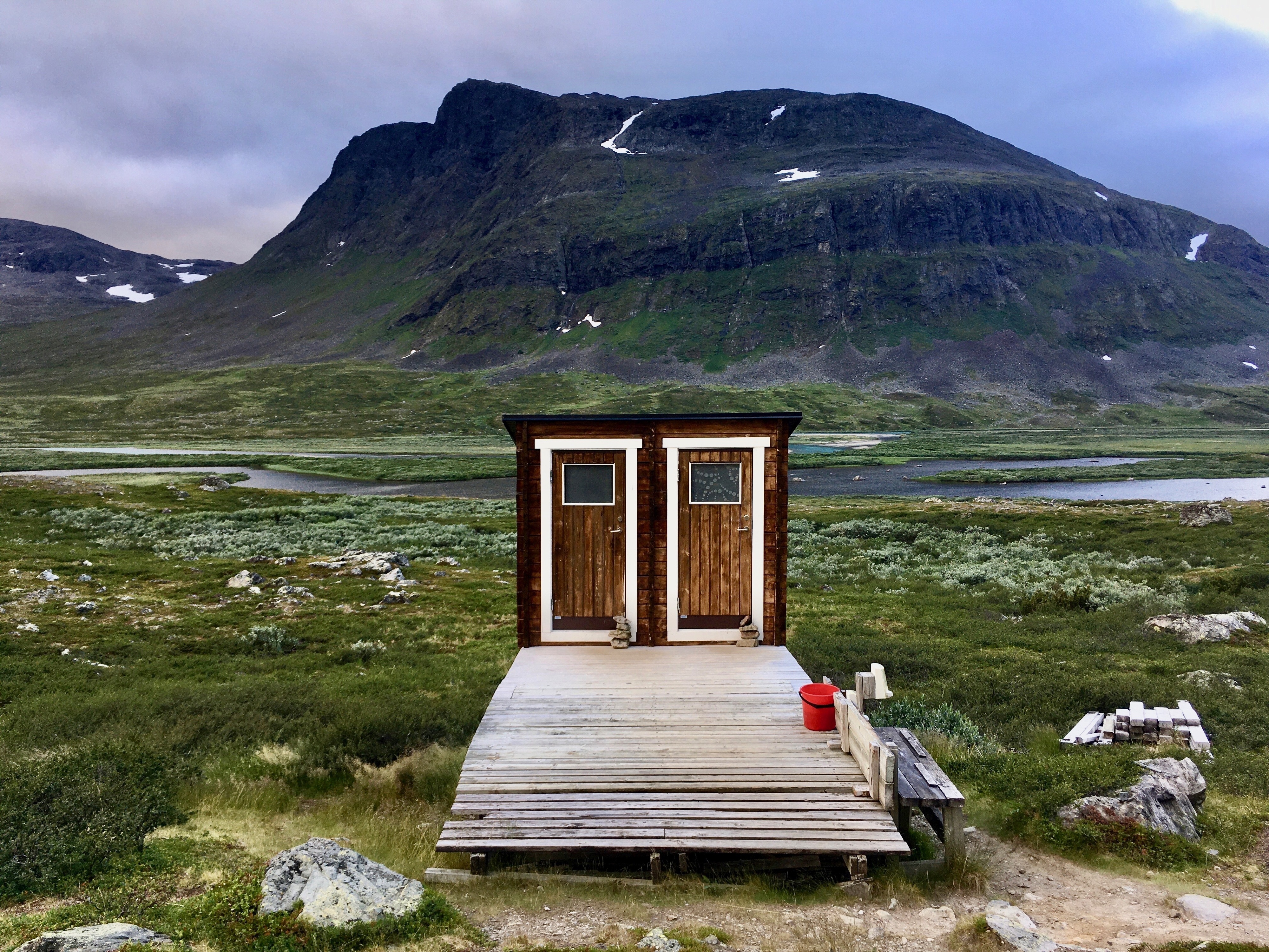 In Singi angekommen, gab es dort eine unglaubliche Menschen- und damit auch Mückendichte. Trotz sehr viel Wind. Ich fand das sehr bemerkenswert. (Also: Mücken trotz starkem Wind, nicht Menschen trotz Wind.) Da es erst Nachmittag war, fragte ich bei der Hüttenwartin und ihrem Mann nach, ob gute Plätze zum Zelten kämen, wenn ich weiter ging und ob es mit den Mücken irgendwo nachlassen würde. Zeltplätze und Mücken überall, lautete die Antwort. Aber für heute sei ein Sturm angesagt, dass sollte ich bedenken. In meinem müden, genervten Zustand konnte ich mir also die Frage nicht verkneifen, ob sie ein Bett für mich frei hätten. (Anmerkung: wegen COVID-19 musste eigentlich immer im Voraus reserviert werden.) Sie hätten ein Zimmer wegen des Sturms zurückbehalten und bisher sei ich die Einzige. Und so kam ich zu meinem ersten Bett. Nachdem ich zirka 50 Mücken erschlagen und die Mückennetze an den Fenstern mit meinem Tape repariert hatte, konnte ich nun gemütlich in der Küche sitzen. Das war auch mal gut. Ein deutsch-indisches Paar schwedischer Postdoktoranden gesellte sich wegen der Mücken draussen zu mir in die Küche und teste den Feueralarm mit angebranntem Couscous. Ich legte meine Menschenfeindlichkeit ab und stellte fest, dass sich unterhalten ja auch sehr nett sein kann. Überraschung. Kurz darauf zogen noch drei junge Frauen in das andere Zimmerchen, das an die Küche grenzte, weil ihr Zelt im Wind zusammengefaltet wurde. (Wir kannten uns schon flüchtig von der Bootsfahrt über den Alesjaure.) Als allerdings um acht der Sturm vorbei war (!) und es draussen fast windstill wurde, hatte ich mich schon so – im Bett liegend und Hobbit lesend – an meinen Luxus gewöhnt, dass ich nicht mehr bereute heute Nacht in der Hütte zu schlafen. Ausserdem gab es hier das schönste Klo am Kungsleden. (Ein bisschen aber vermisste ich mein Zelt.)