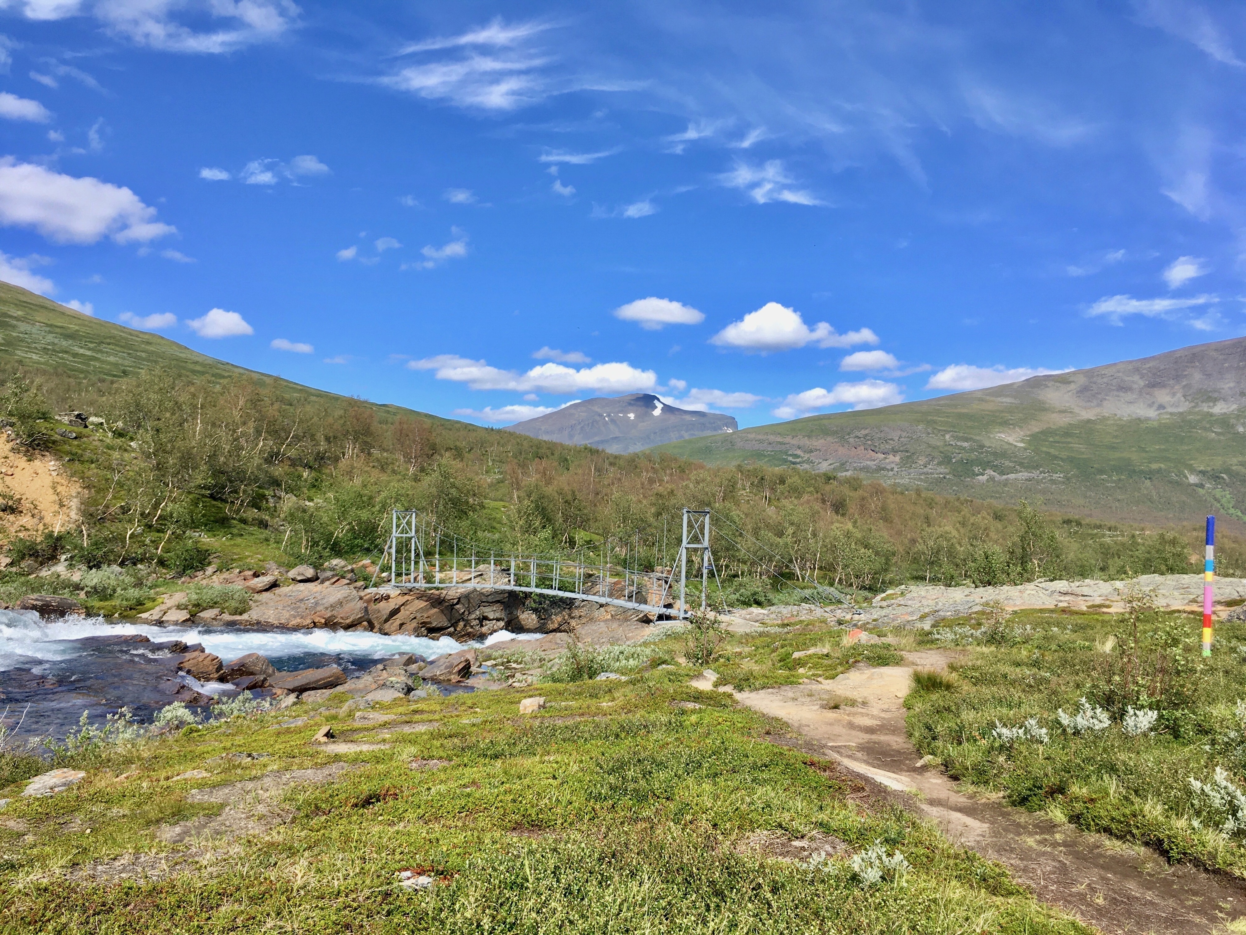 Am nächsten Morgen wurde ich von einer gleissenden Sonne geweckt. Nichts wie raus aus dem Zelt! So hatte ich mir das mit den Vorteilen, der Nicht-untergehenden-Sonne nicht vorgestellt. Aber immerhin, es war immer so hell, ich musste keine Angst haben. In keiner der kommenden Nächte. Und das will etwas heissen! Für eine kleine Zelt-Schisserin wie mich. (Vielleicht bin ich eben gar keine Zelt-Schisserin, sondern eine Dunkel-Schisserin.) Beim Weitergehen stellte ich fest, dass ich hier bei Weitem nicht nur neben zwei Zelten genächtigt hatte. Ich lief bis zur Hängebrücke über den Fluss wohl an 30 Zelten vorbei. Ach du meine Güte! Ich fragte mich, in was ich hier hineingeraten war. Ich hatte mich zwar für den Kungsleden entschieden, weil ich bei meiner ersten Solo-Tour nicht komplett Abseits laufen wollte, aber so hatte ich mir das nun auch nicht vorgestellt. Zum Glück schien 8:30 nicht die Uhrzeit zu sein, zu der die meisten schon «up and about» waren. (Nur die Mücken waren schon wach.) Und so nahm ich den Anstieg hinter der Brücke weitestgehend allein in Angriff. Gut, dass ich heute morgen zu faul war mir noch Kaffee zu kochen. Das plante ich am nächstmöglichen schönen mückenfreien Ort, der nicht lange auf sich warten liess. Allerdings bedeutete das auch, dass das Gross der Leute aufholte und eine recht laute Männergruppe, meinen Pausenplatz so schön fand, dass sie sich direkt neben mir niederliessen. Schade, ist doch in Lappland eigentlich genug Platz, um nicht aufeinander sitzen zu müssen.