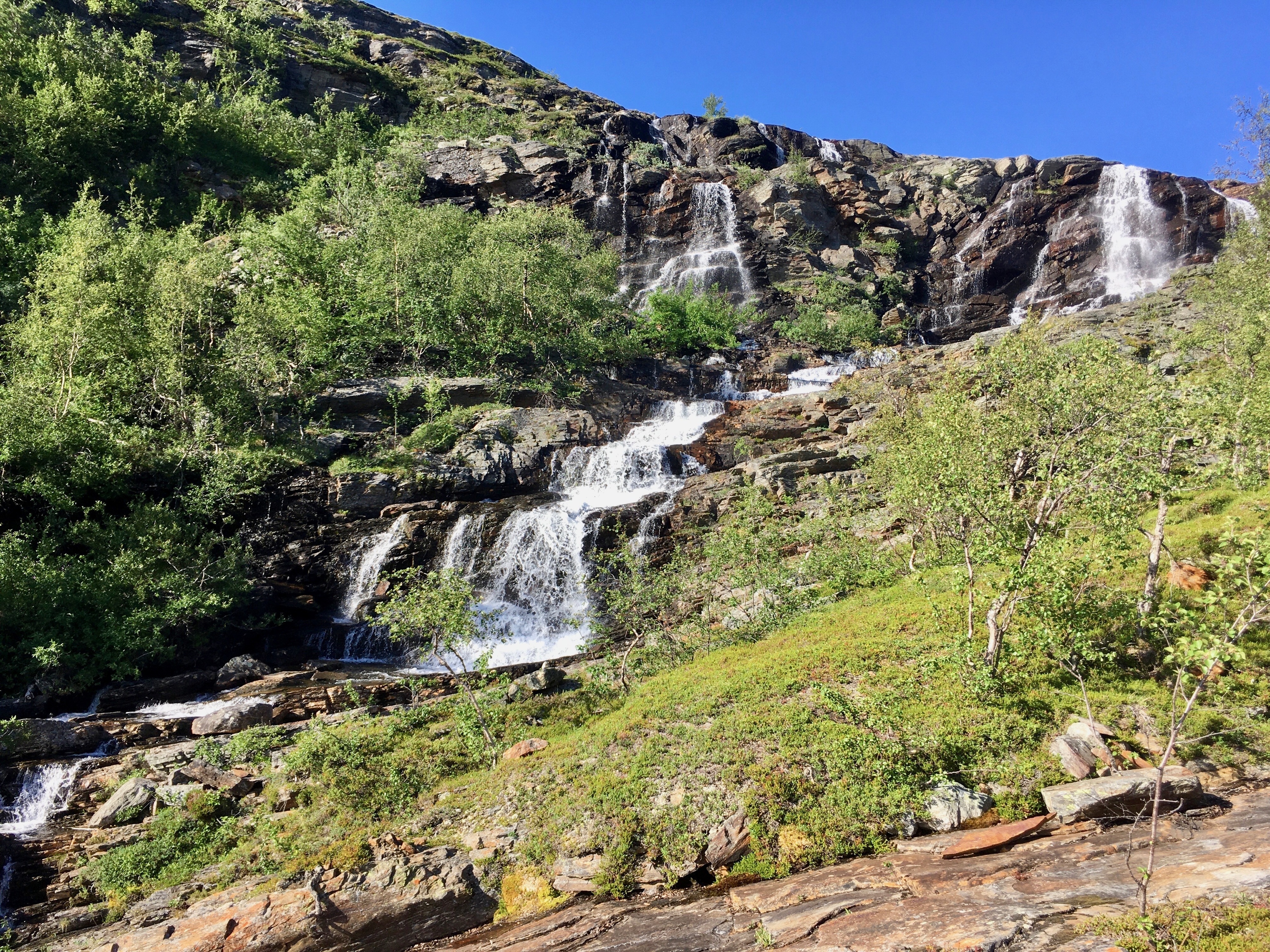 Jetzt folgte der unschöne Teil des Tages. Es ging einfach gerade aus. Die Sonne knallte auf mich herunter und stehen bleiben kam wegen der unglaublich vielen Mücken auf dem Hochplateau nicht in Frage. Ein Hungerast tauchte dann auch noch auf (blödes Knäckebrot!), sodass ich im Gehen die ganze Packung getrocknete Mango (noch aus Göteborg) und zwei Traubenzucker wegmampfte. Das half. Und bald ging es auch schon merklich bergab. Oh, ein Wasserfall! Und: Oh! Direkt daneben ein sehr exponierter Zeltplatz, auf dem ich schief, mit Stein im Rücken schlafen konnte: Gekauft! Und dann das erste Mal einen Wecker gestellt, um am nächsten Morgen das Boot über den See nicht zu verpassen.