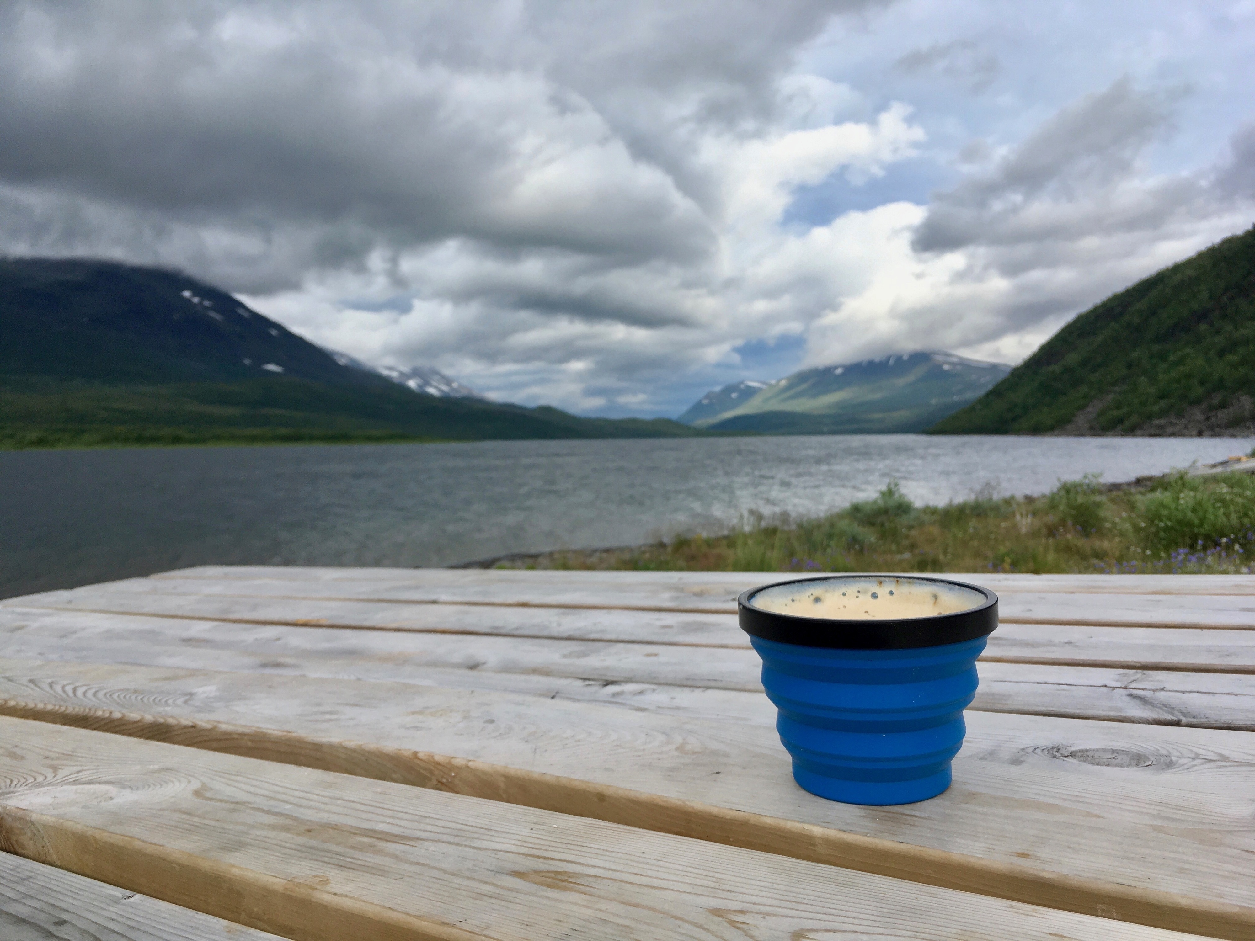 Der Weg führt von Saltoluokta steil nach oben und schnell gab es eine schöne Aussicht. Da ich mal wieder ohne Kaffee zu trinken aufgebrochen war, machten wir nach einer halben Stunde unsere erste Fika. Zur Überraschung aller packte Liam (der junge Engländer) einen Apfel aus und wir waren alle sehr neidisch auf dieses knackige, gesunde Frisch. Anscheinend hatte es Äpfel im Shop in Saltoluokta gegeben, aber niemand ausser Liam hatte sie entdeckt. Was hätte ich für einen Apfel gegeben!
