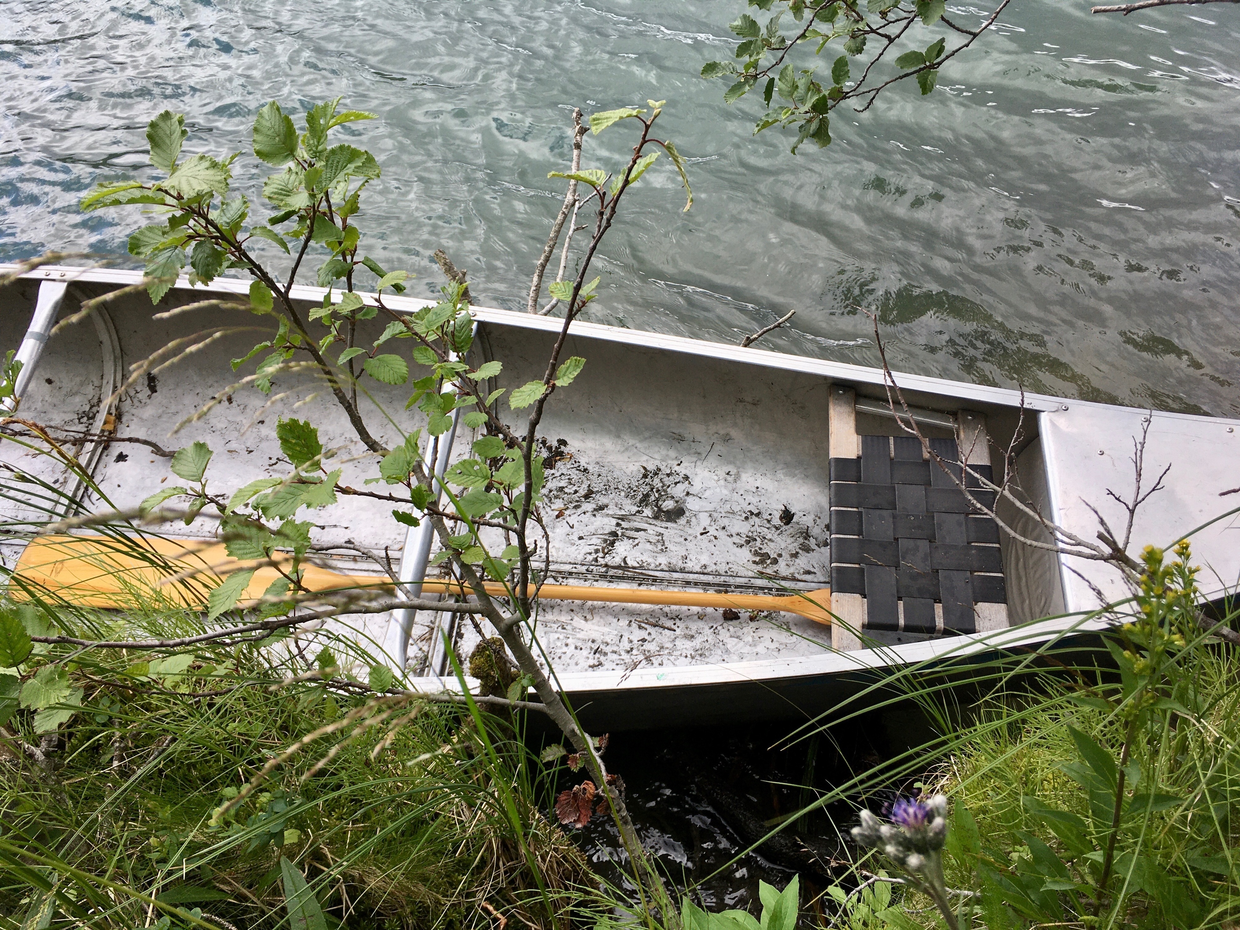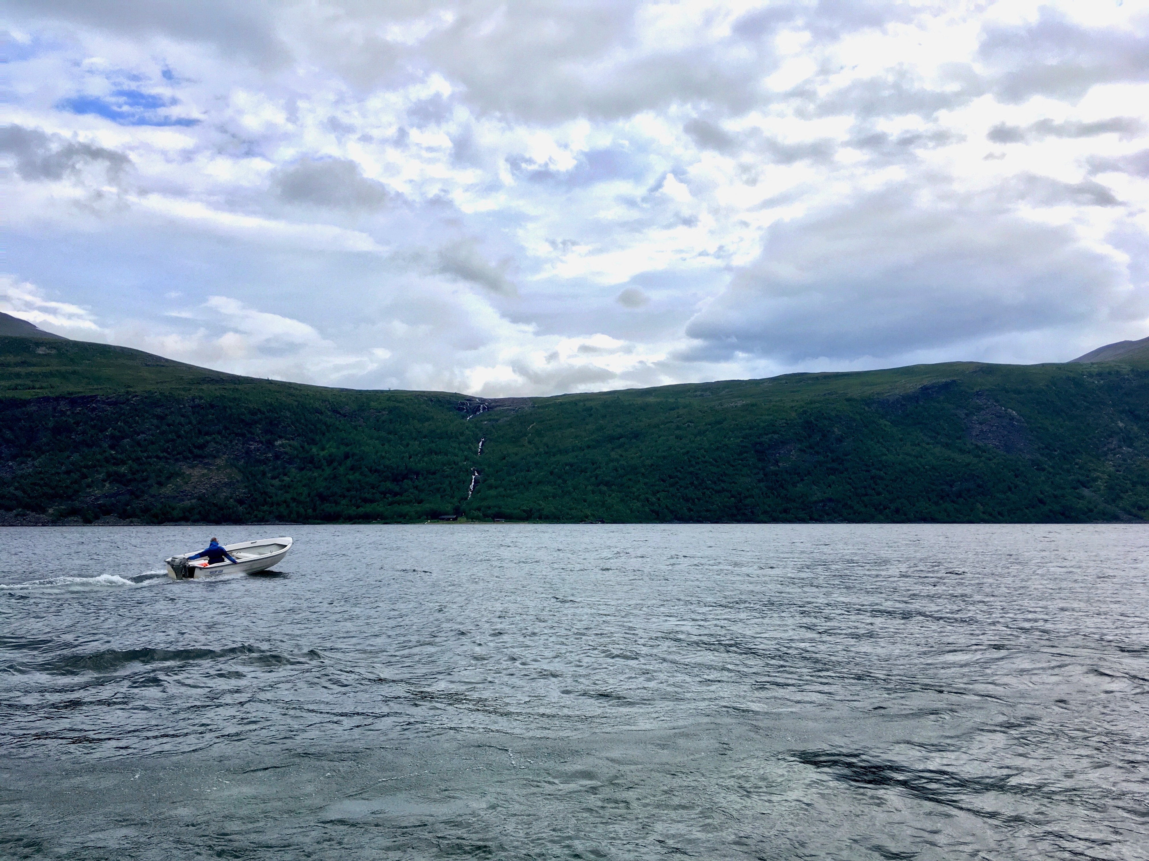 Als ich am Warteplatz für Bootsfahrer:innen am Sitojaure ankam und mir gerade die Karte, was es alles zu kaufen gibt anschaute, kam schon direkt die Frau, die für den Bootstransfer zuständig ist auf mich zu. Ob ich über den See wolle? Ja, aber erst später, weil ich noch gerne Fisch essen würde. Sie habe leider keinen Fisch, würde dafür aber in 5 Minuten jemanden mit einer extra Fahrt vom anderen Ufer abholen. Sie stellte sich als sehr überzeugende Person heraus. Anscheinend fuhr sie nicht gerne leer über den See. Und so sass ich unmittelbar nachdem ich ankam, schon wieder im Boot. Es war wie immer eine schöne Bootsfahrt. Der See ist sehr flach und die Kapitänin legte einige spektakuläre Kurven hin, um für mich unsichtbaren Hindernissen auszuweichen. Zu allem Übel, erklärte sie mir auch noch einen Short-Cut zum Skierffe. So viel zu meinem Plan, etwas langsamer voran zu kommen…