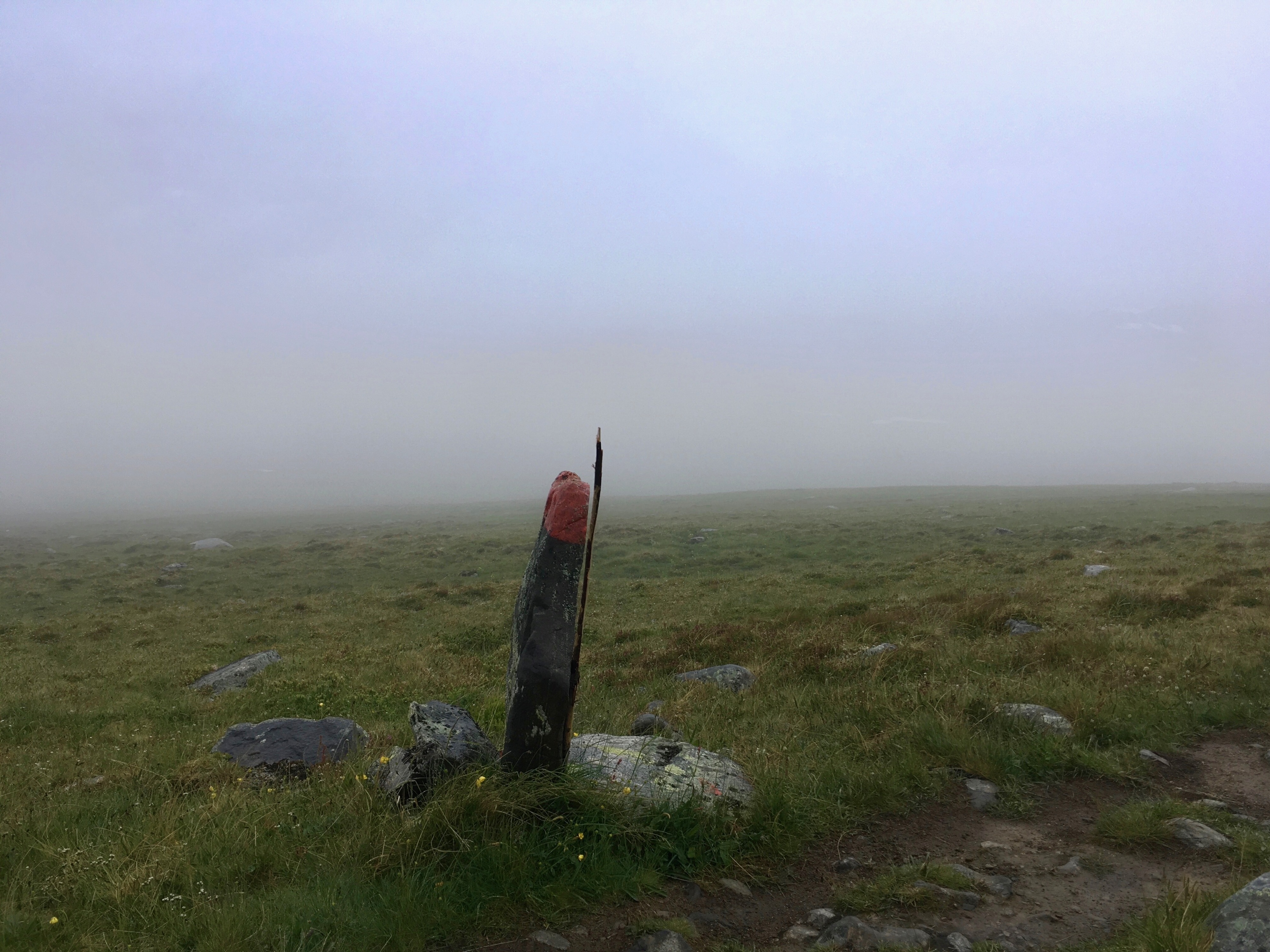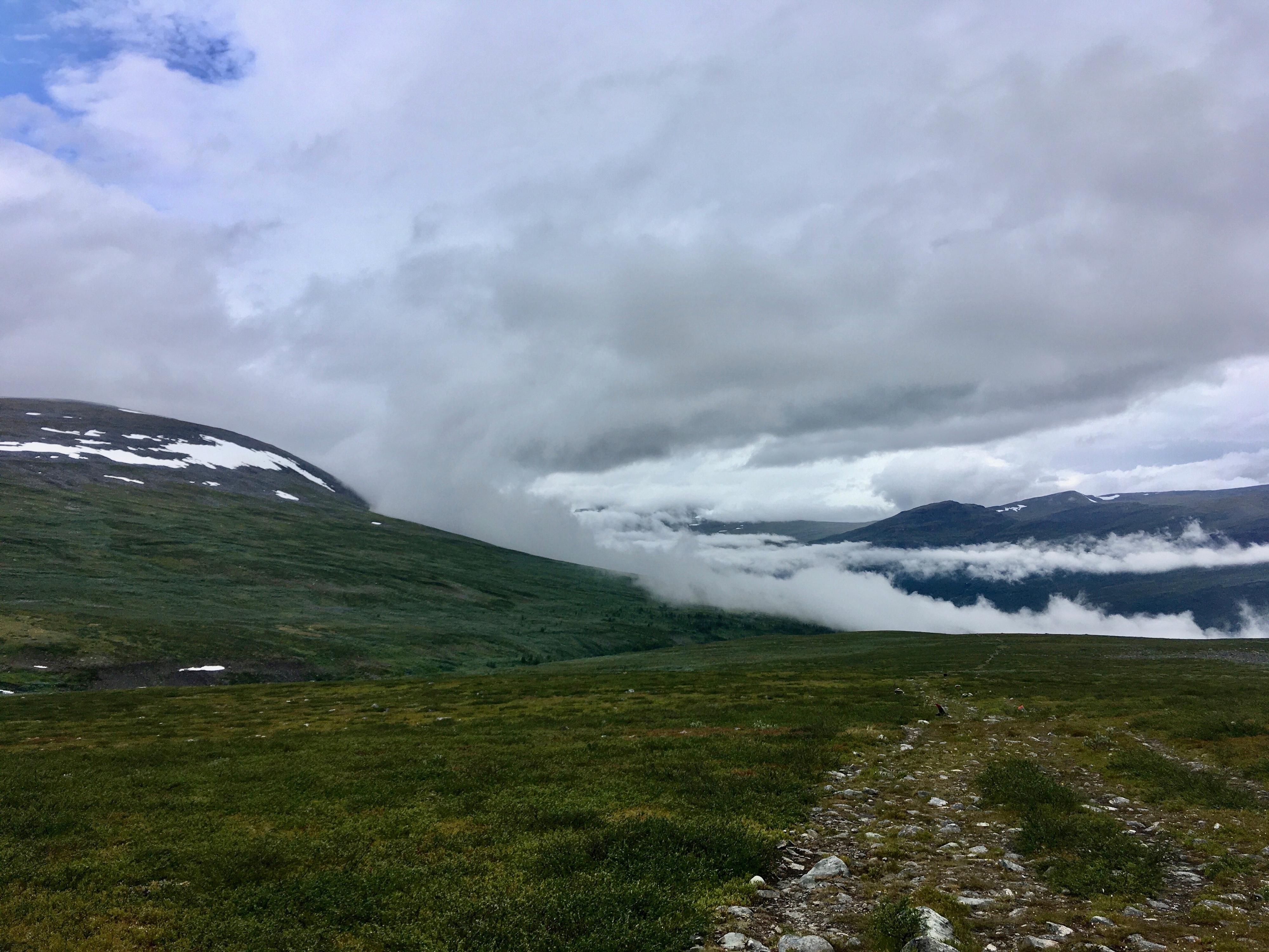 Auf der anderen Seite ass ich zuerst noch meine letzte Portion selbstgemischtes Müsli und machte mich dann auf den Weg nach oben. Heute ging es durch den Stora Sjöfallets Nationalpark. Der inzwischen einsetzende Regen, konnte nichts daran ändern, dass es hier ziemlich schön war. Zuerst durch einen lichten Birkenwald hoch, hoch, hoch und dann oben Blick auf die umliegenden teils schneebedeckten Berge, deren Gipfel immer wieder von dramatischen Wolkenformationen verdeckt wurden. Beim Aufstieg wünschte ich mir meine Jacke hätte Pit Zips, denn es war ziemlich heiss. Aber nass sein wollte ich auch nicht. Zum Glück bin ich keine grosse Schwitzerin und werde mit Regenjacke (auch ohne Belüftungsoptionen unter den Armen) nicht genauso nass wie im Regen. Aber besonders angenehm war es auch nicht. Auf die Regenhose verzichtete ich beim Aufstieg allerdings. Der Wind pustete bei einer kurzen Regenpause die Hose im Nu wieder trocken. Oben angekommen, zog ich beim nächsten Regenschauer nun doch die Regenhose an. So warm war es ohne Aufstieg dann doch nicht. Ein Weg, der geradeaus markiert war, aber ein Schild das rechts zur Brücke zeigte, irritierte mich ein wenig. Auf meiner Karte sah ich dann, dass es zur Brücke ein kleiner Umweg war. Da ich aber dachte, die Schweden bauen sicher nicht grundlos eine Brücke, folgte ich dem Schild. Auf der Brücke stellte ich fest, dass ich die Brücke nicht wirklich gebraucht hätte. Aber das kommt wohl auf die Jahreszeit und den Wasserstand des Flüsschens an. Meine Pause machte ich, als ich mich plötzlich vollkommen von einer Wolke eingehüllt fand. Ich mag Nebel! (Und Schokolade!) Da rufen mich immer die Unterirdischen.