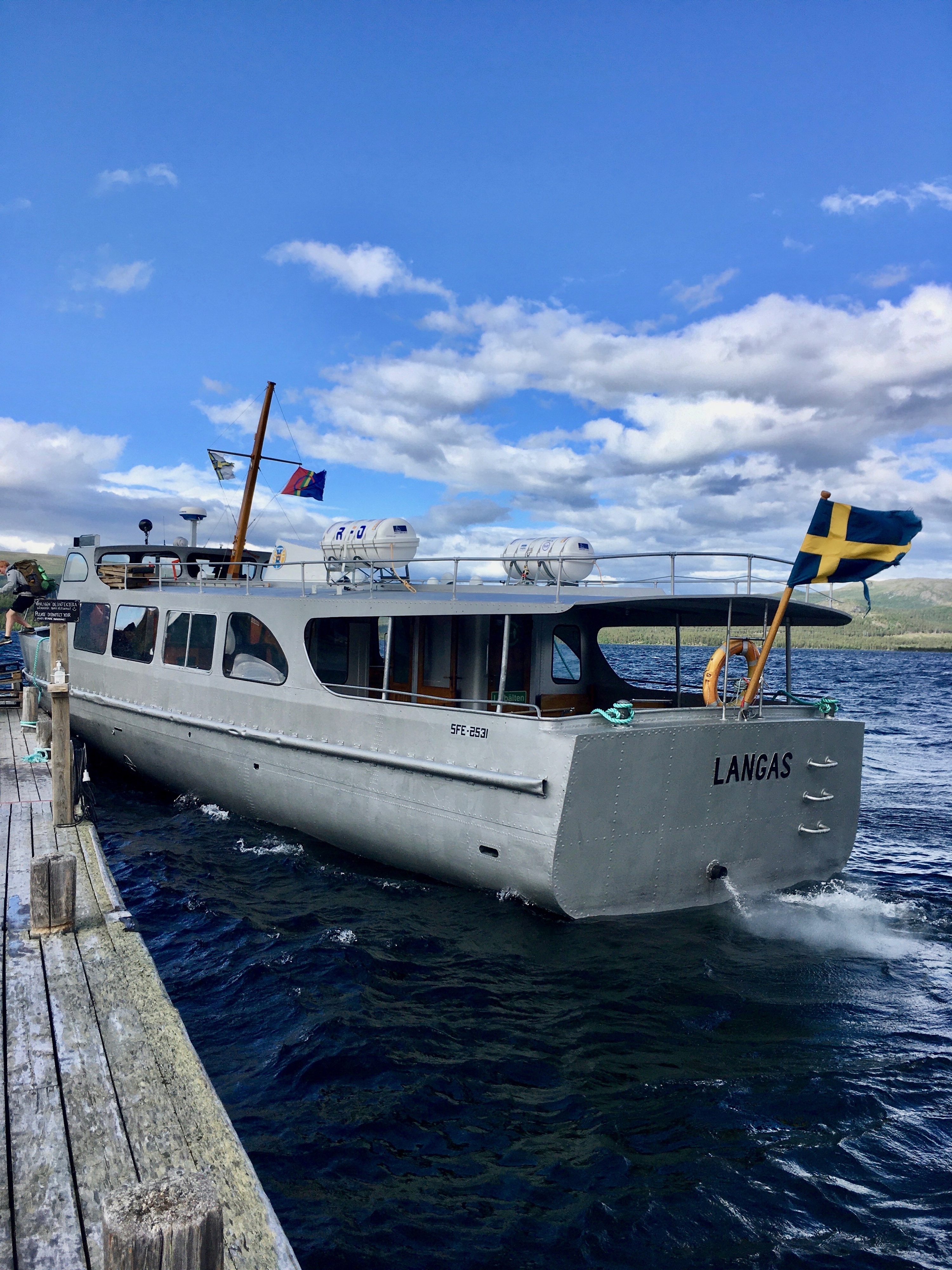 40 Minuten später kam der Bus tatsächlich zurück. Die Rucksäcke und Wanderstöcke wurden ordentlich im Anhänger verstaut. Im Bus brach bei einigen Jubel aus: es gab USB-Steckdosen. Hatten die alle ihre Kabel immer griffbereit in der Hosentasche? Meins zumindest war irgendwo in meinem Rucksack, aber so dringend war es mir gar nicht. (Ich wusste ja auch nicht, dass es schon Empfang gab…) Der Busfahrer fuhr im wahrsten Sinne des Wortes wie eine gesengte Sau über die rumplige, mit Schlaglöchern übersähte Strasse, während seine Partnerin die Reiseführerin spielte. Nette schwedische Volksmusik wurde angeschaltet. Dann krachte es und der Bus legte eine Vollbremsung hin. Der junge gestresste Engländer gegenüber von mir sah aus, als würde er sein letztes Gebet sprechen. Der Anhänger hatte sich wieder gelöst. Die Rucksäcke wurden irgendwie auch noch in den vollen Bus gepackt, der Anhänger, der erst seit gestern in Betrieb sei und als «wie neu» vom Verkäufer angepriesen worden sei, wurde neben der Strasse stehen gelassen. Wir kamen heil in Vietas an, wo tatsächlich ein luxuriöser grosser Reisebus bereitstand. Als wir jedoch gerade den ersten Rucksack unten einladen wollten, schloss dieser die Klappe und fuhr los. Die Partnerin unseres Busfahrers rannte zum Glück hinterher und der Bus hielt wieder an. So kamen wir dann doch noch nach Kebnats. Am Steg angekommen teilte uns das Schiff mit, dass es bereits voll sei, aber in 40 Minuten wieder zurückkomme…