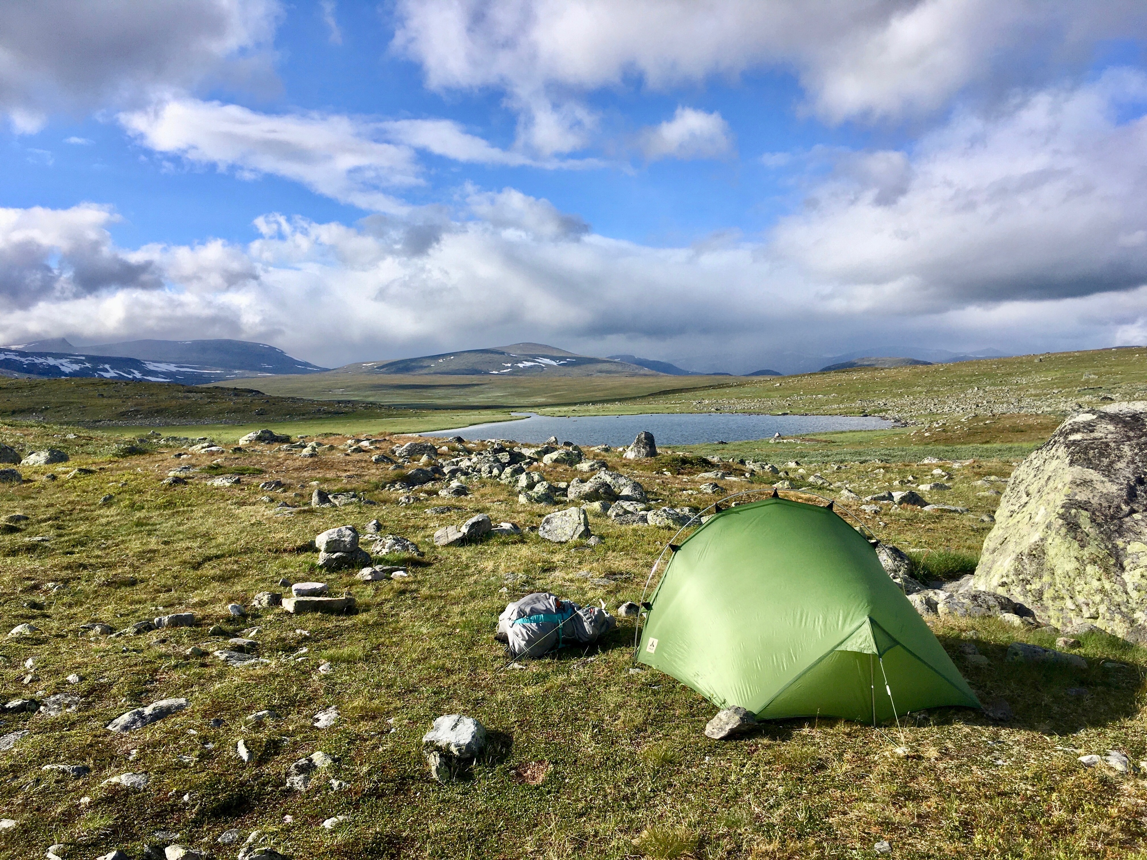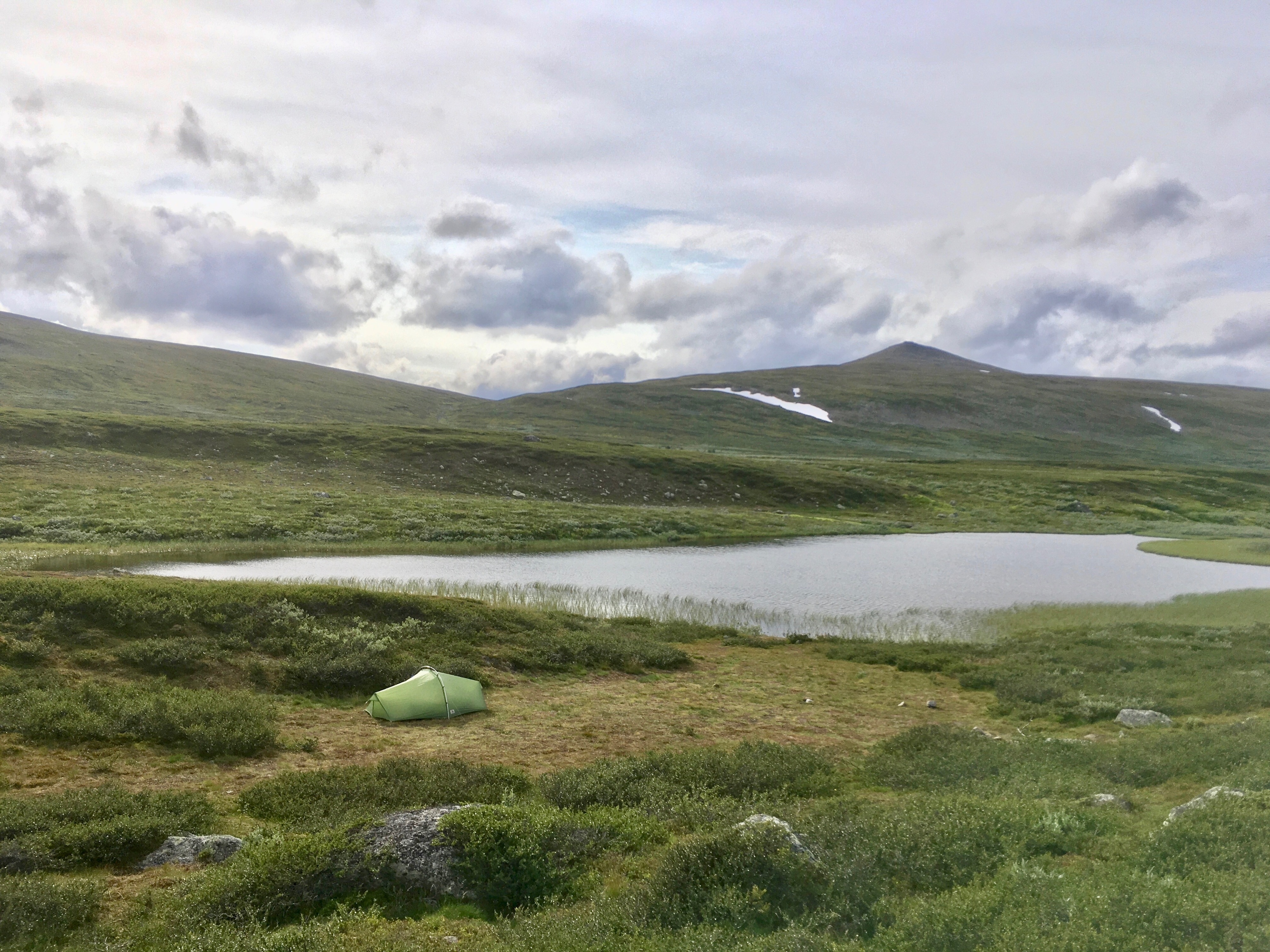 Nachdem ich über eine kleine Kuppe gegangen war, konnte ich die beiden Seen schon sehen. Aber auch, dass es drumherum ziemlich sumpfig war. Ich bahnte mir einen Weg zum ersten kleinen See, an dem nicht wirklich eine gute Möglichkeit das Zelt aufzustellen bestand. Als ich jedoch über eine weitere kleine Kuppe ging und zum zweiten See kam, standen dort schon ziemlich viel Zelte. (Ich hatte wohl nicht als einzige den Tipp bekommen.) Da hatte ich keine Lust darauf, mich noch dazu zu stellen. Also ging ich wieder zurück und stellte mein Zelt sehr exponiert und etwas schief in den Wind. Den Skierffe hob ich mir für morgen früh auf. Schliesslich hatte ich für heute – an meinem Bummeltag – auch schon ungeplante 20km zurückgelegt.