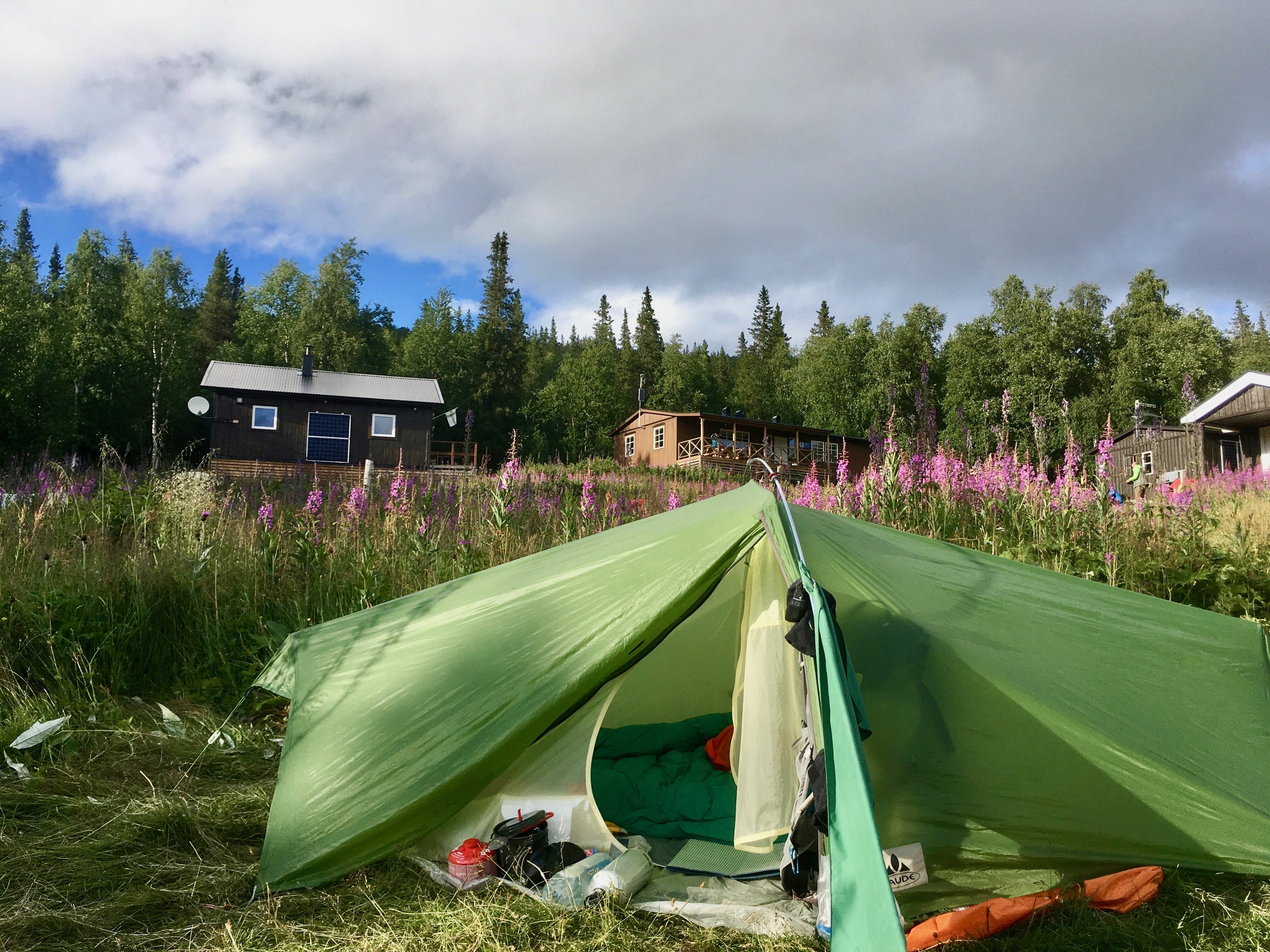 In Saltoluokta war natürlich schon alles ausgebucht. Und da ich feststellte, dass ich 3-4 Tage zu früh in Kvikkjokk ankommen würde, wenn ich so weiterlief, stellte ich mein Zelt in den windgeschützten Wald und nahm ich mir ein Zimmer für die nächste Nacht. Und so blieb ich eine Nacht im Zelt und eine Nacht in einem sehr gemütlichen Bett in Saltoluokta.