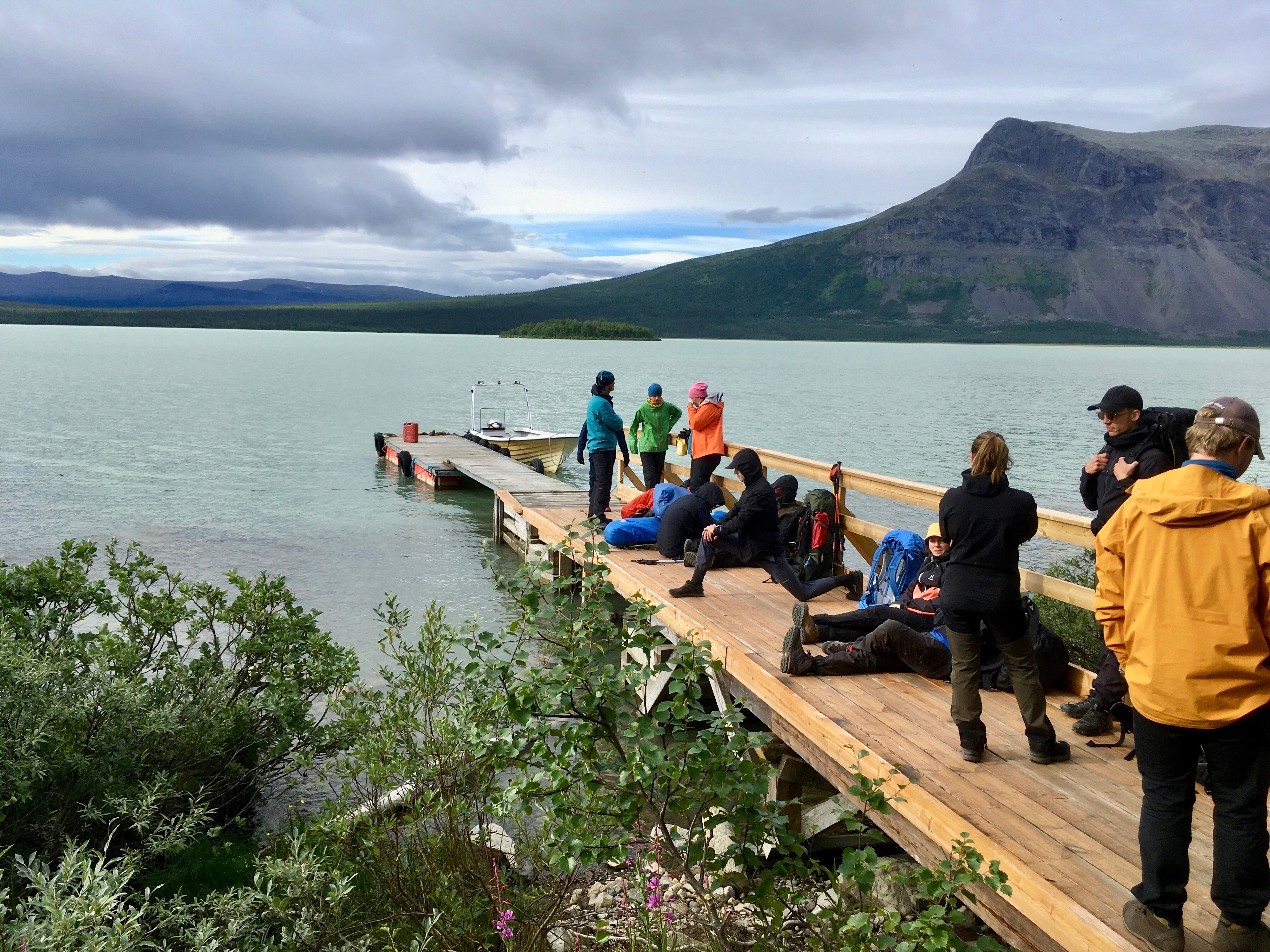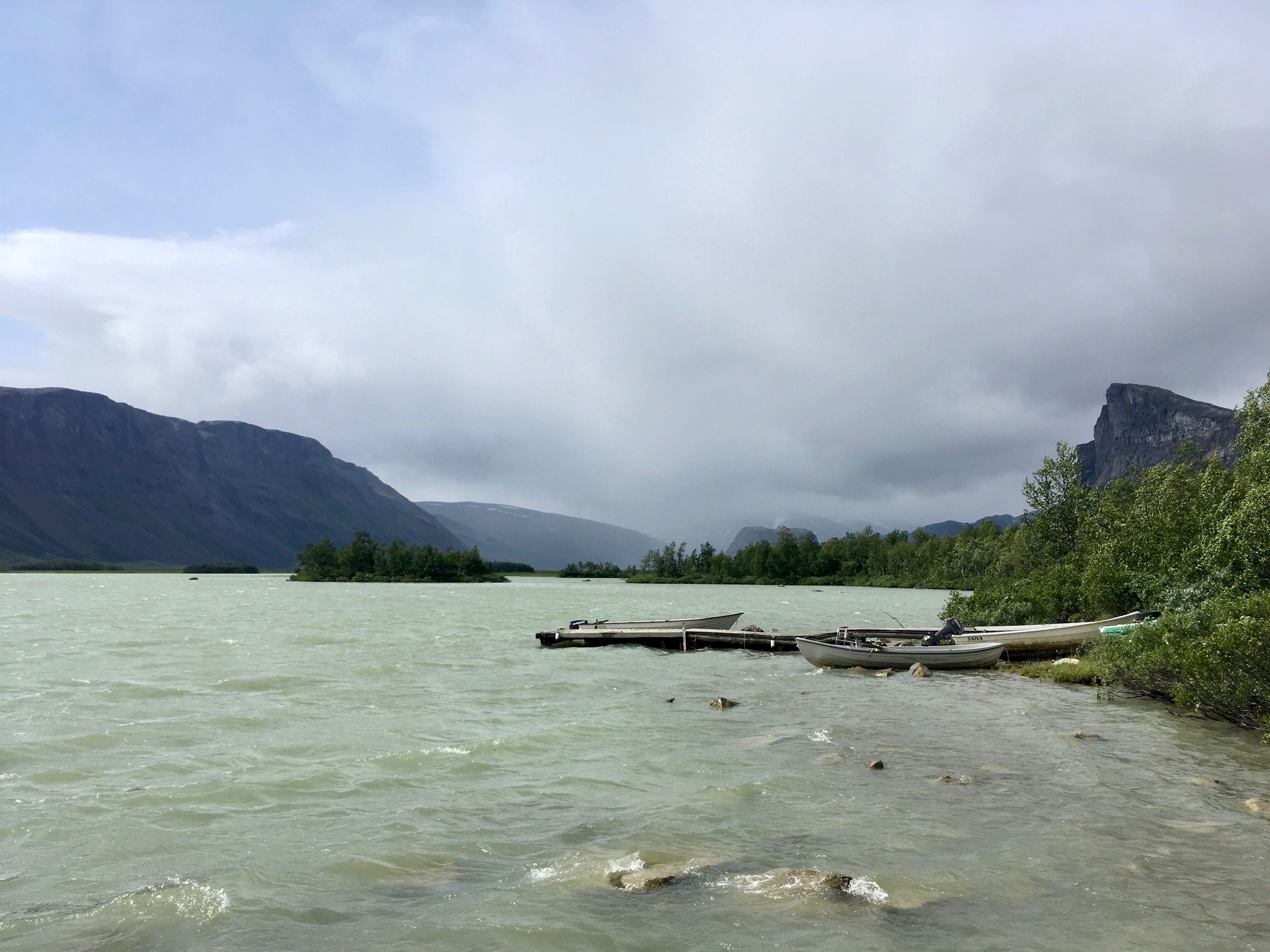 Die Sonne brannte auf mich herunter und ich stellte mir die Frage, ob ich wirklich das Wetter so vollkommen falsch eingeschätzt hatte. Hatte ich etwa zu wenig Sonnencreme dabei? Sehr froh war ich, dass ich in einem Reisebericht gelesen hatte, dass es an heissen Tagen auf der zweiten Etappe (als grosse Ausnahme!) knapp um Wasser bestellt war. Zum Glück hatte ich mir meine beiden Flaschen aufgefüllt. Meine Mittagspause machte ich im Schatten eines kleinen Felsens und war froh um das bisschen Schatten, dass er spendete. Bald danach kamen mir zwei Männer entgegen, die sich nach Wasser erkundigten. Ein wirklich heisser Tag. Um drei pausierte ich noch einmal an einem schönen Fleckchen Erde mit schöner Aussicht, denn inzwischen war mir klar, dass ich sehr gerne das Boot um 15:30, mit dem die letzten sieben Kilometer zur Alesjaurestugorna abgekürzt werden können nehmen wollte. Zuerst rechnete ich an meinem kleinen Pausenplatz aber aus, um wieviel mein Rucksack wohl schon leichter geworden war. In meinem Tour-Tagebuch steht dazu: «1x Müsli, 2x Müsliriegel, 4x Polarbröd mit Mildost, 1x Chilligryte ca. 450g? Ich merke nichts.» An der Bootsstation traf ich das ersten Mal Johanna, Lisa und Lina und Patrick. Nicht zum letzten Mal, wie sich später herausstellte. Die Bootsfahrt über den See war schön. Habe ich schon erwähnt, dass ich gerne Boot fahre? Der Mann, der das Boot fuhr, erklärte auf der recht langen Bootsfahrt viele spannende Dinge. So schien mir. Ich verstand leider nur Bruchstücke, da er schwedisch sprach. Wir waren 9 Frauen auf seinem Boot: 7 Schwedinnen, eine Amerikanerin und ich. Da war verständlich, dass er nicht unbedingt alles auf englisch sagen mochte.