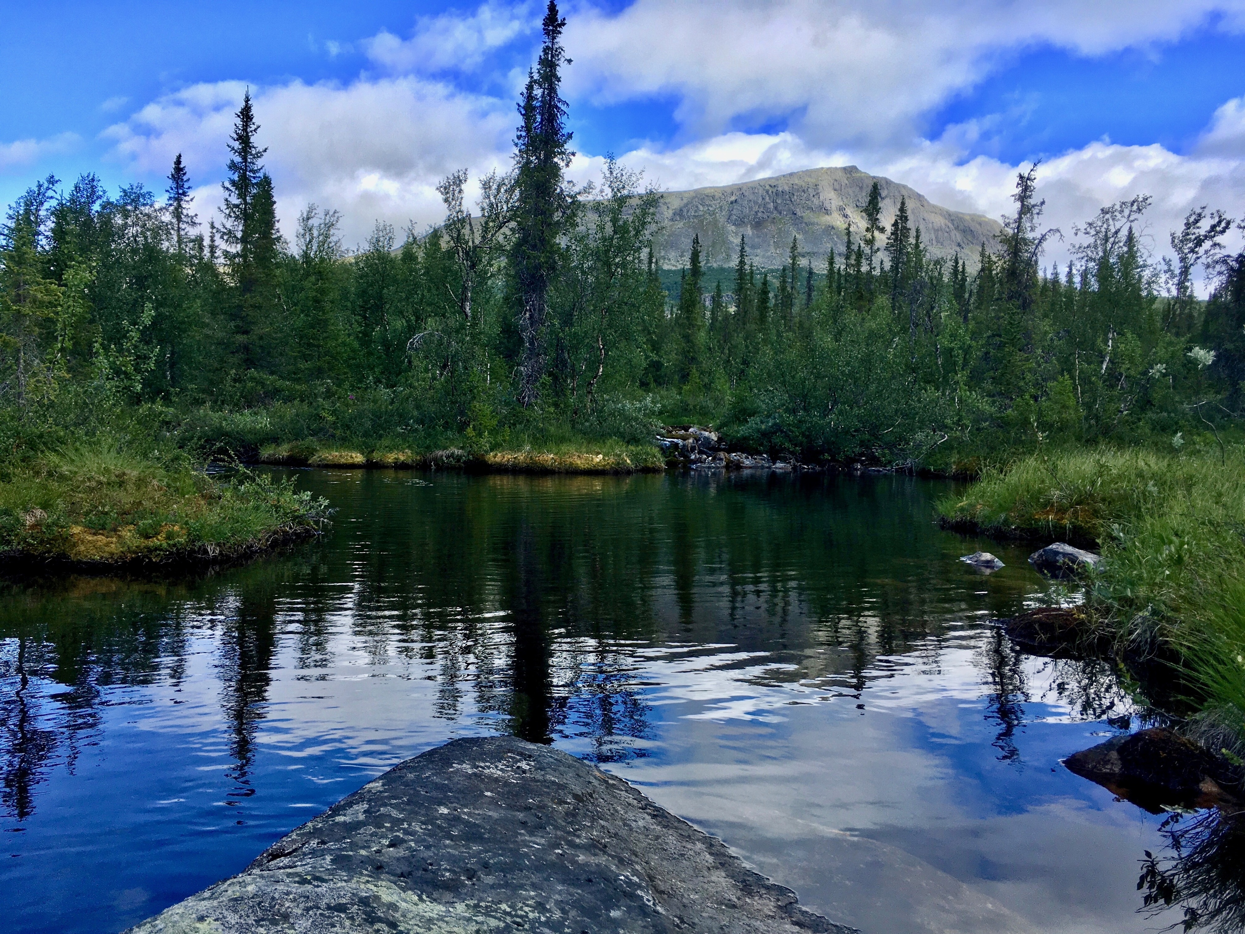 Acht Leute nahm die Bootsführerin jeweils mit und ich hatte Glück, dass im zweiten Boot noch genau für eine Person Platz war. Juhu! Es war – wie immer – viel Wind und es wurden einige Menschen auf unserer kleinen Nussschale so richtig nass. Ich verpasste ausversehen die schöne Aussicht, die es vom See Richtung Rapadalen geben soll, weil mein Sitznachbar mich in ein Gespräch verwickelte. («Where are you from?» «Germany.» «Oh! Deutschland. Ick sprekke ein bicken deutsch.» Er war die letzten Tage im Sarek unterwegs und hatte wohl einige Flüsse zu queren, die höher waren als erwartet. Nun war er ziemlich kaputt und freute sich auf zuhause.) Auch ich plante einen kurzen Tag und wollte in der Nähe der Jåge-Schutzhüte übernachten. Aber wie immer kam alles anders. Zuerst aber hiess es mal wieder bergauf marschieren. Um so höher ich kam umso stärker wurde der Wind. Es war wirklich nicht mehr angenehm. Teilweise beim Gehen über kleinere Geröllfelder, wartete ich, bis der Wind etwas nachliess und hoffte dann, dass mich keine Böe traf, während ich auf dem Feld war. Denn hier einen Ausweichschritt, damit mich der Wind nicht umpustete zu machen und den Knöchel zu verstauchen, schien mir ein nicht zu unterschätzendes Risiko zu sein. Ich beeilte mich dennoch, so gut es ging, über die Hochebene um wieder in den Windschatten des Waldes zu kommen. Somit schlug ich mein Zelt an der drittletzten Brücke vor der Pårtestugan auf. Der Wald war knallevoll mit Zelten, aber ich schaffte es mal wieder mir eine ruhige Ecke auszusuchen und hatte den Fluss für mich. Ich muss sagen, diese Etappe von Laiture nach Richtung Pårte war die langweiligste für mich. Beim Auf- und Abstieg hauptsächlich Wald und oben auf der Hochebene sah es aus wie in der Schweiz, nur ohne Kühe, Sessellift und Stadt unten im Tal, dafür mit mehr Birken und Blaubeeren. Aber landschaftlich sehr ähnlich. (Also nicht dass es in der Schweiz nicht schön wäre… Nachdem die letzten Tage ein Highlight das nächste gejagt hatte, waren wohl meine Ansprüche gestiegen.)