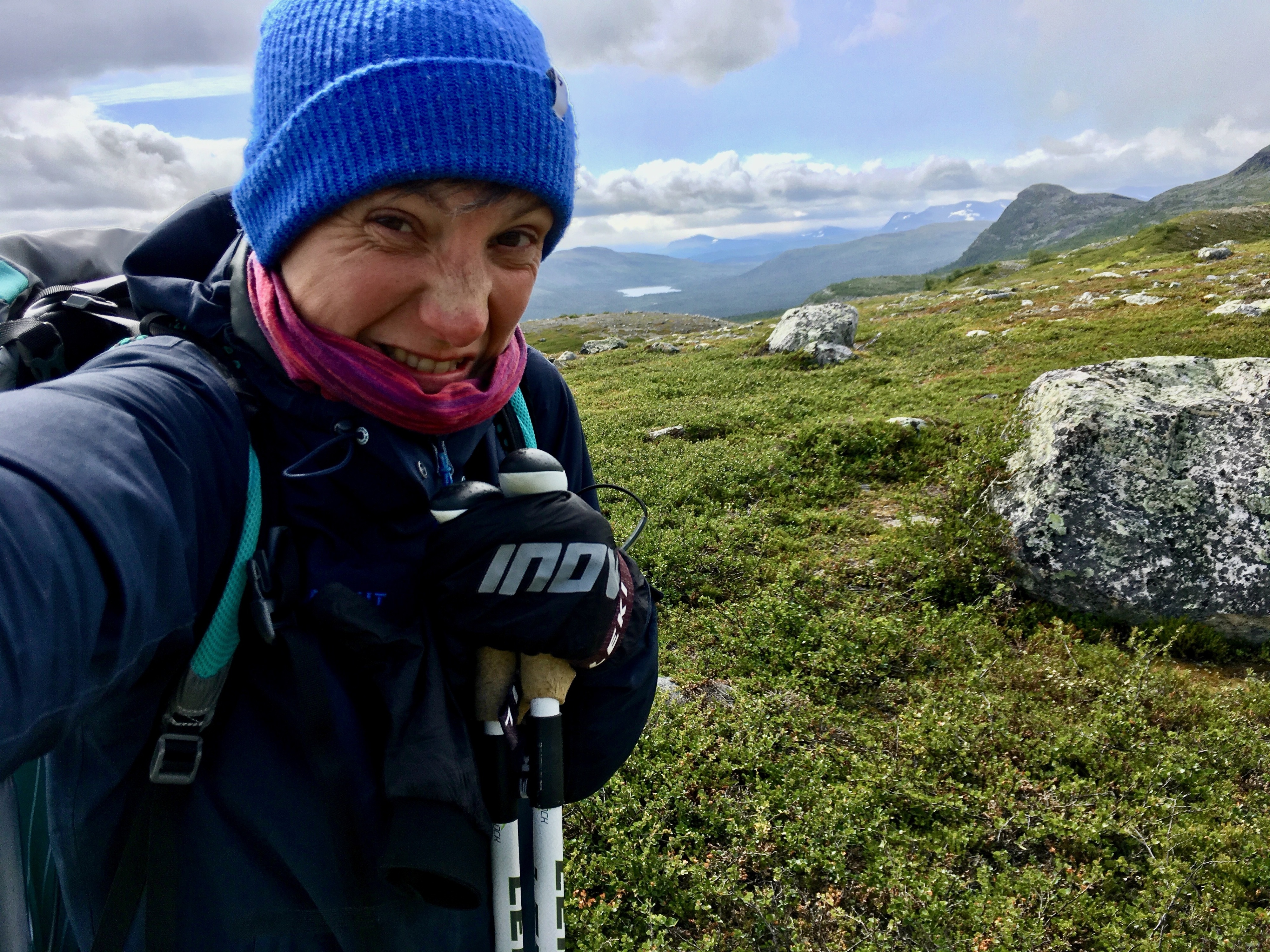 Da ich mich die ersten Tage leider sowieso etwas getrieben fühlte, als hätte ich noch Termine und müsste dringend irgendwo hin, hielt ich die Pause kurz und lief weiter. Aber wow! So schöne Ausblicke. Am Gårdenvárri vorbei mit Blick auf die Seen und Täler und den Godugalciären. Wunderschön. Irgendwann entdecke ich auf der anderen Seite einen Gletscher und glaube, dass es der Storsteinsfjellet war. Hallo! Ich freute mich einen Bekannten von vor zwei Jahren zu sehen.