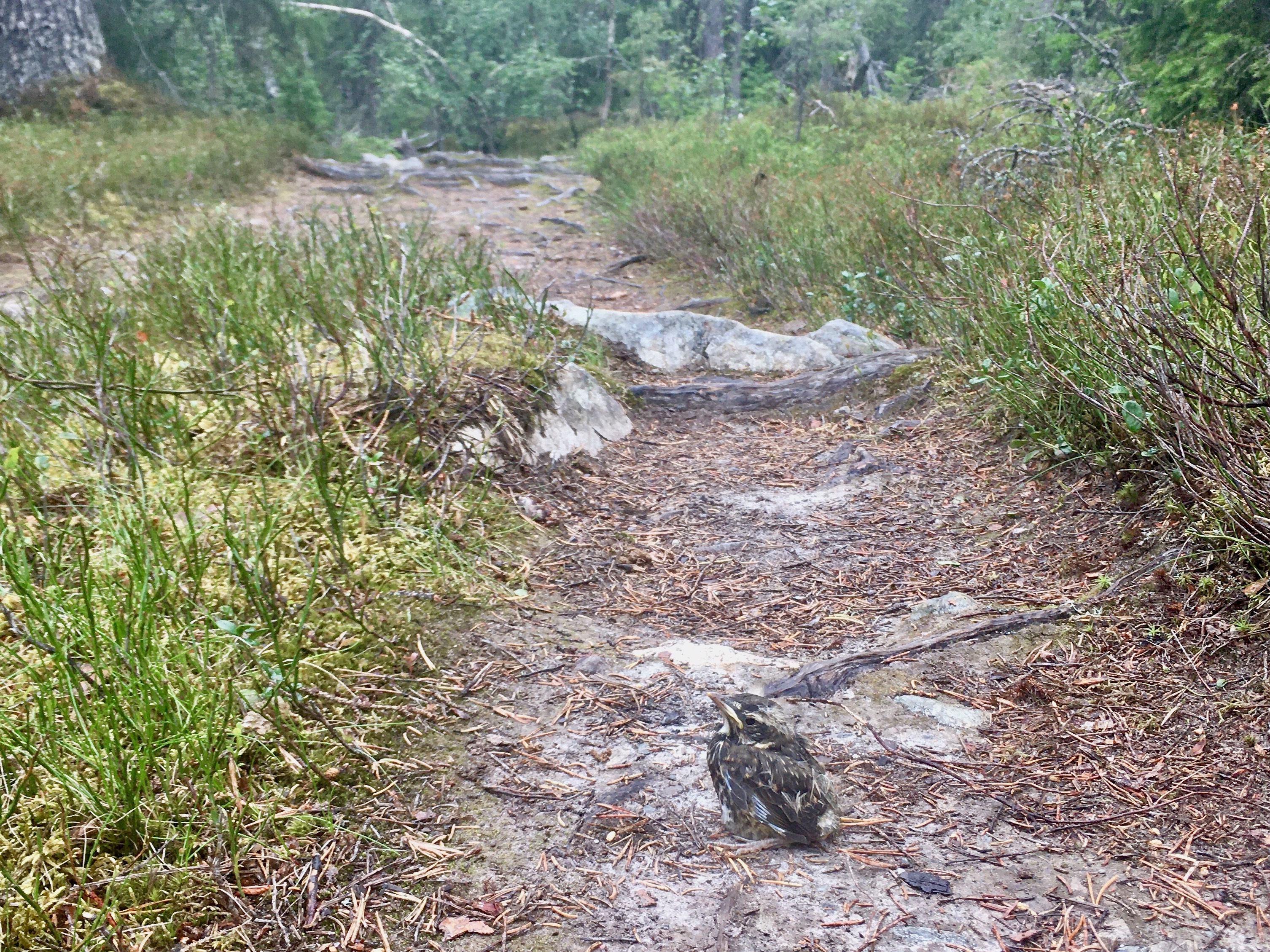 Während ich noch schimpfend/lachend/kopfschüttelnd davoneilte, stolperte ich beinahe über einen keinen Vogel, der mitten auf dem Weg sass. Ich versuchte ihn verbal zu überreden dort nicht weiter zu sitzen und hoffte, dass ihn irgendein Elternteil bald von dort wegbegleitete. Deshalb liess ich ihn dort sitzen. Die Natur wird das wohl auf irgendeine Art und Weise geregelt haben. (Falls nicht die seltsame Frau vom Klo das Schicksal des Vogels kreuzte. Vielleicht hat sie ihn aufgegessen. Wer weiss das schon…)