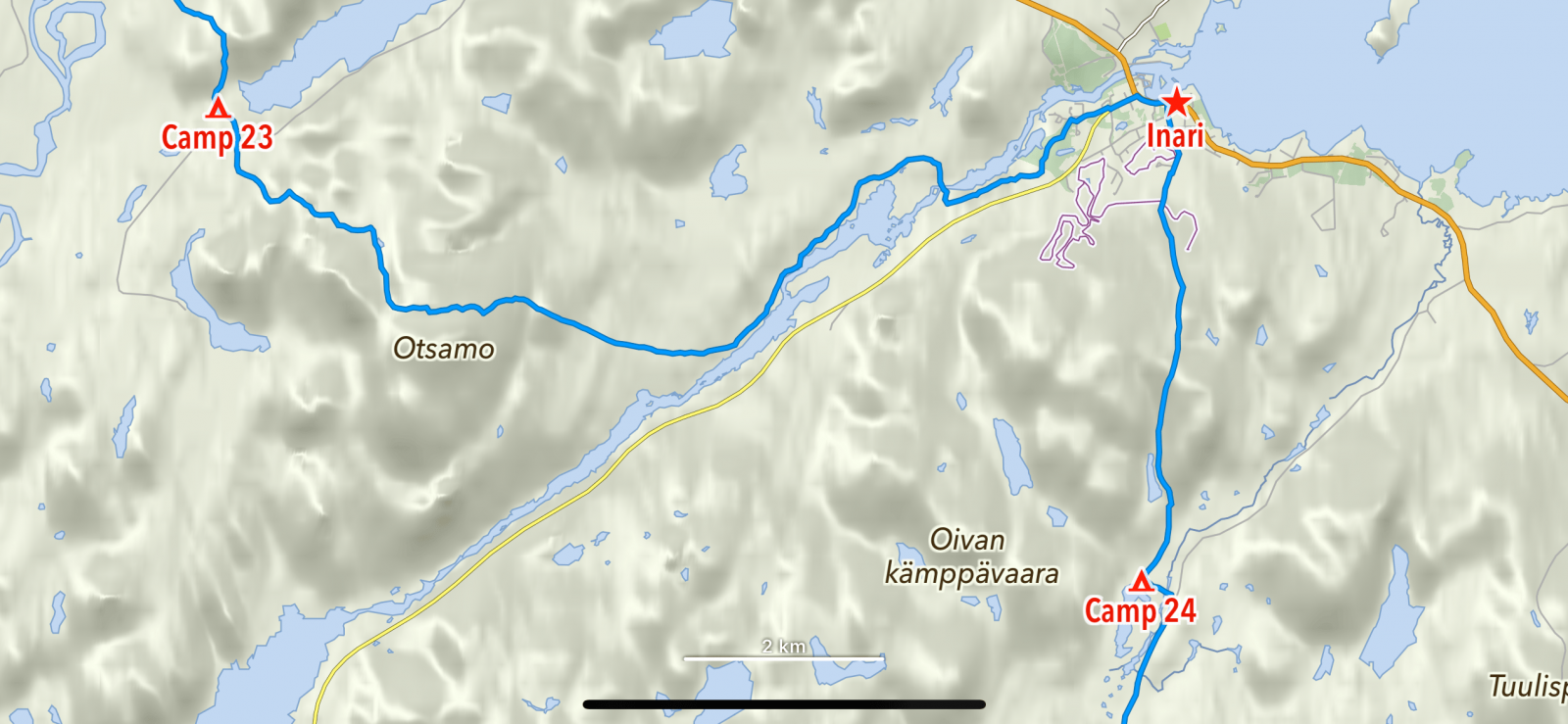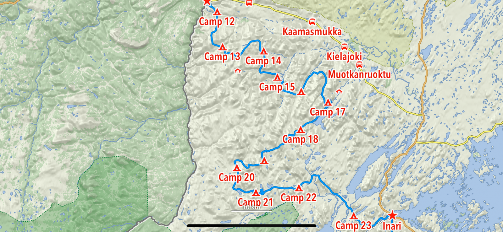 Von Utsjoki durch die Paistunturi Wilderness Area bis nach Karigasniemi, dort im Supermarkt einkaufen, dann die Muotkatunturi Wilderness Area durchqueren um in Inari nochmals einzukaufen und dann je nachdem wieviel Zeit Ich noch hätte einen kleinen Teil des Lemmenjoki National Park und (oder) die Hammastunturi Wilderness Area etwas erkunden um dann entweder bis nach Kittilä oder nach Ivalo zu wandern um von dort zurück zu fliegen. Genaueres unbekannt. Die Route würde sich schon irgendwie finden.